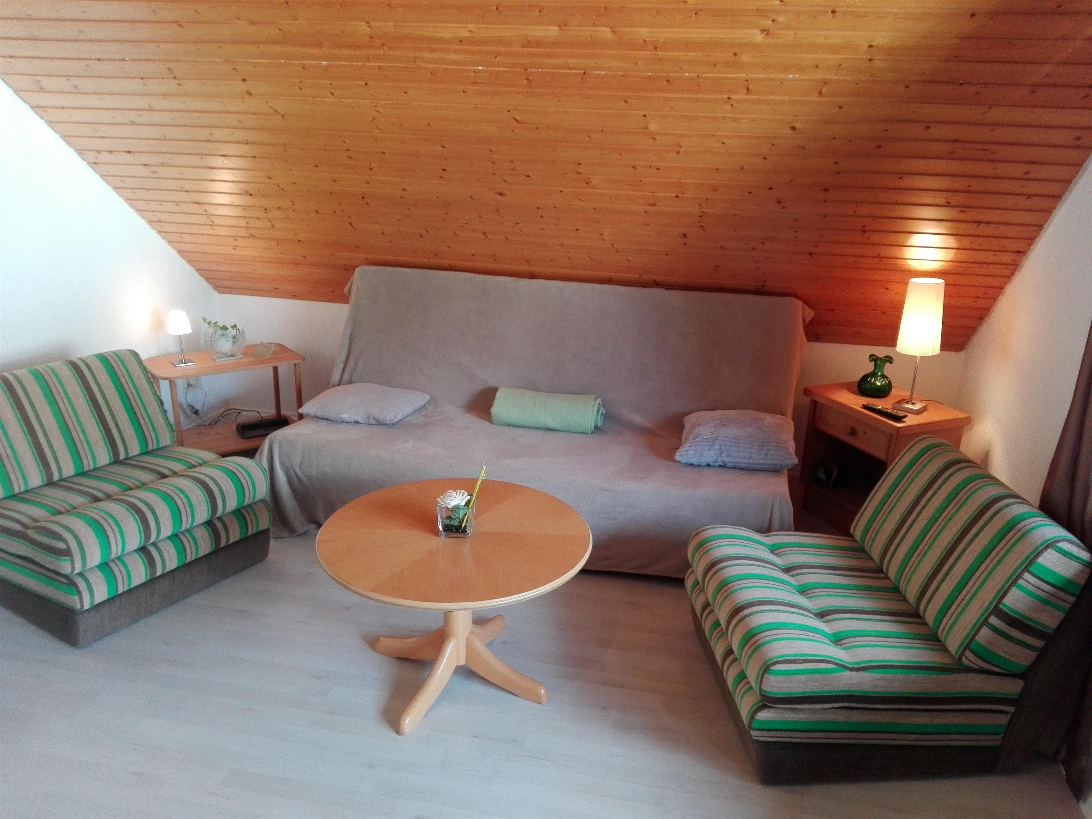 Die Wohnung ist im 2.O.G, ca 40m², im Dachgeschoss. Sie ist schlicht eingerichtet und ideal für 2 Personen. Mit dem Schlafsofa und den ausklappbaren Sessel können maximal 4 beherbergt werden, wenn es den Ansprüchen noch genügt.