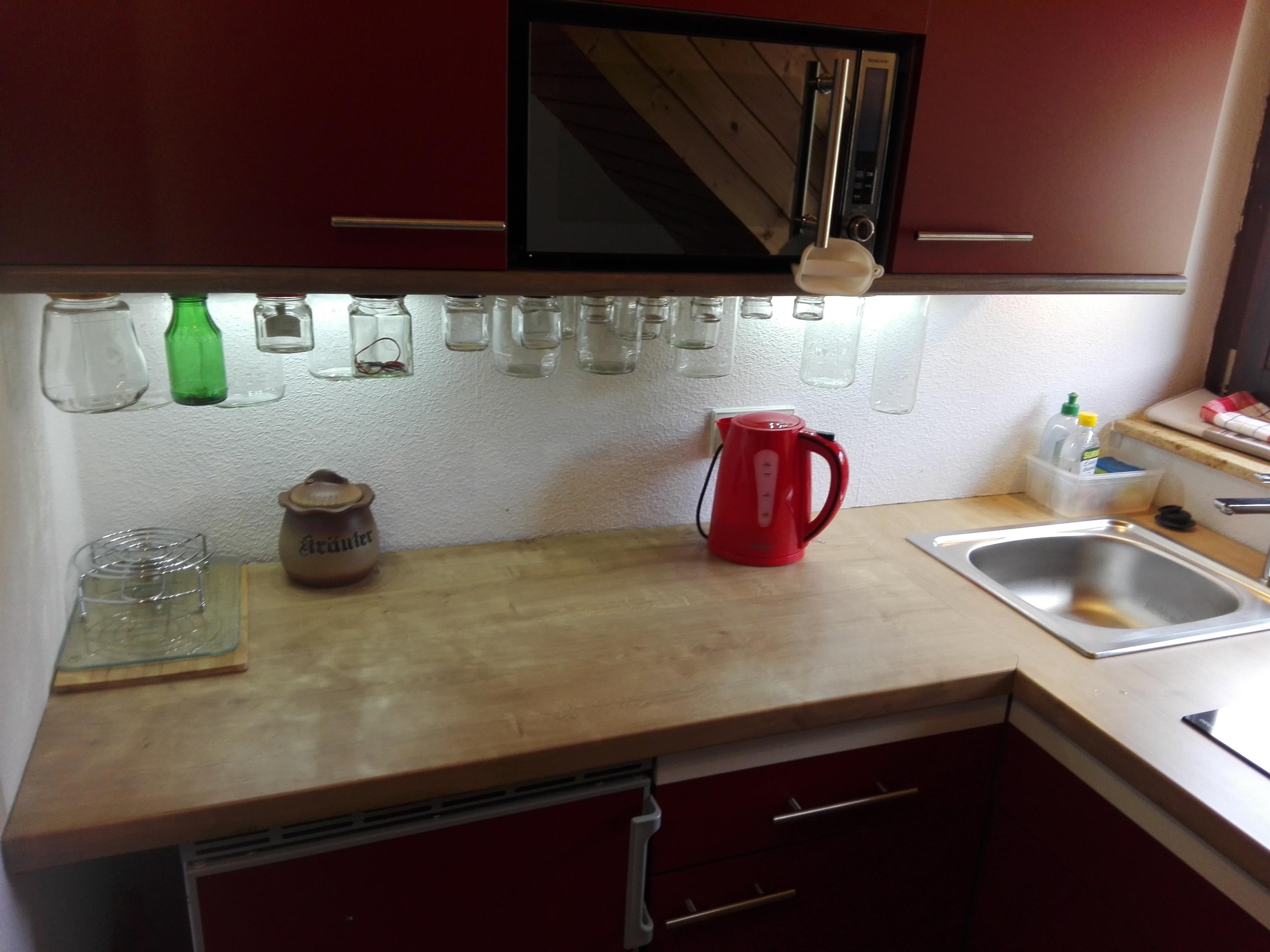 Küche: Induktionsherd, Mikrowelle-Ofenkombination, Filterkafeemaschine, Geschirrspüler, Waschmaschine (kein maschineller Trockner da, sondern Wäscheständer), Wasserkocher, Kühlschrank, kleiner Tisch mit zwei Barhockern