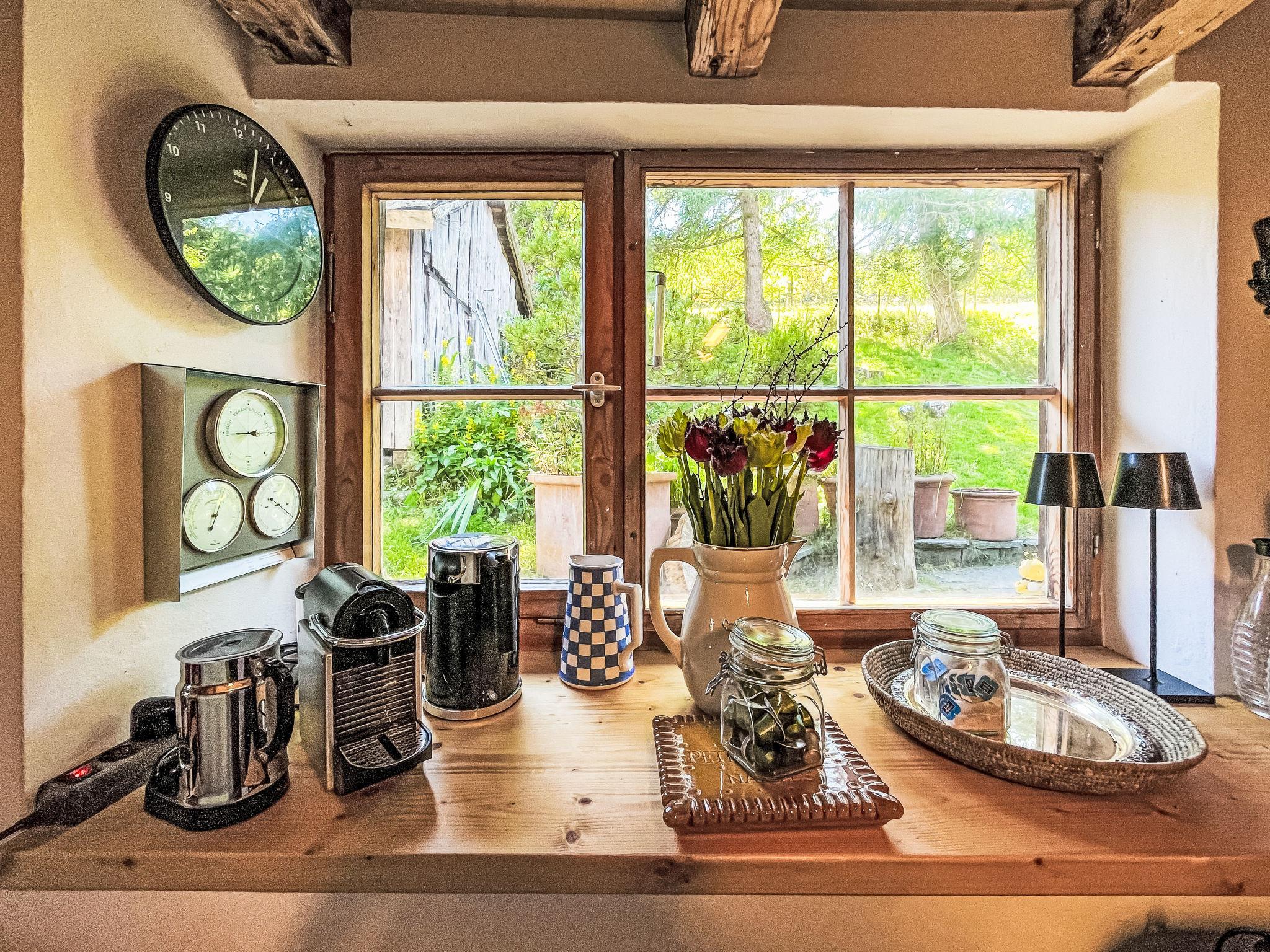 5-room house 130 m2. Partly with sloping ceilings, very cosy and wooden furniture furnishings: living/dining room, ceiling height 180 - 220 cm, Low door height 180 cm with dining table. Large, open kitchen (4 induction hot plates, toaster, kettle, cooking island). Bath/shower/WC. Heating. Upper floor: (steep stair) walk-through room, ceiling height 180 - 190 cm. 1 small children's room with 1 x 2 bunk beds (90 cm, length 200 cm). 1 double bedroom with 1 double bed (2 x 90 cm, length 200 cm). 1 double bedroom with 1 double bed (2 x 90 cm, length 200 cm).