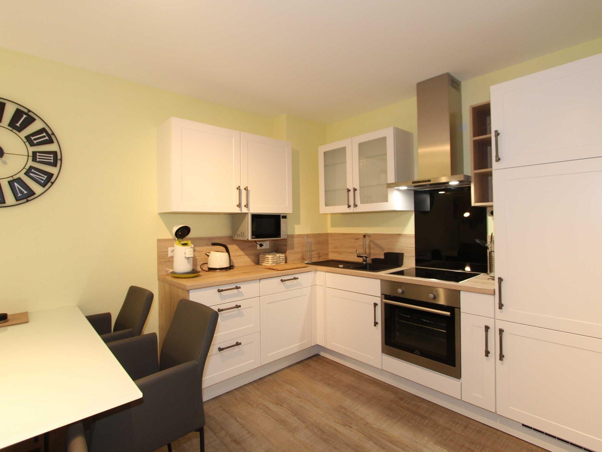 Die Wohnungsgrösse beträgt ca. 75 m². Großzügiger offener Küche-/Ess-/Wohnbereich. Voll ausgestattete moderne Küche mit Ofen, Induktionsherd und Spülmaschine. Glasesstisch mit gemütlichen Lehnenstühlen.