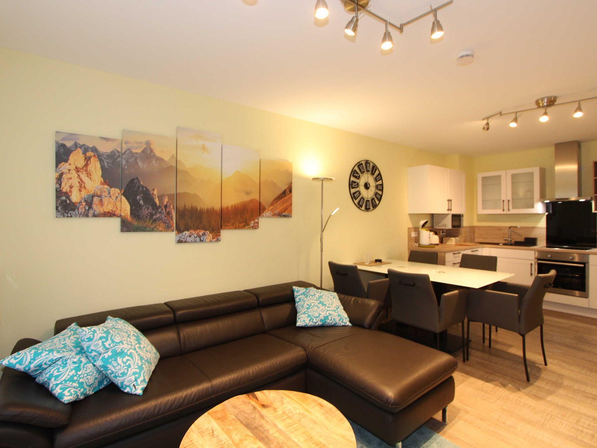 Das Wohnzimmer ist mit einer Leder-Eckcouch und einem 50 SAT-Flachbildfernseher (inkl. sky Fussball) und einer Bluetooth/Internetradio Musikanlage ausgestattet. Vom Wohnzimmer aus gelangen Sie auf den großzügigen Balkon mit Tisch und Stühlen.