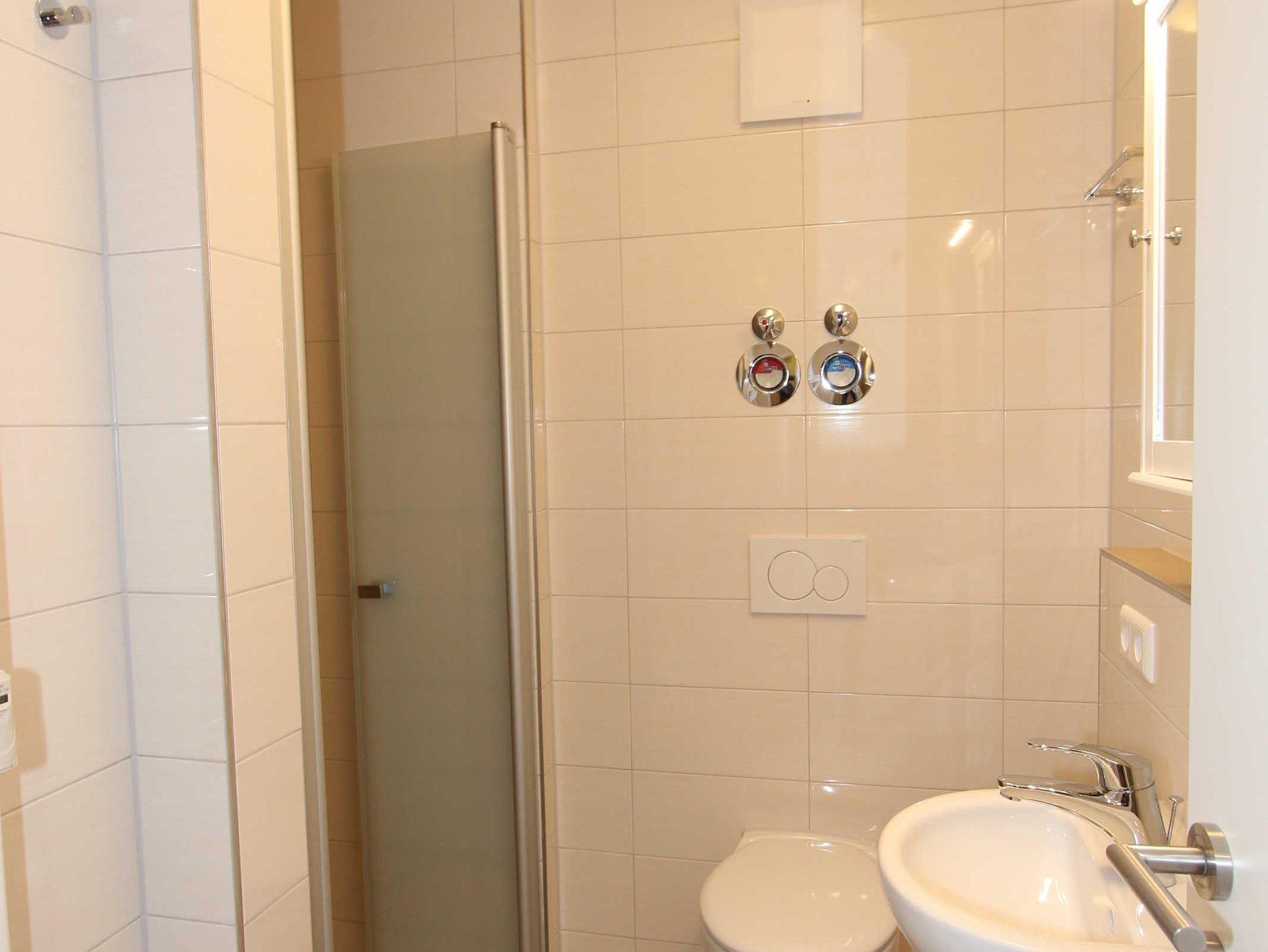 Zu jedem Schlafzimmer gehört ein eigenes Badezimmer. Ein Badezimmer verfügt über Toilette, Waschbecken und eine ebenerdige, große Dusche. Das zweite sehr geräumige Badezimmer verfügt über Toilette, Waschbecken, Whirlpool-Badewanne und eine Infrarotsauna für bis zu 3 Personen. Die Infrarotsauna bietet mit eingebautem Stimmungslicht und Lautsprecheranlage (Bluetooth, USB, Aux) volle Ausstattung.