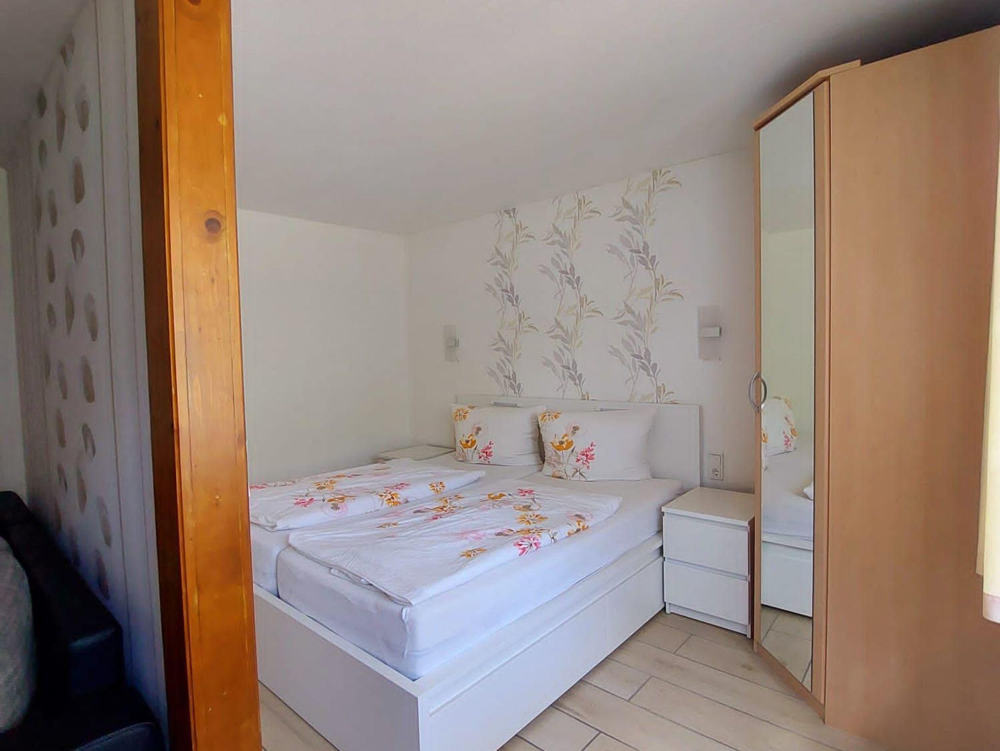 Zur Wohnung gehört eine komplett eingerichtete Küche, Wohnraum mit abgetrenntem Schlafraum, einem separaten Schlafraum und DU/WC. Vor der Ferienwohnung befindet sich eine überdachte Terrasse mit Gartenmöbeln und Liegewiese.