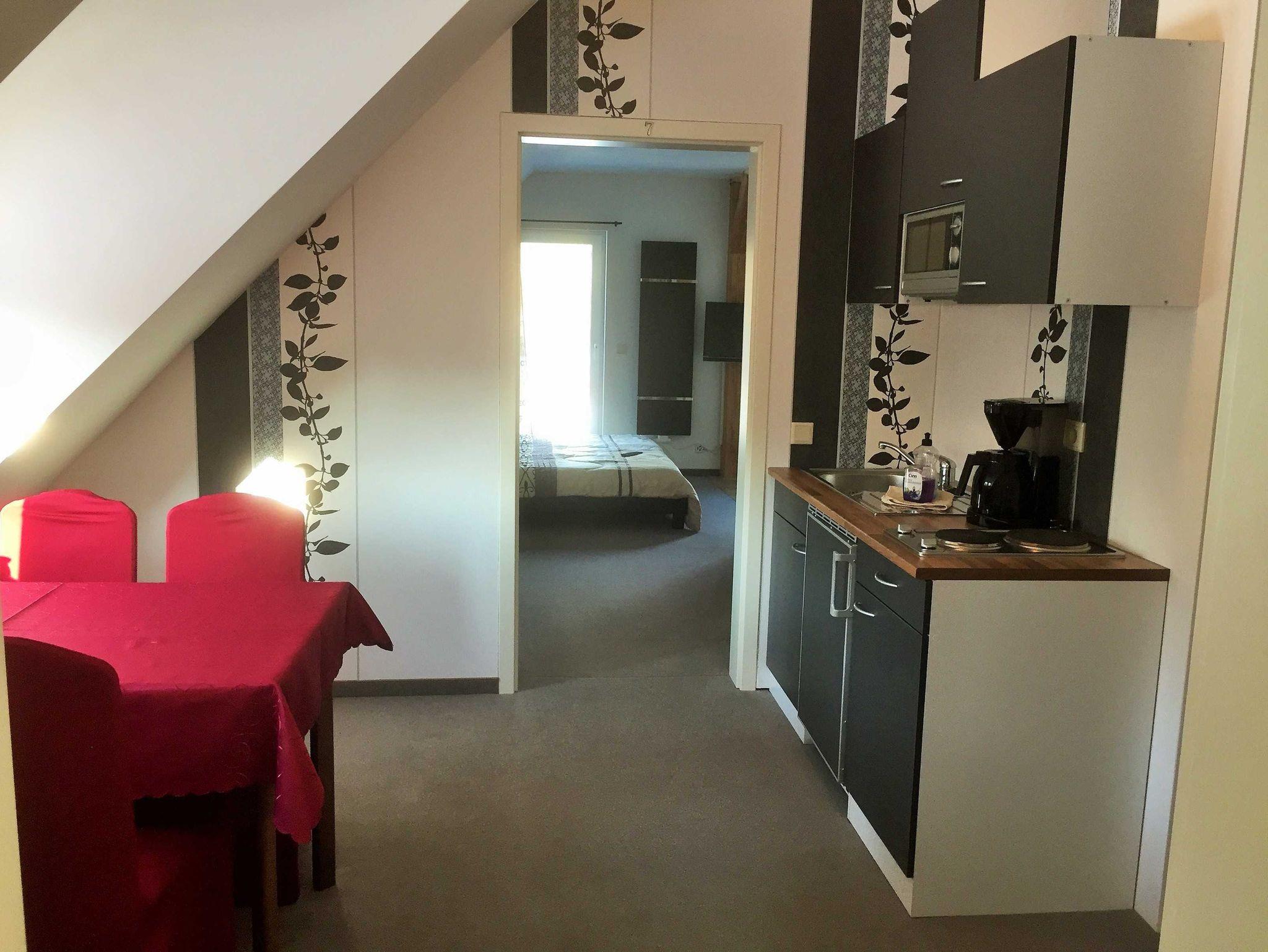 Die Ferienwohnung liegt im Dachgeschoss und bietet mit den zwei Doppelzimmern eine perfekte Lösung zum reisen mit Freunden. In jedem Doppelzimmer ist der Spitzboden mit je 2 weiteren Schlafmöglichkeiten (Aufbettung) versehen, welche über eine Leiter erreichbar sind (geeignet für Kinder ab 12 Jahren / Benutzung auf eigene Gefahr). Die Küche befindet sich in der goldenen Mitte und ist mit Kühlschrank, zweiflammigen Herd, Mikrowelle ausgestattet. Der großzügige Balkon lädt zum relaxen ein.