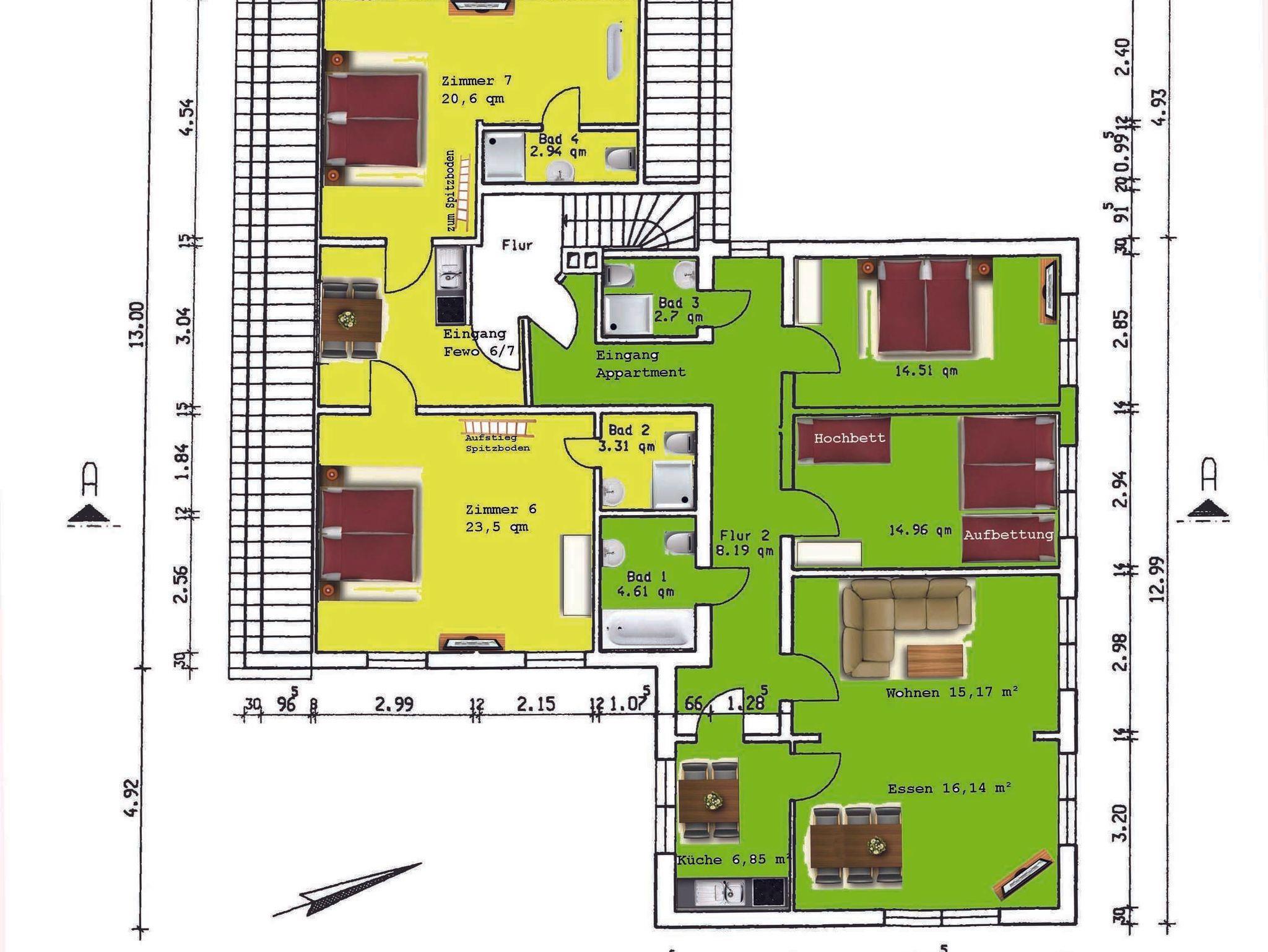 Dachgeschoss: Appartment für bis zu 8 Personen, Fewo DG bis 8 P, Erdgeschoss: Fewo 1 für 4 P, Zimmer 2 für 2 P, Zimmer 3 für 2+1 P, Zimmer 4 für 1+1P