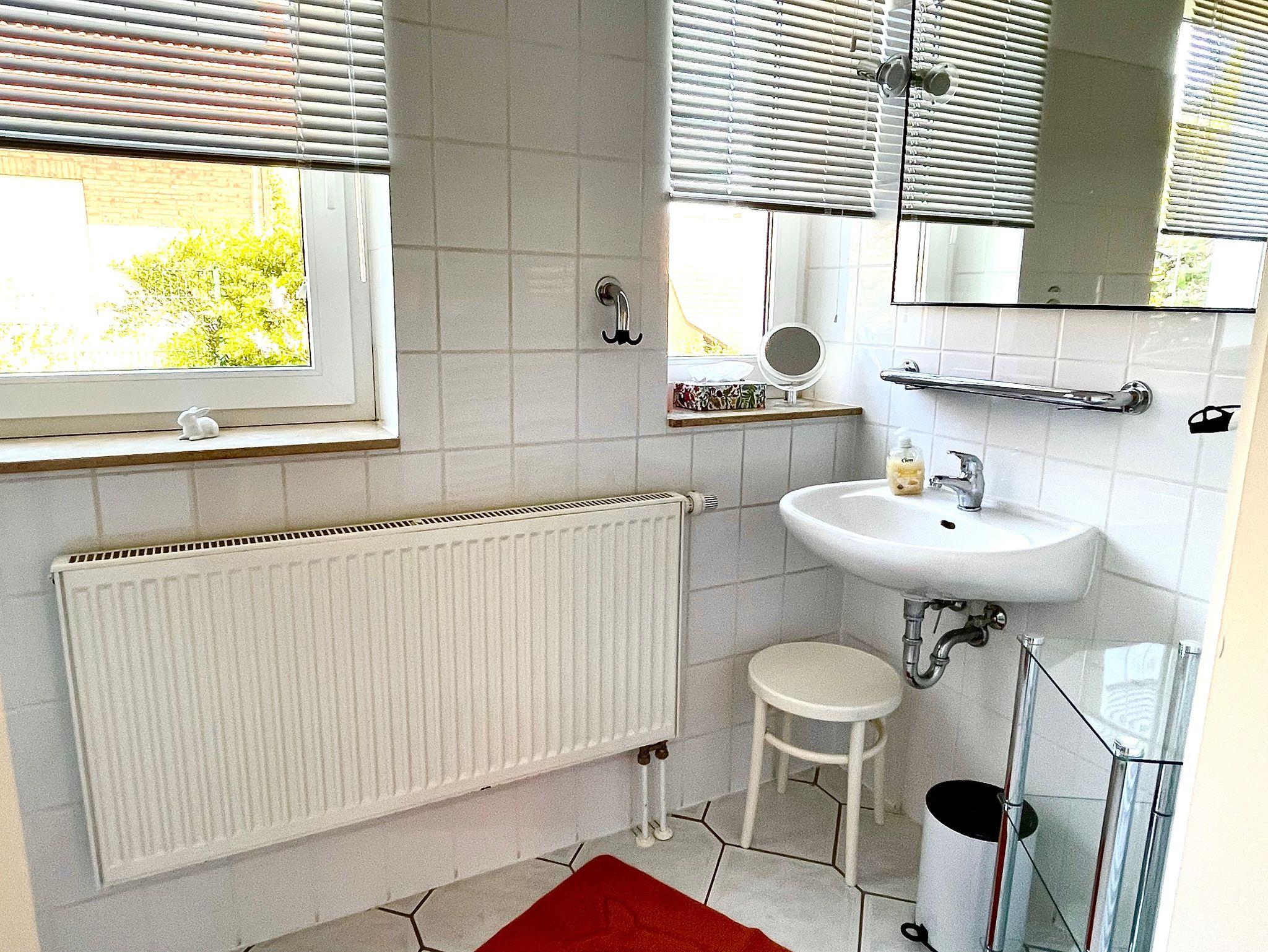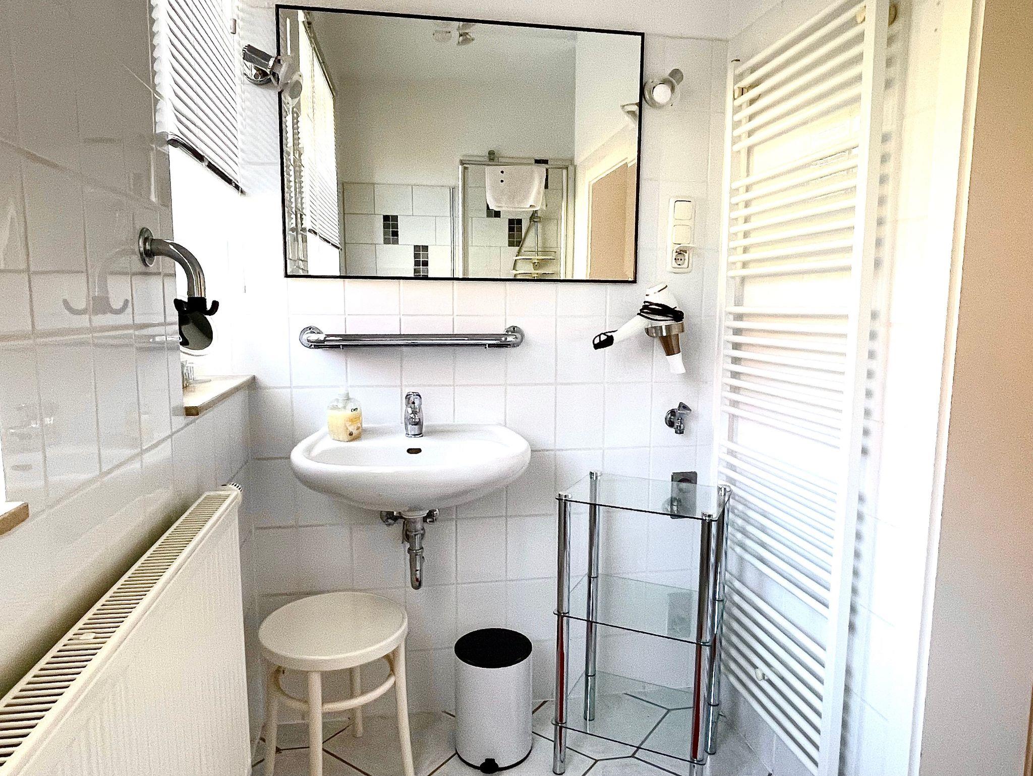 Das Bad ist frisch renoviert mit einer ebenerdigen, modernen Dusche.