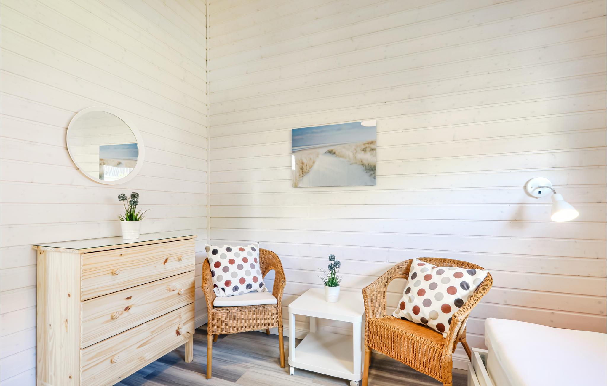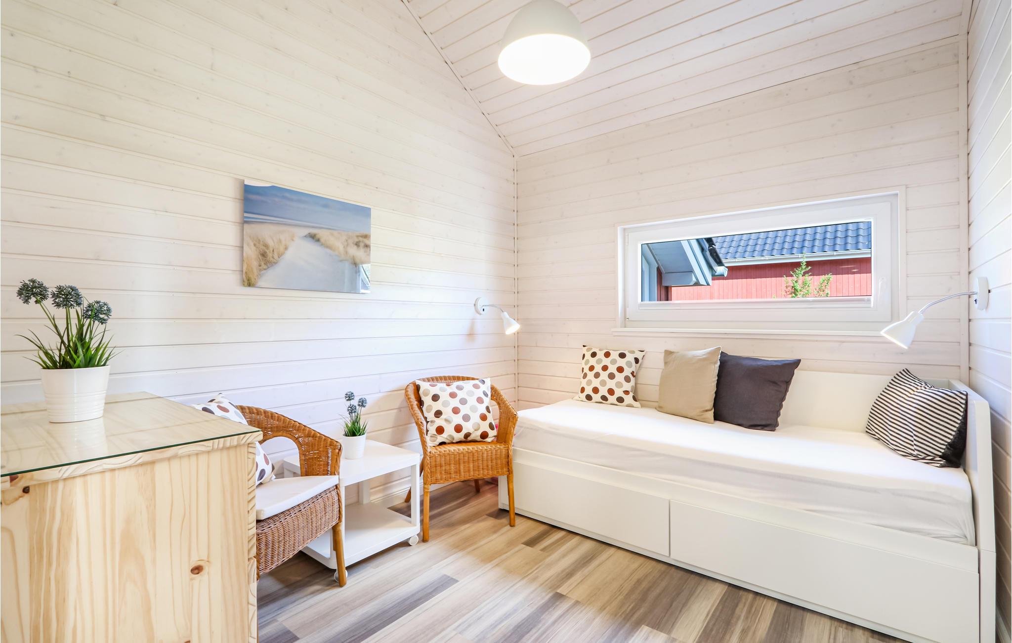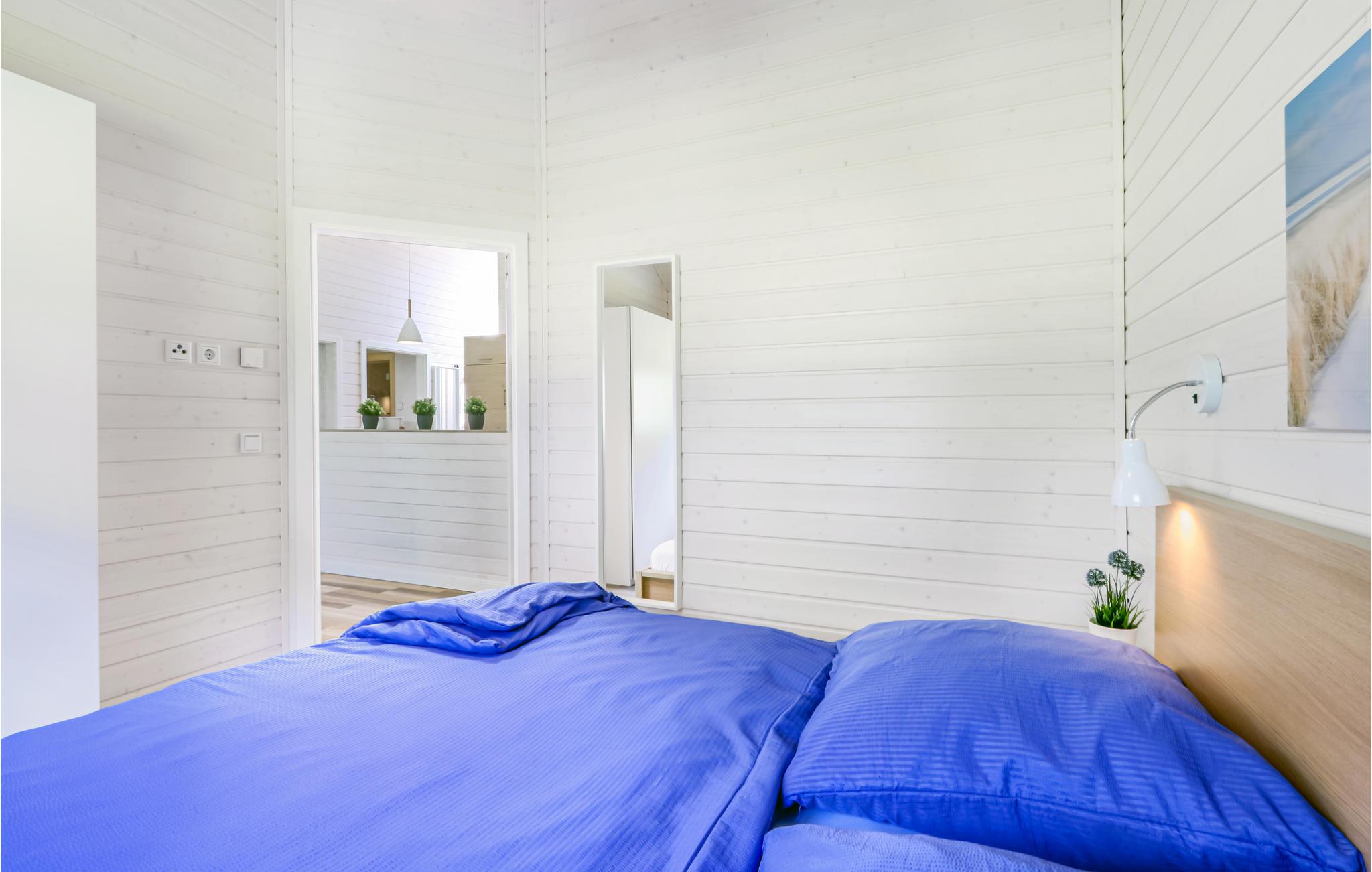 Dette moderne feriehus af træ 'Seezauber' giver god plads til op til otte voksne. Her er loft til kip og store vinduer, der giver en rummelig og lys atmodsfære. Den maritime indretning i lyse farver bidrager også til den hyggelige stemning.