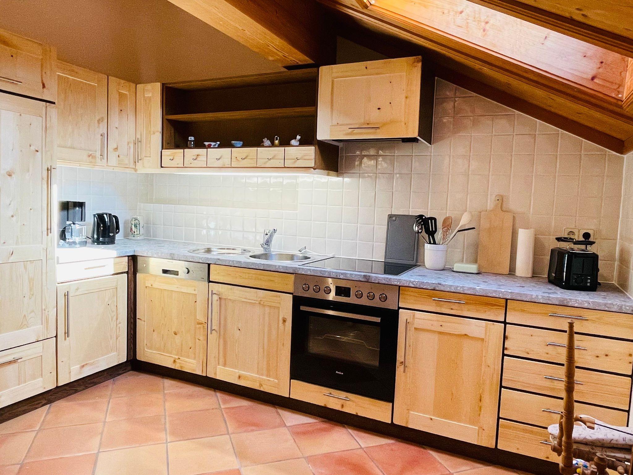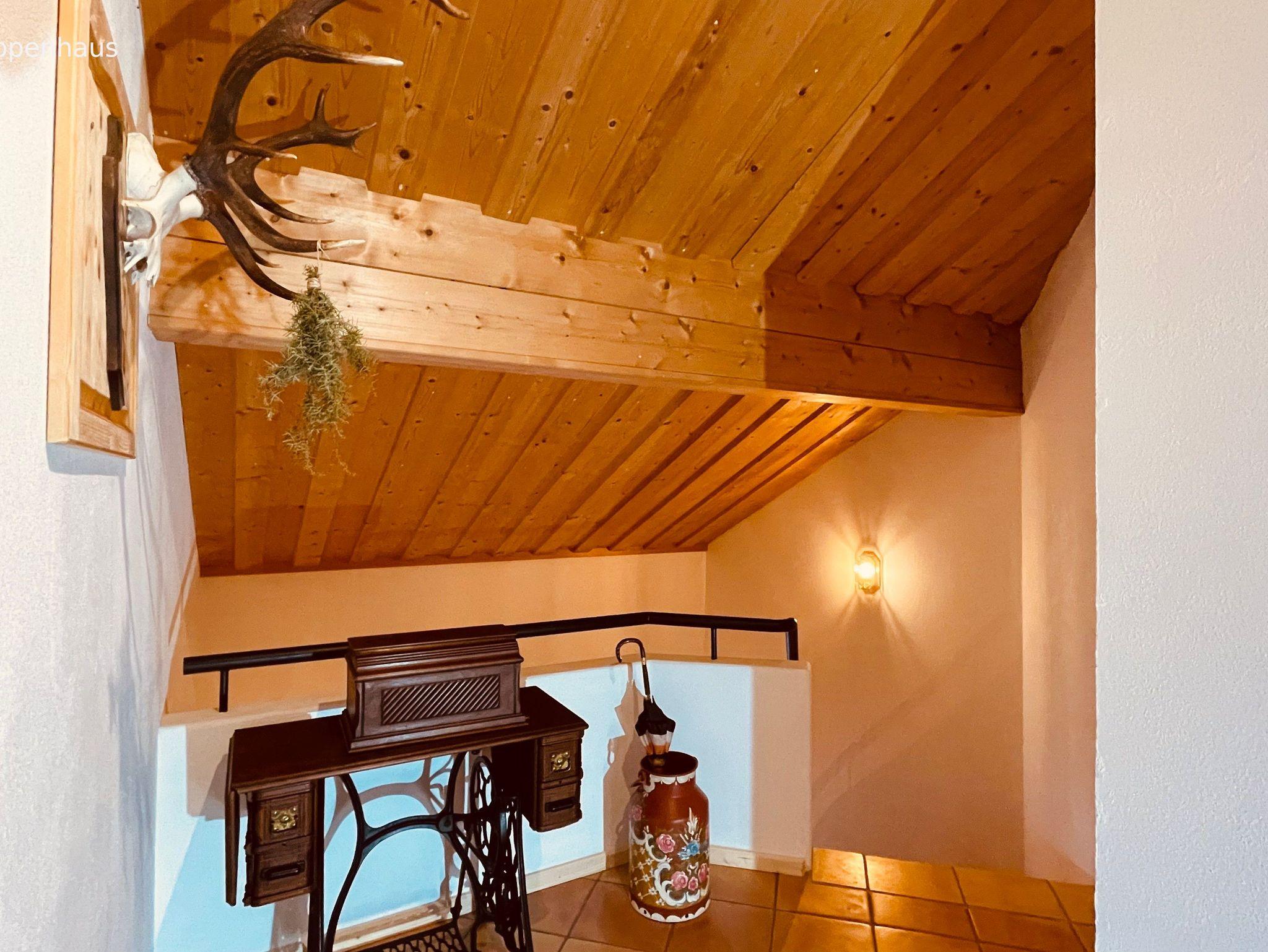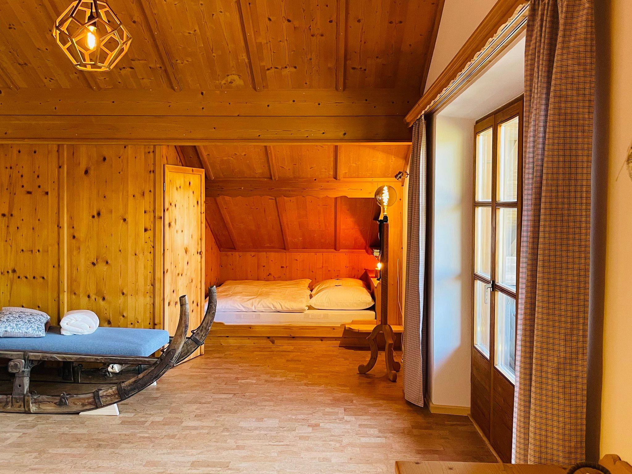 Hochwertige Ausstattung (Naturholzausbau), ruhige Lage, Westbalkon mit Berg-, Bach- und Talblick, Nichtraucherwohnung, Fußbodenheizung, Terracotta- Kork- und Fliesenboden, spaltenfreies Bett der Größe 180 x 200 cm, antiker Hornschlitten als zusätzliches Ruhemöbel.