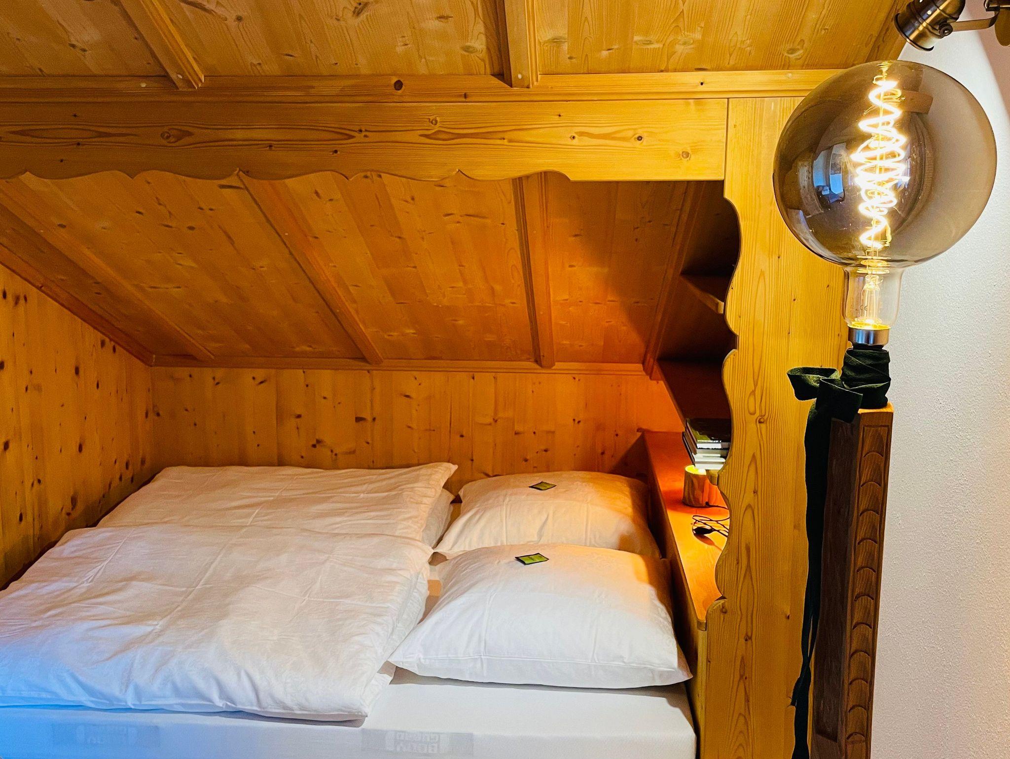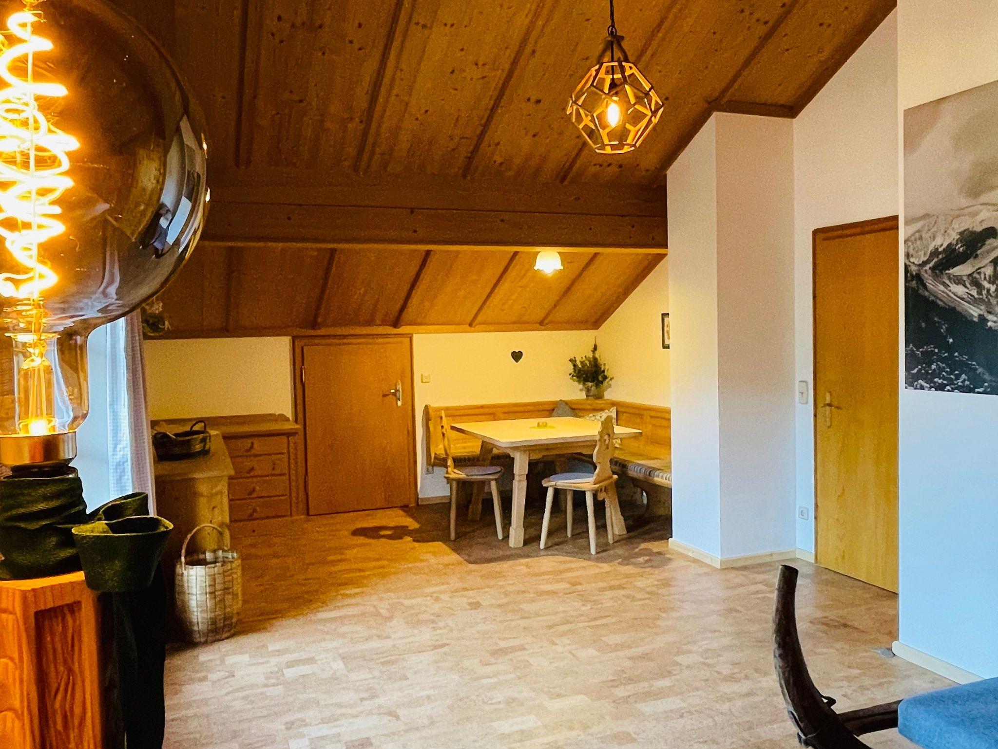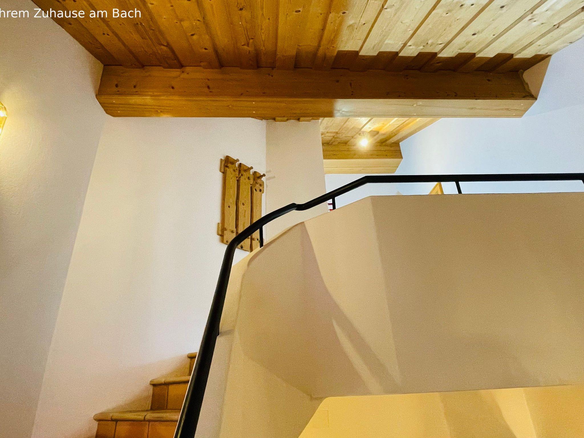 Hochwertige Ausstattung (Naturholzausbau), ruhige Lage, Westbalkon mit Berg-, Bach- und Talblick, Nichtraucherwohnung, Fußbodenheizung, Terracotta- Kork- und Fliesenboden, spaltenfreies Bett der Größe 180 x 200 cm, antiker Hornschlitten als zusätzliches Ruhemöbel.