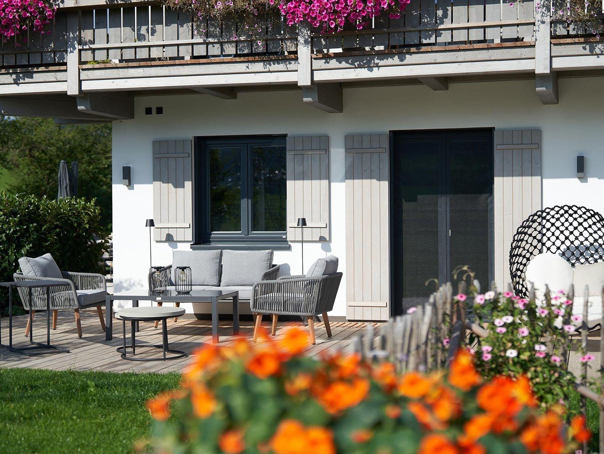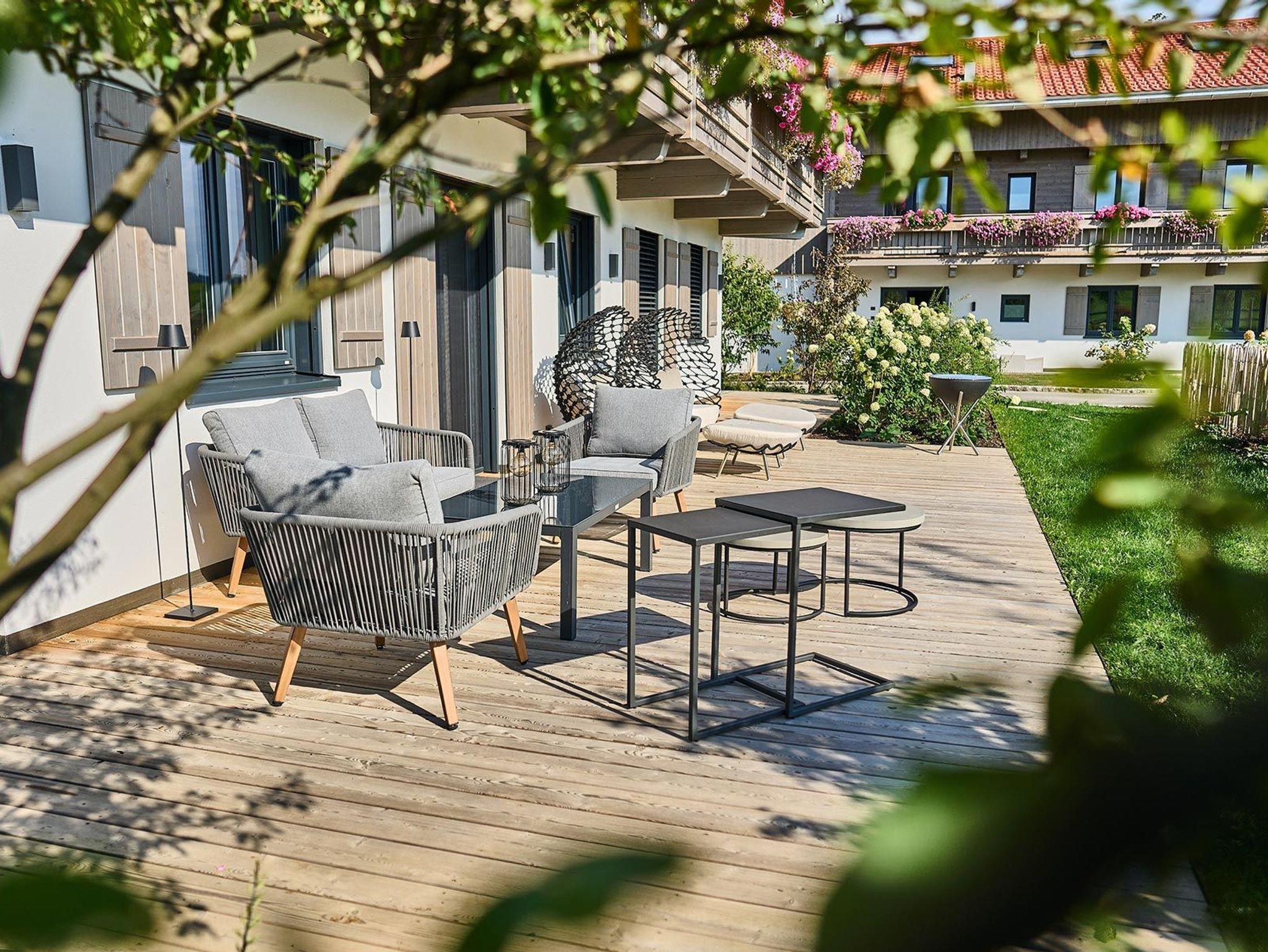 -Der große Gemeinschaftsgarten mit Liegestühlen, Tisch und Bänken sowie einer Outdoor-Lounge mit Panoramablick und Grill steht allen Gästen offen.