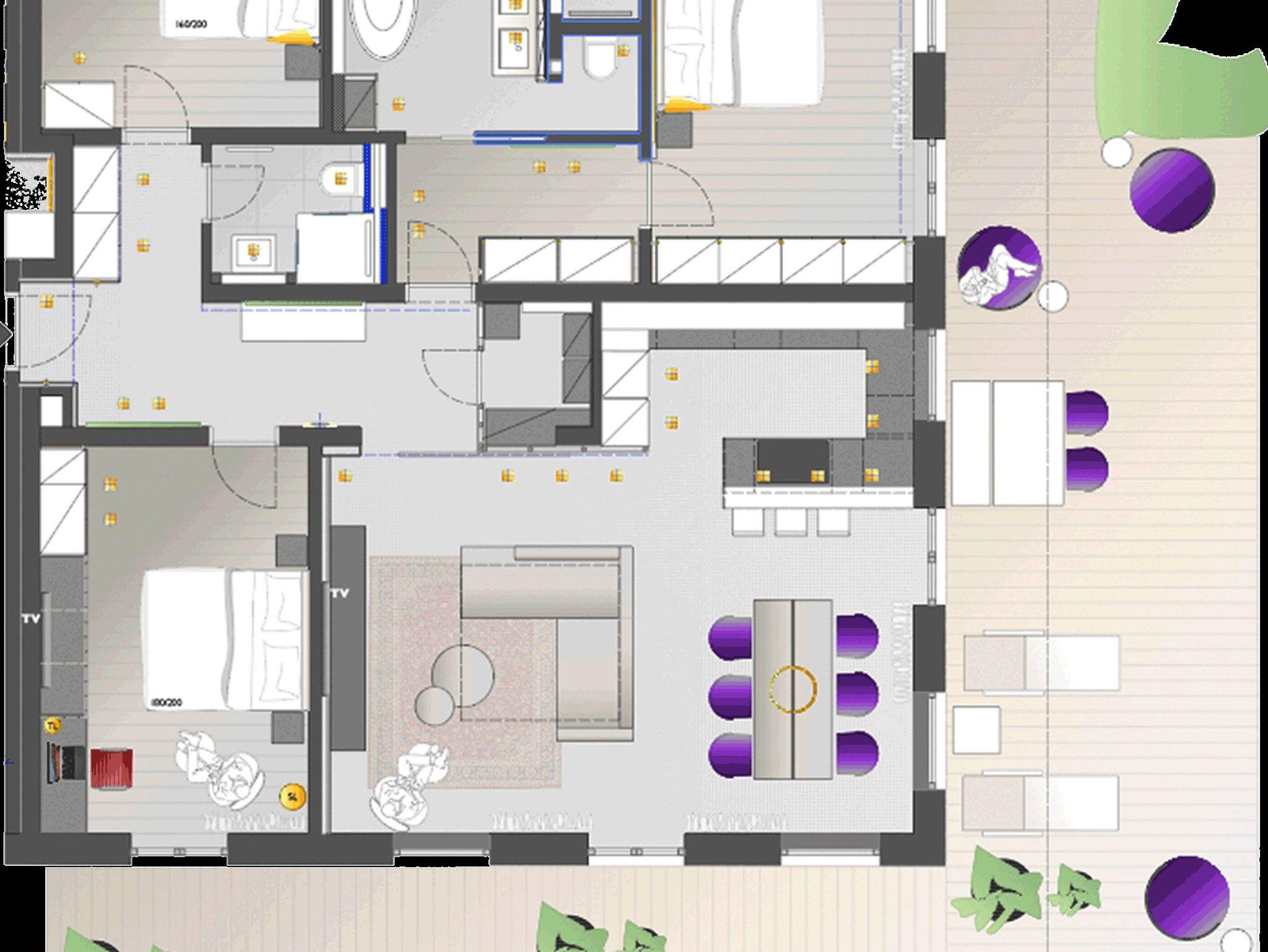 Erdgeschoss, 3 Schlafzimmer mit Doppelbetten (2x180x200 und 1x160x200), 1 Bad mit Dusche und Badewanne, zusätzl. Duschbad, 1 Wohnraum mit Küche und Schlafcouch, Terrasse, Panoramablick, Grill, Weinkühlschrank in der Küche, Terrasse mit Grill, Insektenschutz an Fenstern elektrisch