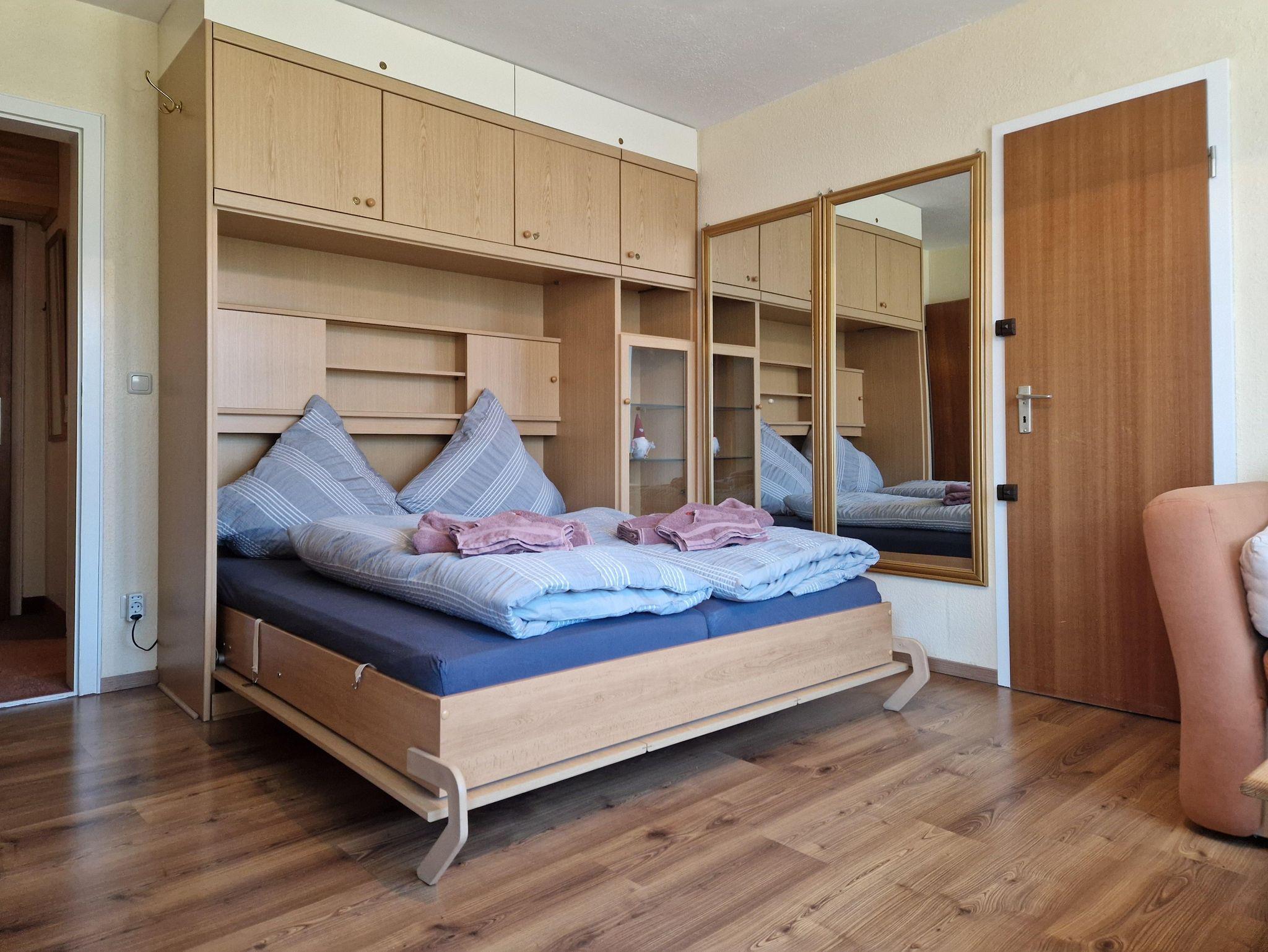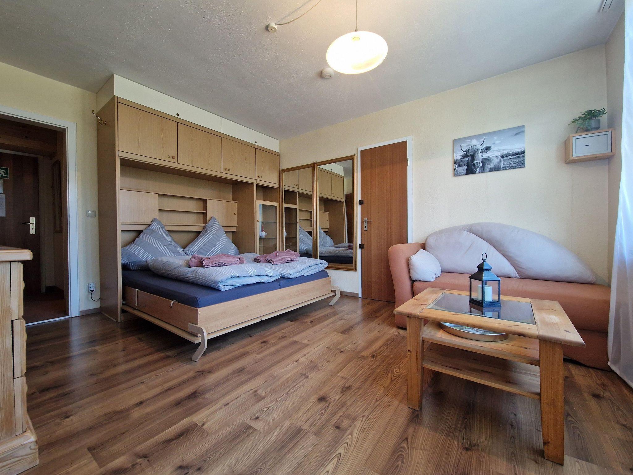 Wohn/Schlafraum mit Schrankbett, seperater Küche mit Essecke, Bad (DU/WC), Flur, Balkon (Blick auf Rubi-/Nebelhorn), Kabel-TV, Miniofen.
