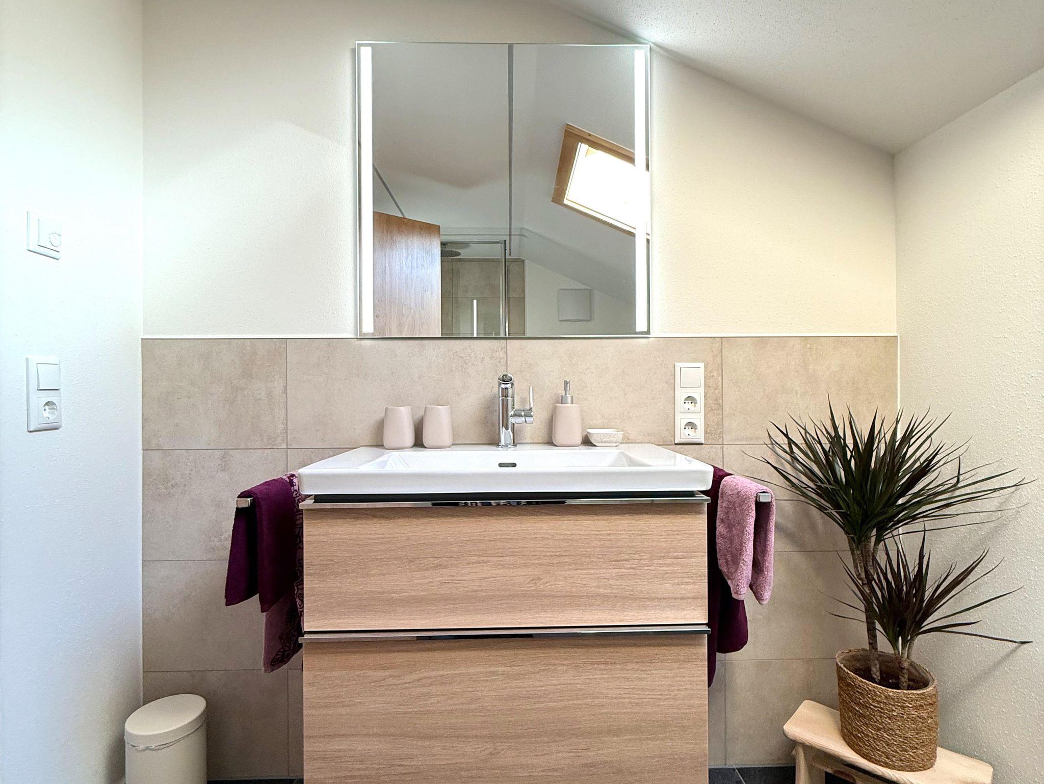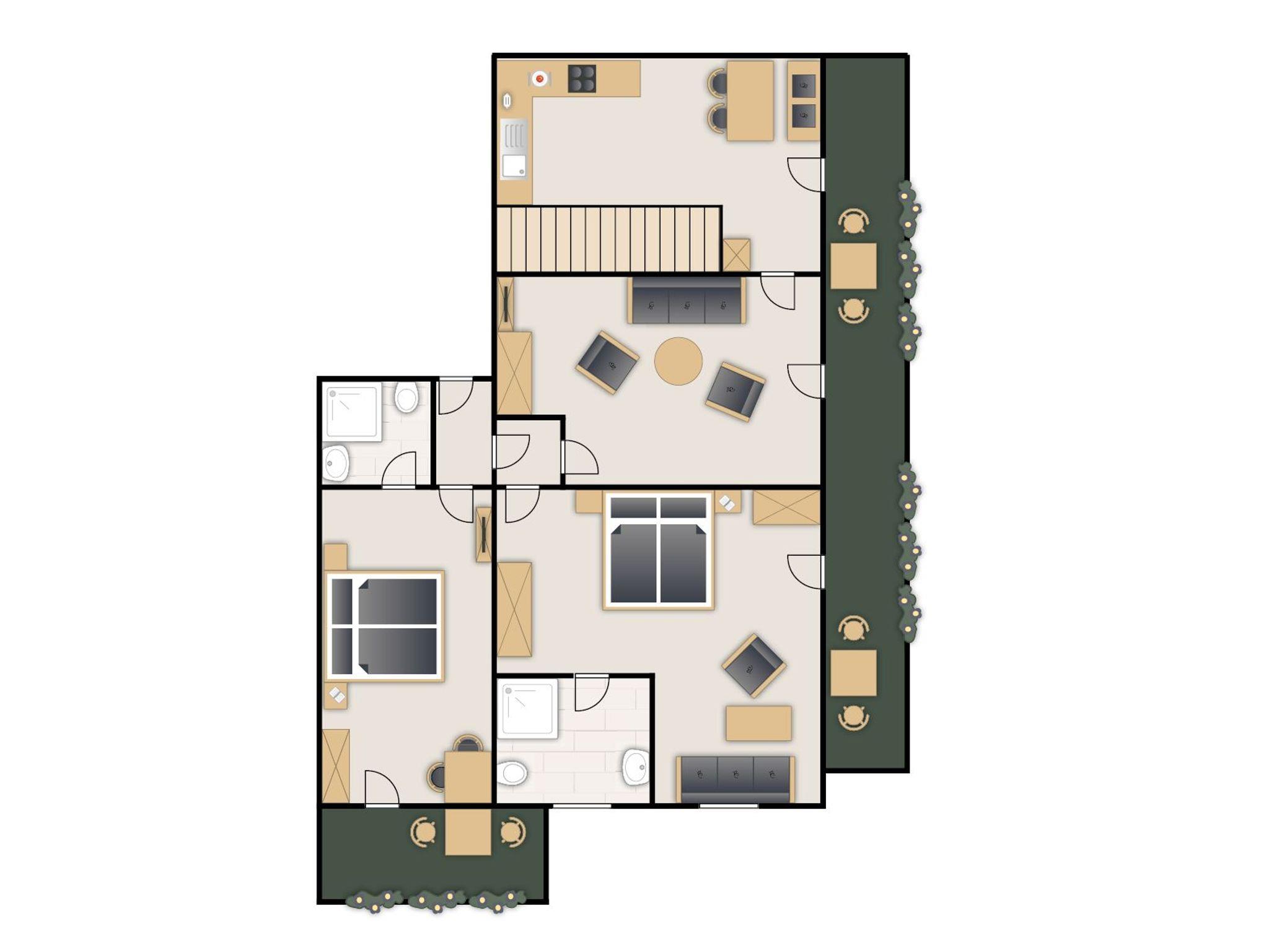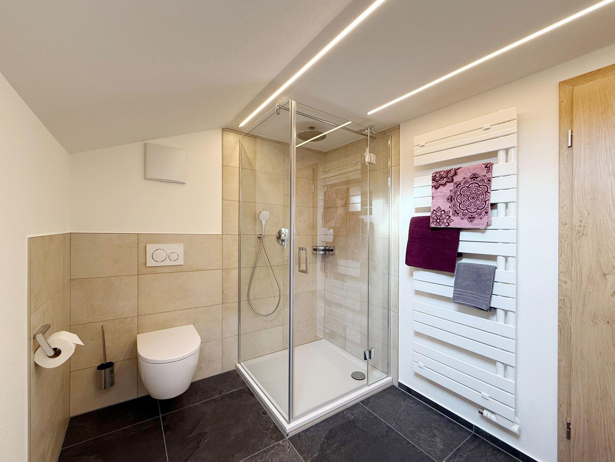 Die Ferienwohnung Frauenschuh liegt im 1. Stock auf der Süd- und Ostseite des Hauses und bietet auf 75m² Wohnfläche Platz für 2-4 Personen. Sie verfügt über eine gemütliche und gut ausgestattete Küche, ein Wohnzimmer, zwei Schlafzimmer mit angrenzenden Badezimmern mit Dusche/WC sowie einem großzügigen Ost- und Südbalkon. Die Wohn- und die Schlafzimmer sind mit Kabel-TV ausgestattet. W-LAN ist vorhanden.