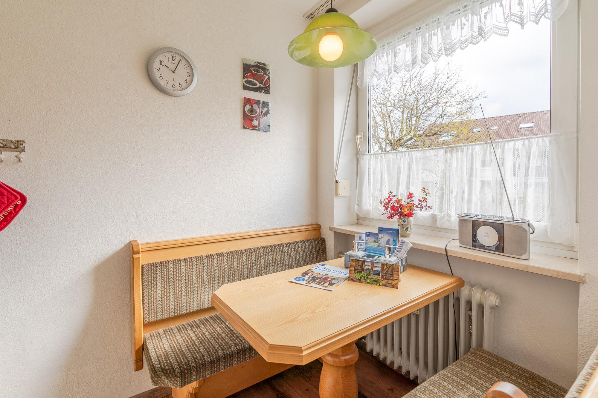 Die komplett eingerichtete Küche mit Essecke am Fenster bietet Ihnen alles für den täglichen Bedarf. Im Schlafzimmer finden Sie ein bequemes Doppelbett sowie einen Kleiderschrank.