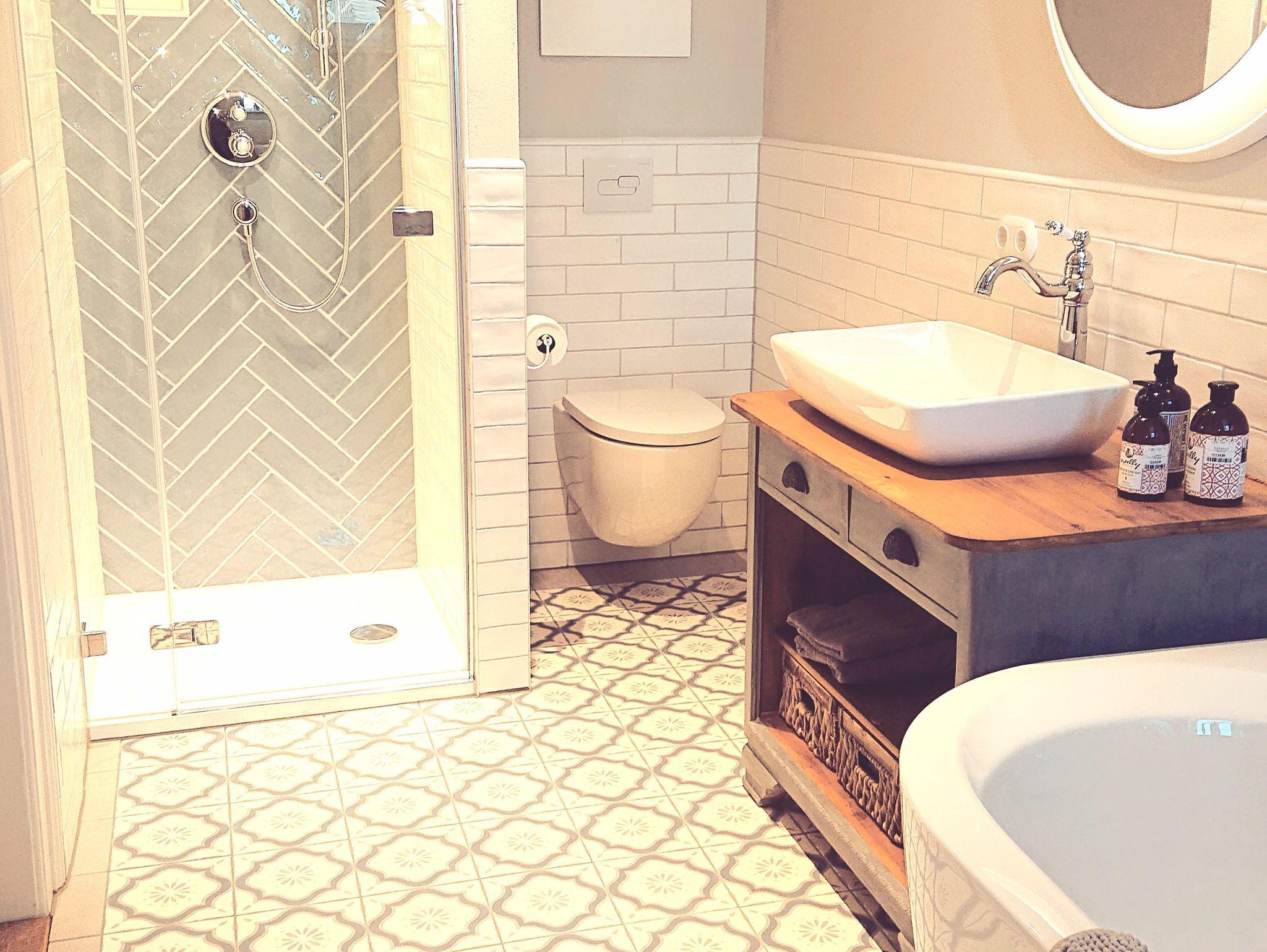 Das Bad besitzt ein WC, eine Dusche und eine Badewanne.