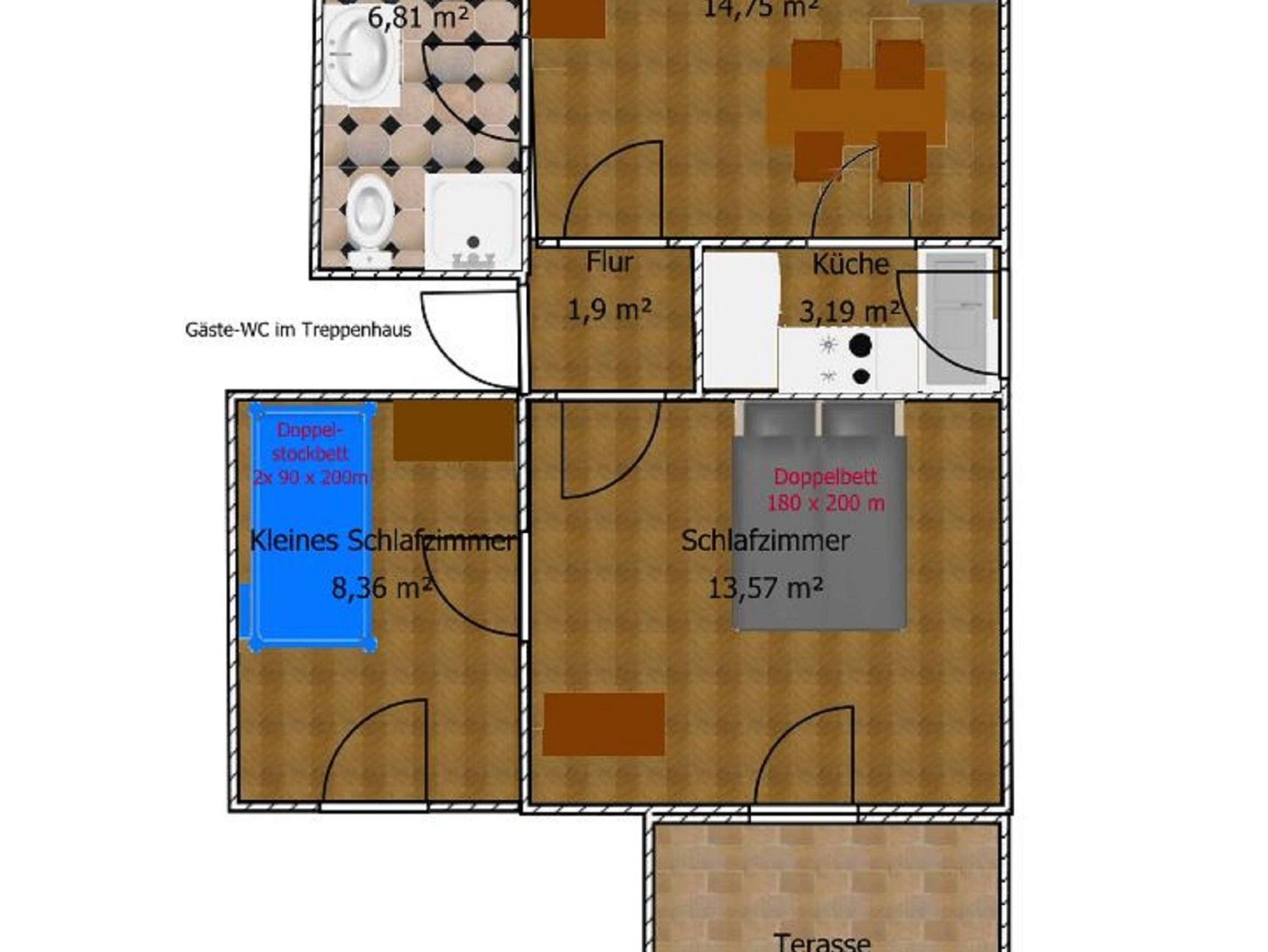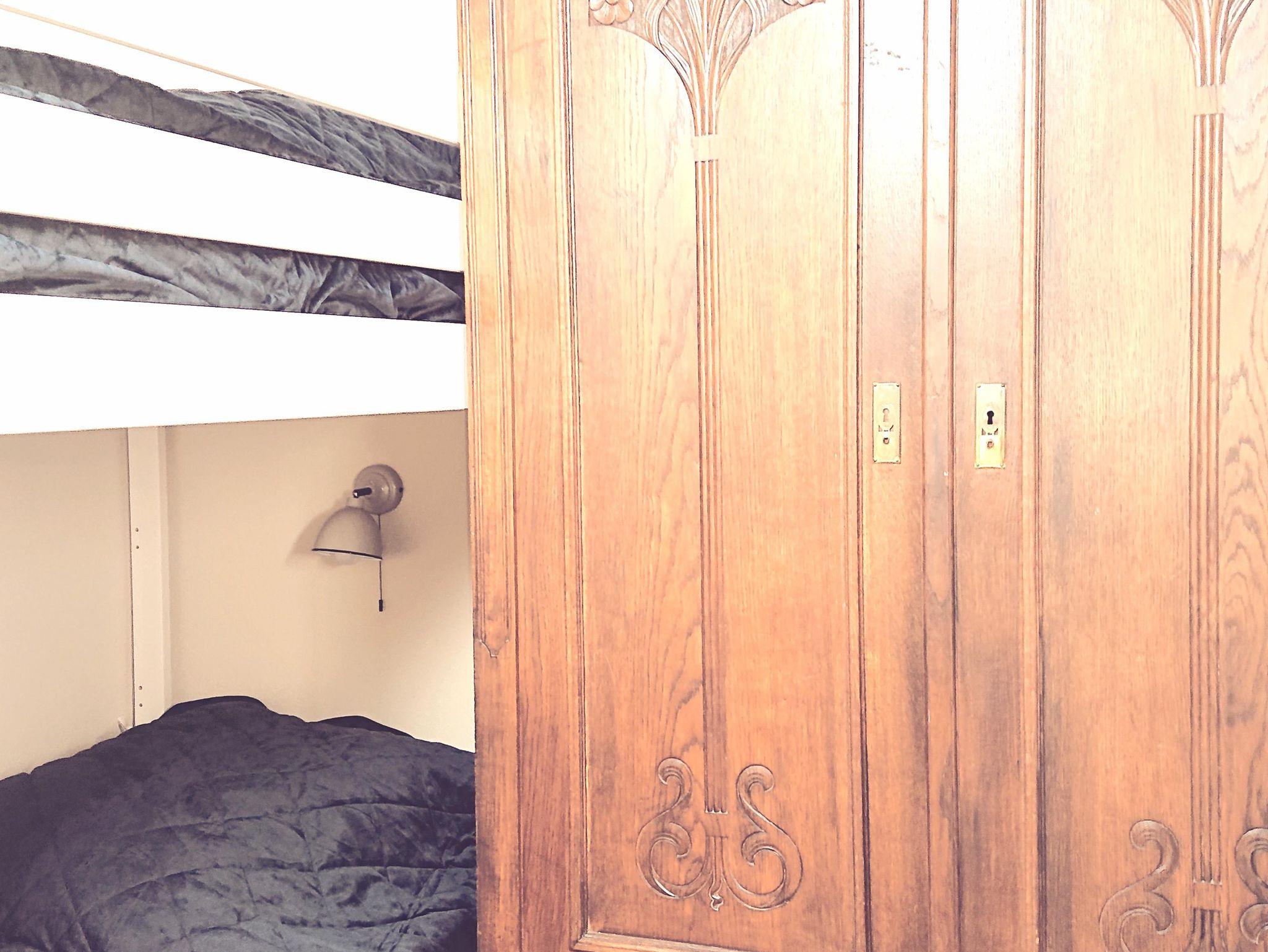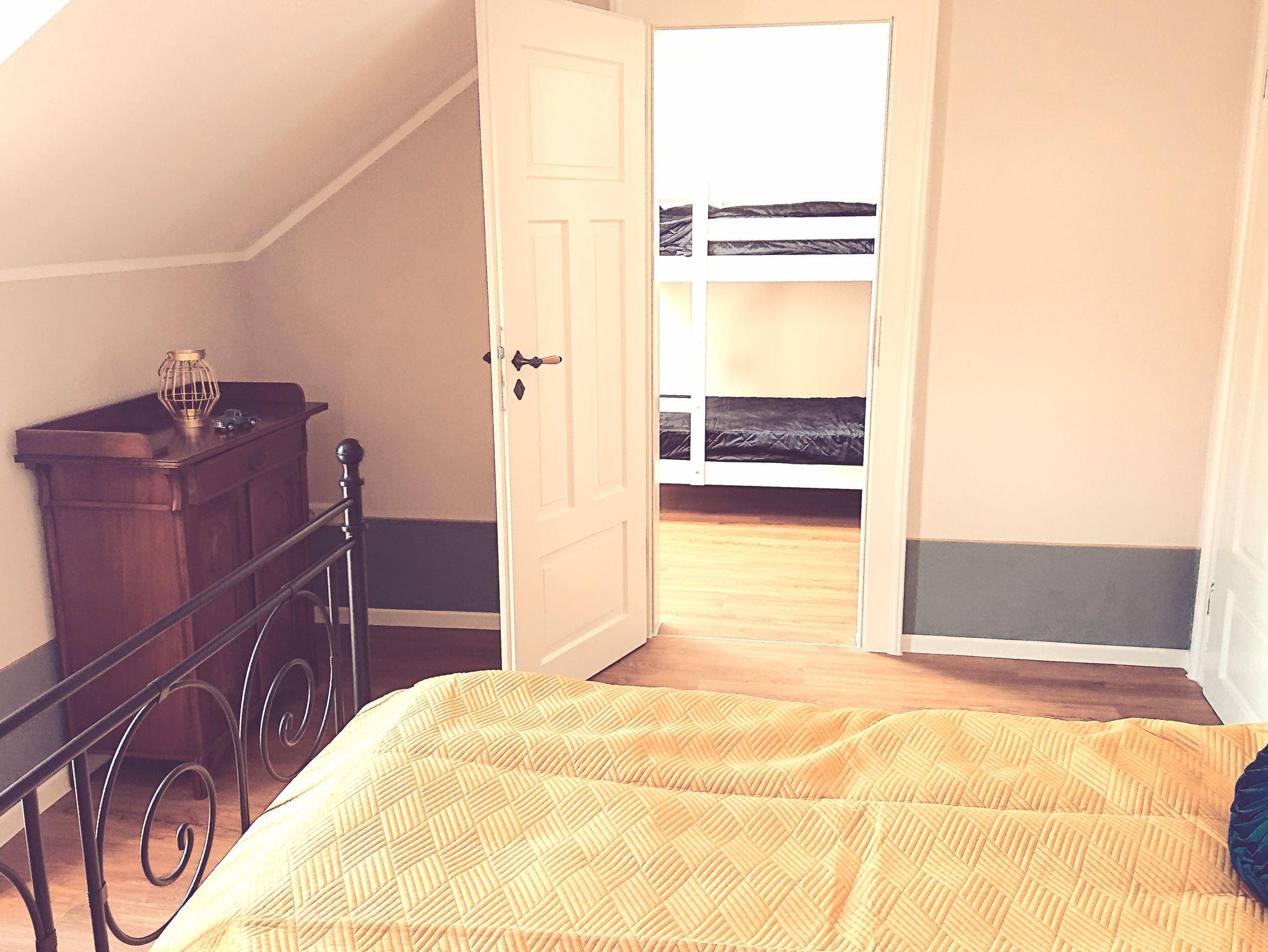 Ein Schlafzimmer ist mit einem Doppelbett ausgestattet, das andere Schlafzimmer mit einem Etagenbett.