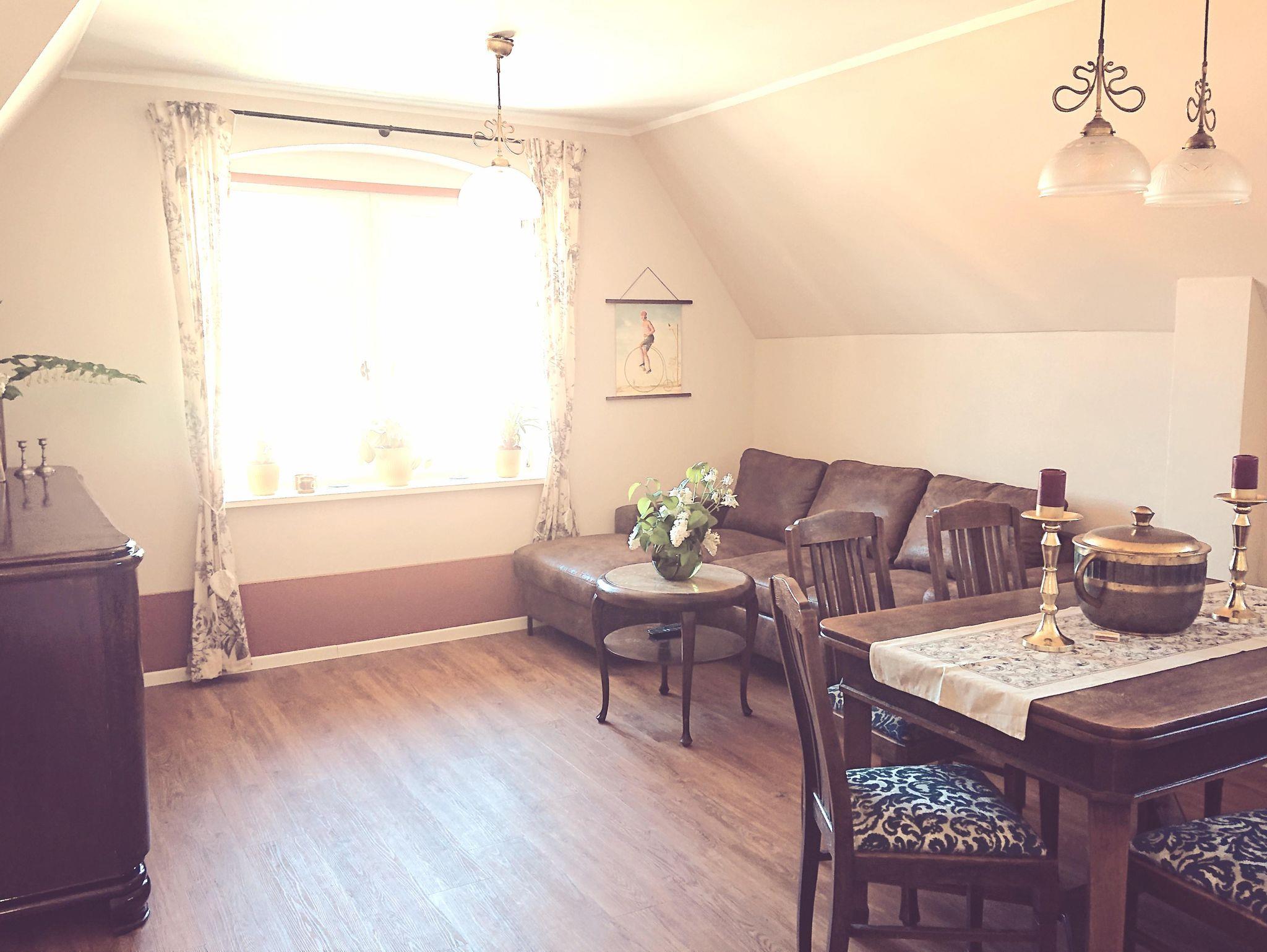 Die Ferienwohnung Charlie Chaplin befindet sich im Dachgeschoss. Sie besteht aus drei Räumen und einer Terasse.