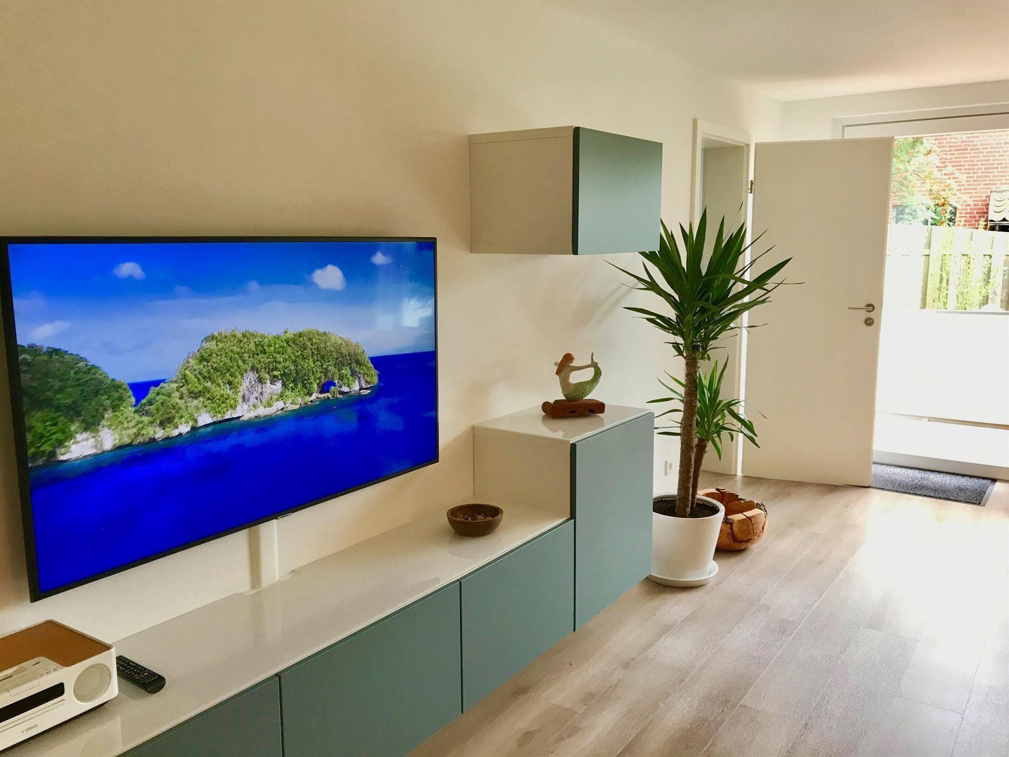 • 1 lichtdurchflutetes Wohnzimmer mit Sitzecke und großem Flachbild TV und Zugang zur Terrasse mit Gartenmöbel