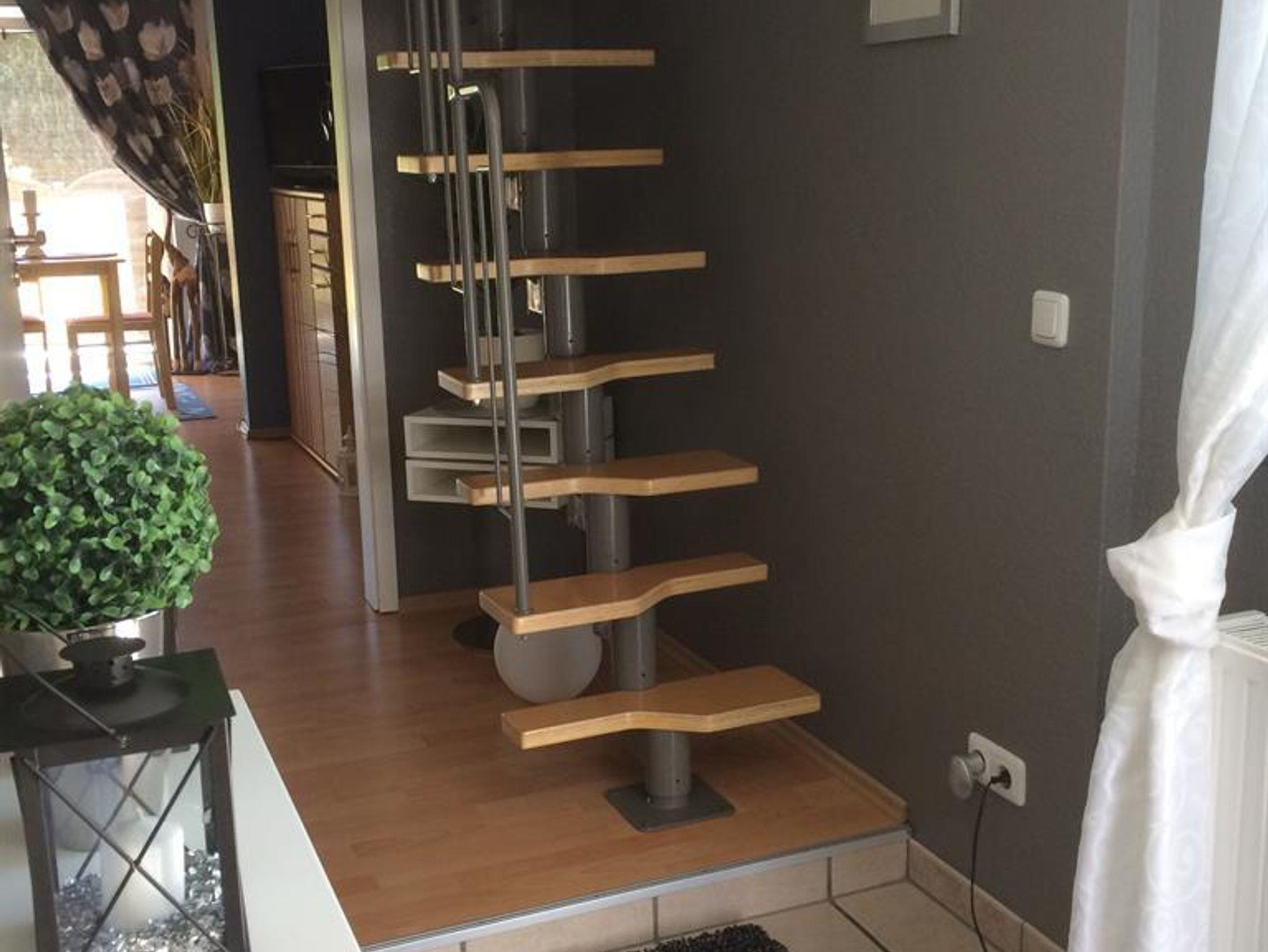 Im EG befindet sich ein schönes,geräumiges WZ mit TV, gemütlicher Sitzlandschaft,Essbereich,großer Fensterfront von wo Sie ins Grüne blicken.Die Terrasse,die man vom Wohnzimmer erreicht,ist perfekt zum relaxen.Die Küche verfügt über alles,was Sie für Ihre Auszeit benötigen.Das Bad in angenehmer Größe bietet eine Dusche.Vom Flur führt eine Raumspartreppe ins Obergeschoss,in welchem sich das Schlafzimmer mit 2 Einzelbetten befindet.