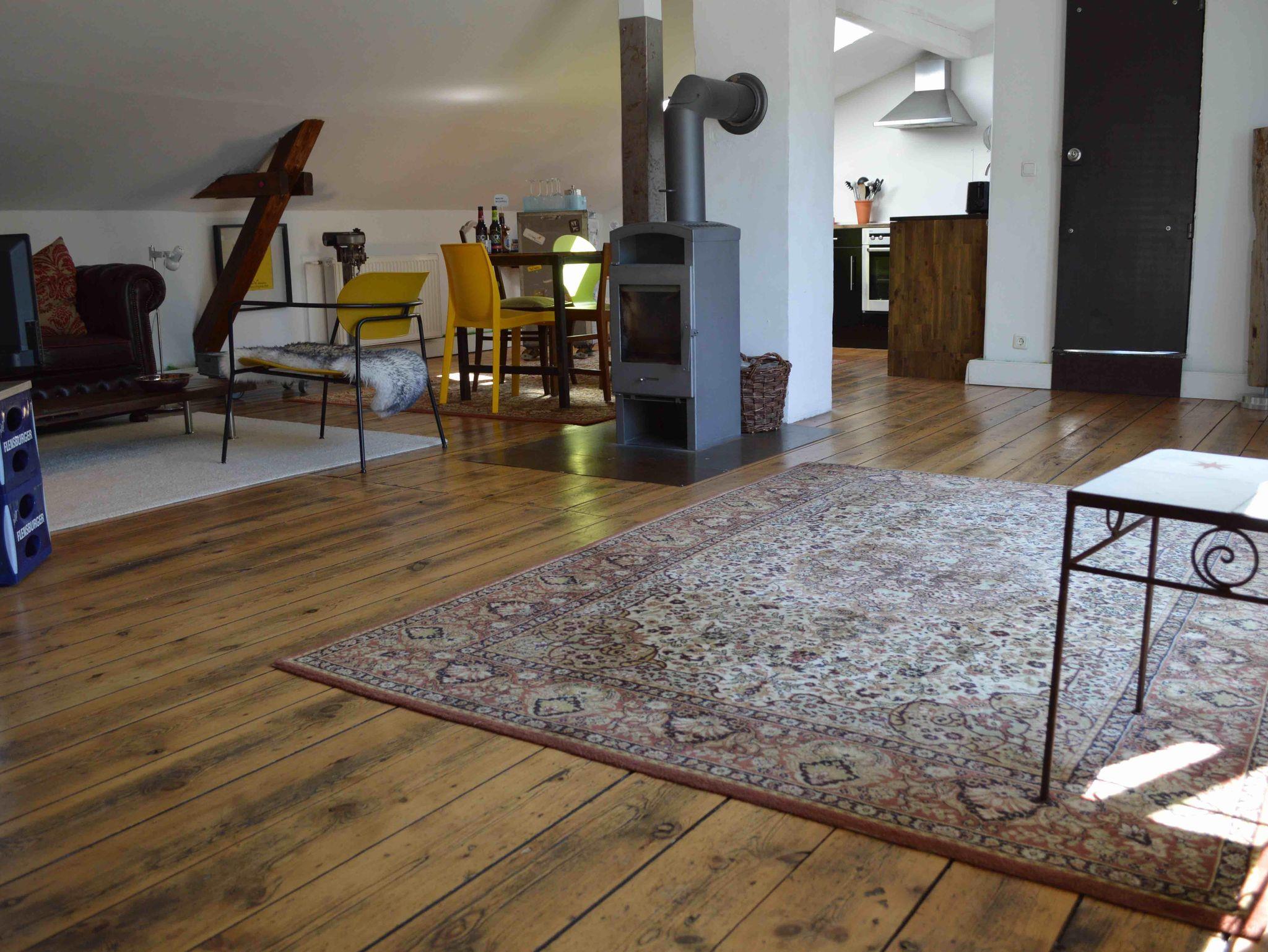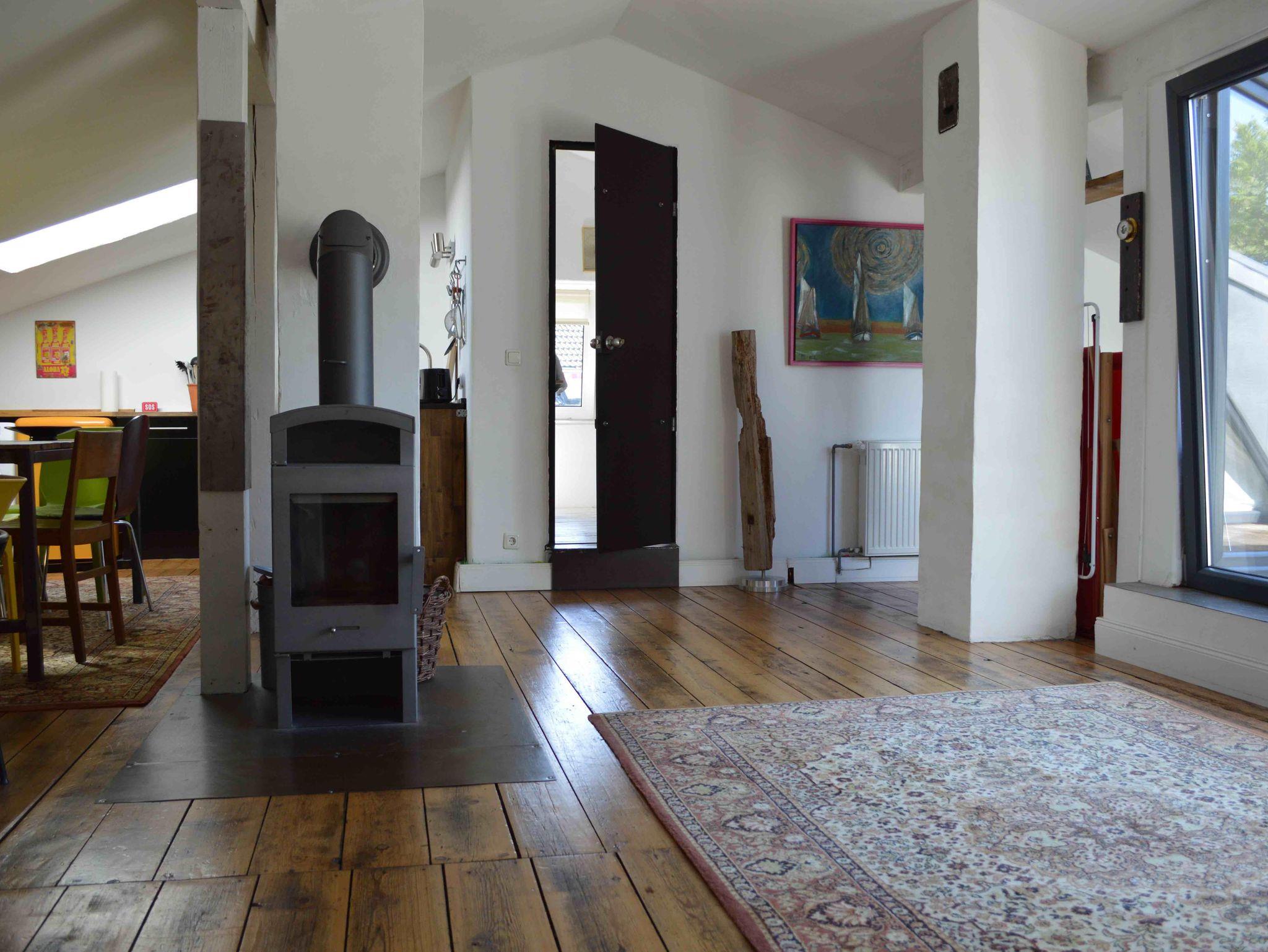 Unsere Wohnung im Dachgeschoss bietet Platz für 4+ Personen. Zur Wohnung gehört eine großzügige Dachterrasse. Ein großzügiger Wohn- und Essbereich mit angrenzender offener Küche bildet das Herz der Wohnung. Auf der Richtung Süden gelegenen Dachterrasse können Sie den Blick über die Dächer genießen. Die Wohnung hat ein Schlafzimmer mit Doppelbett, sowie ein Schlafzimmer mit zwei Einzelbetten. Ein Alkovenbett bietet bei Bedarf zwei weitere Schlafplätze. Das modern ausgestattete Badezimmer verfügt über Dusche und Badewanne. Ein Kaminofen sorgt für Gemütlichkeit.