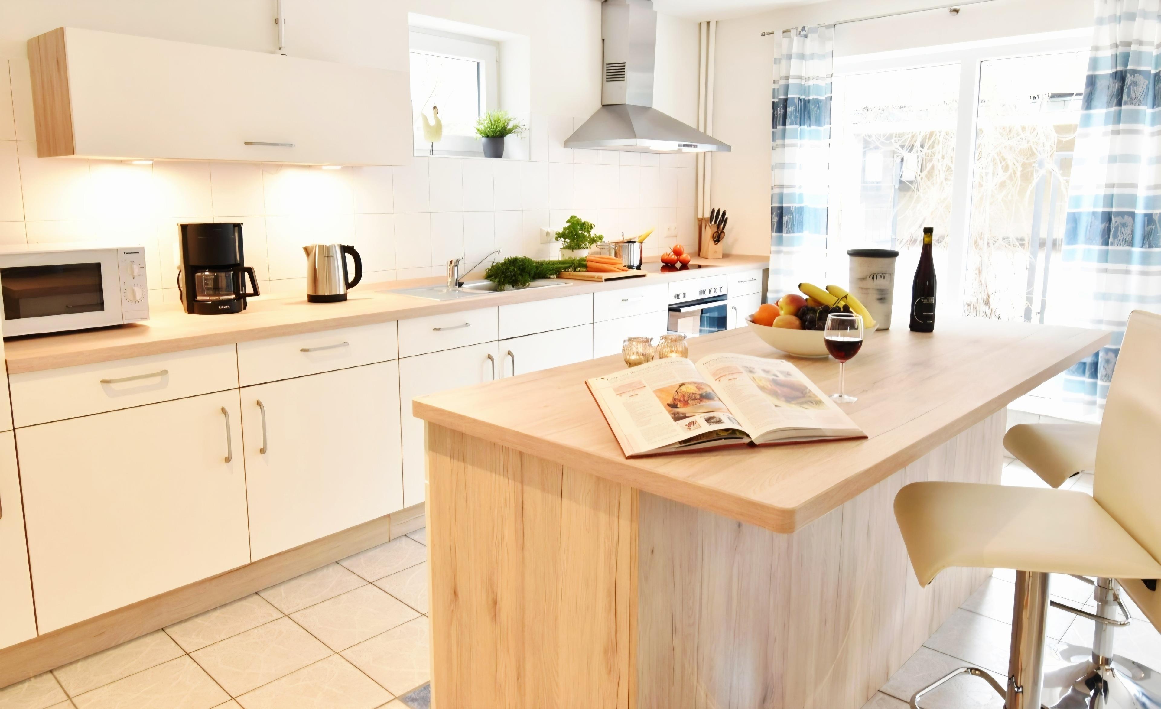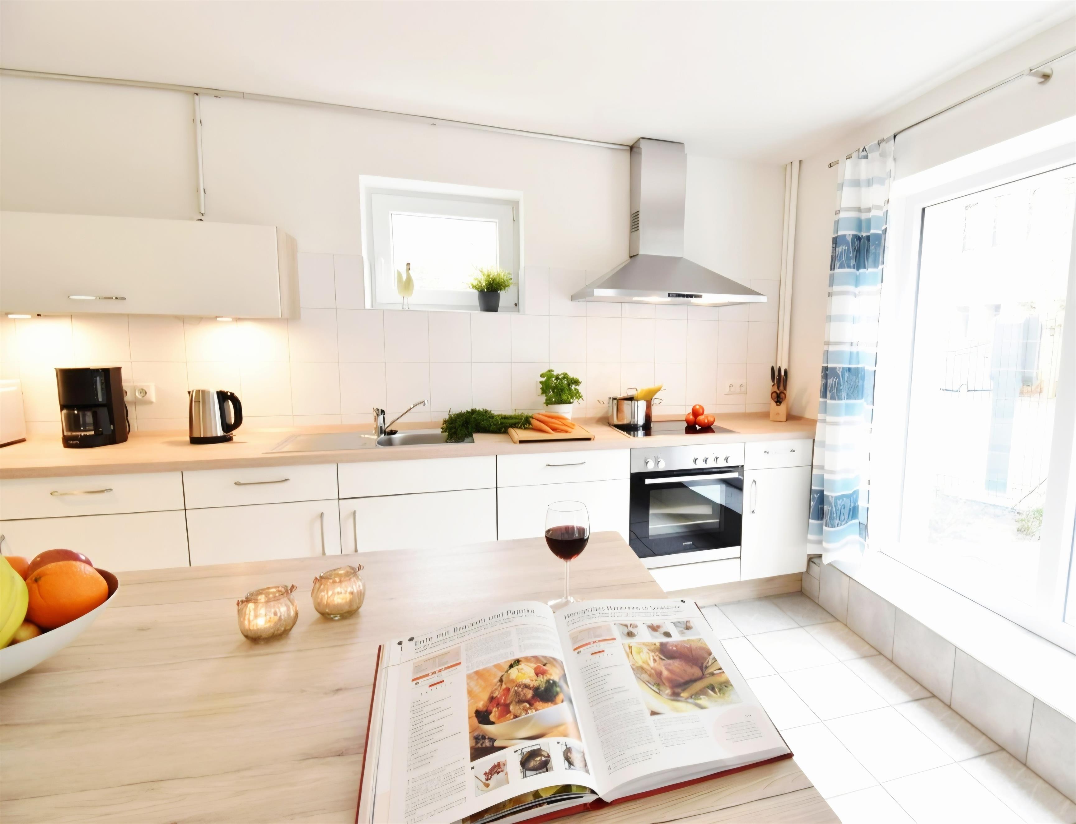 Das Herzstück der Wohnung ist der großzügige Wohn- und Essbereich mit voll ausgestatteter Küche. Ob gemeinsames Kochen, ein Glas Wein am großen Esstisch oder entspannte Filmabende – hier fühlst du dich wie zuhause. Von hier aus gelangst du direkt auf die große Terrasse, die an warmen Tagen mit Gartenmöbeln zu gemütlichen Stunden im Freien einlädt.