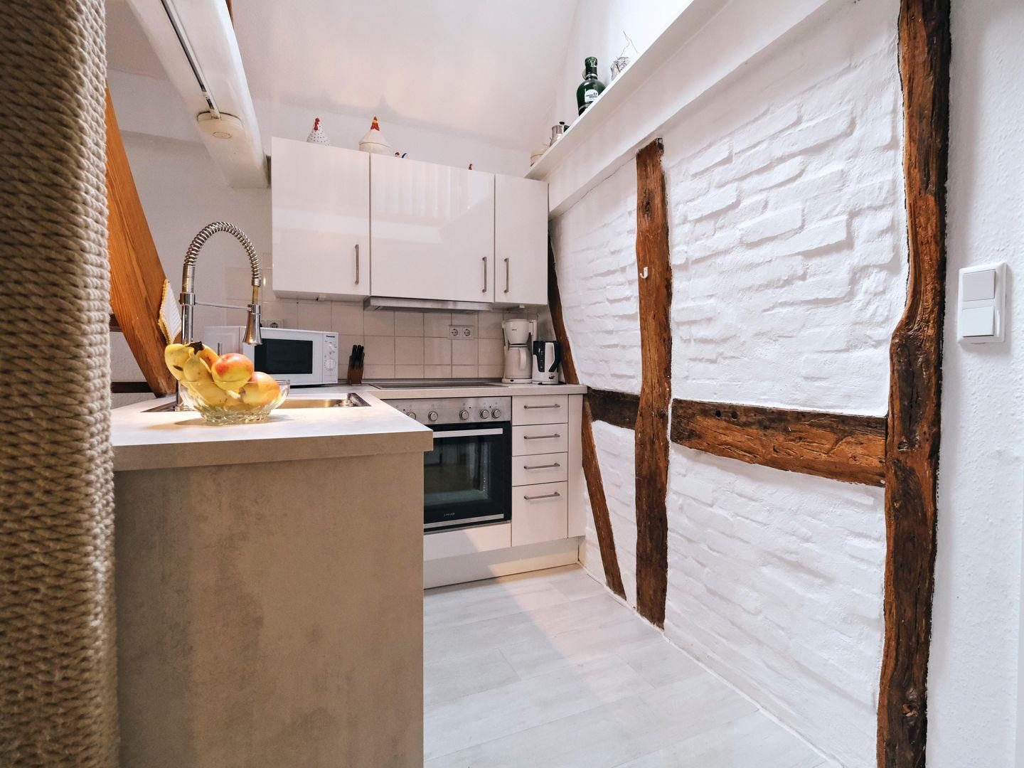 Die Wohnung befindet sich im ersten Obergeschoss eines denkmalgeschützten Fachwerkhauses aus dem 16. Jahrhundert. Die Wohnung verteilt sich auf zwei Ebenen. Beim Betreten der Wohnung habt Ihr einen schönen Blick auf die geräumige und offene Wohnküche. Die Küche ist vollausgestattet und lässt keine Wünsche offen.