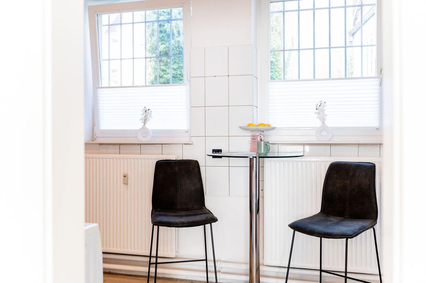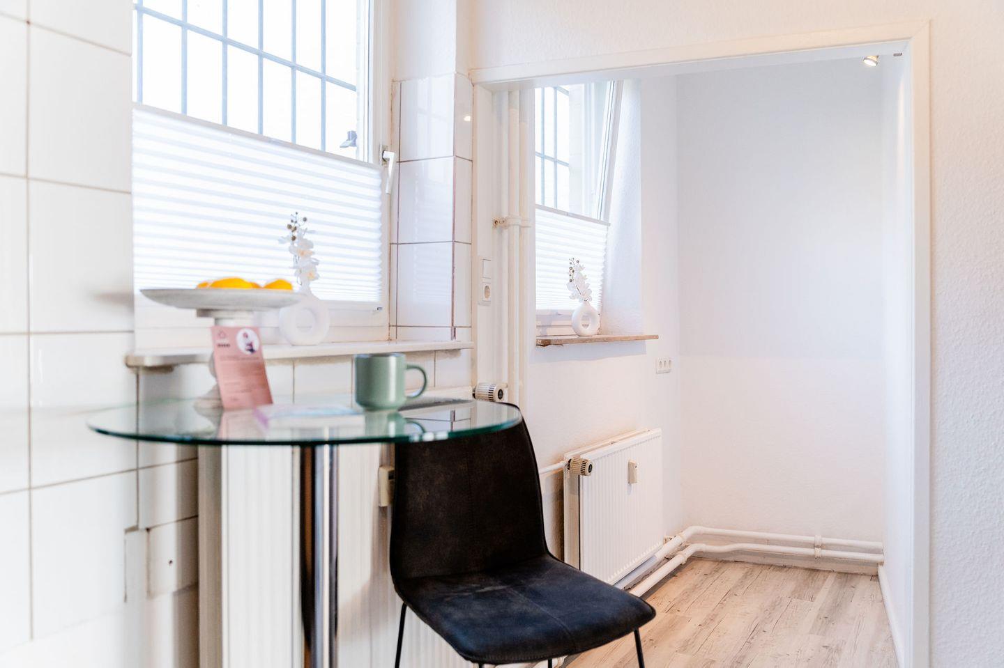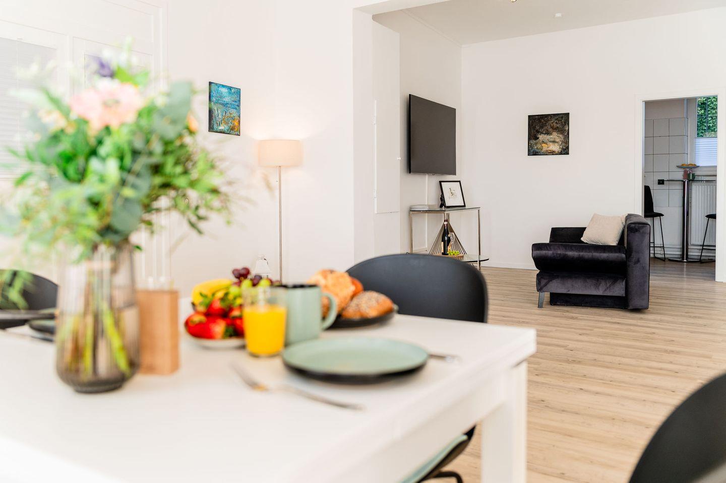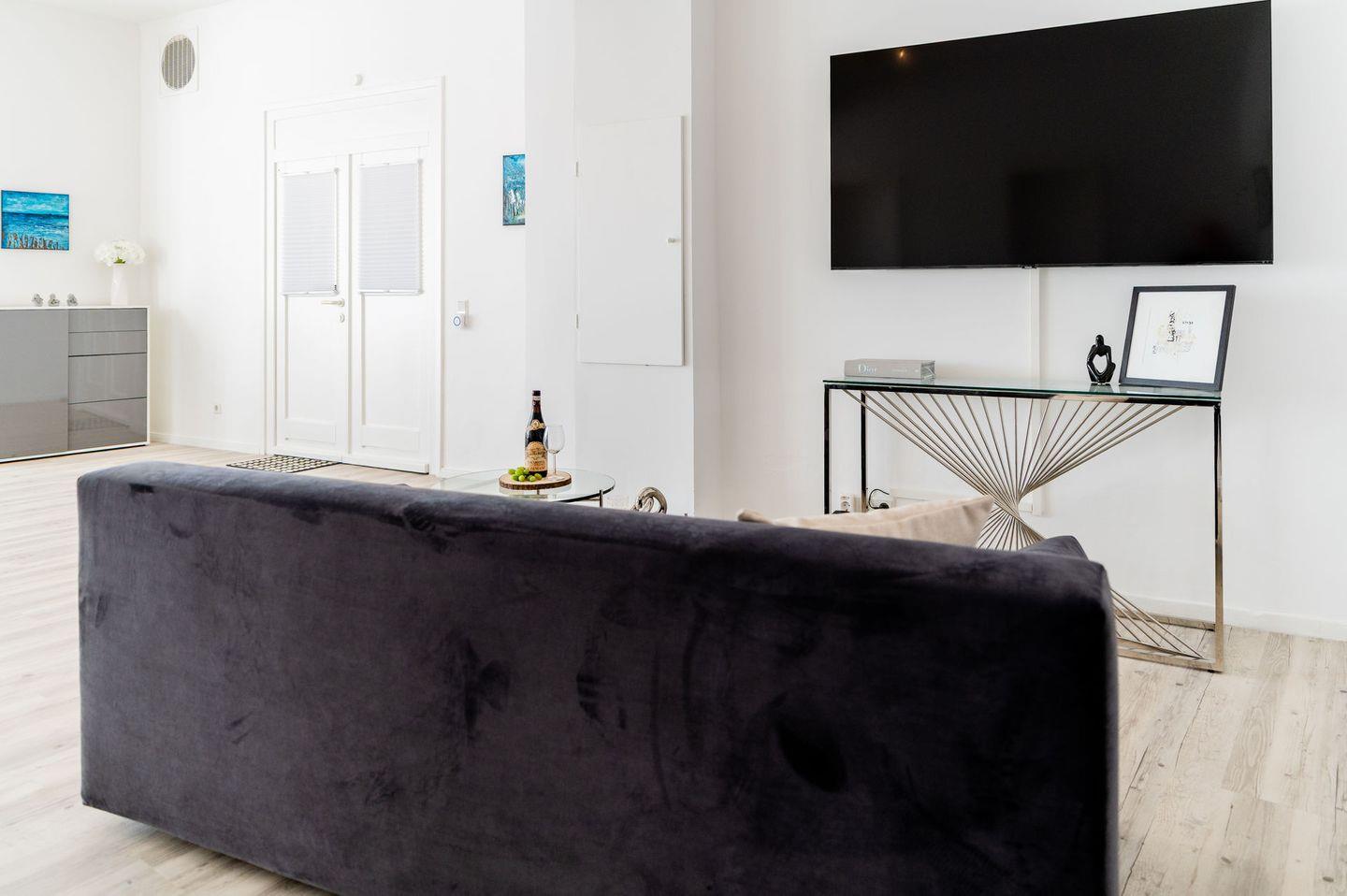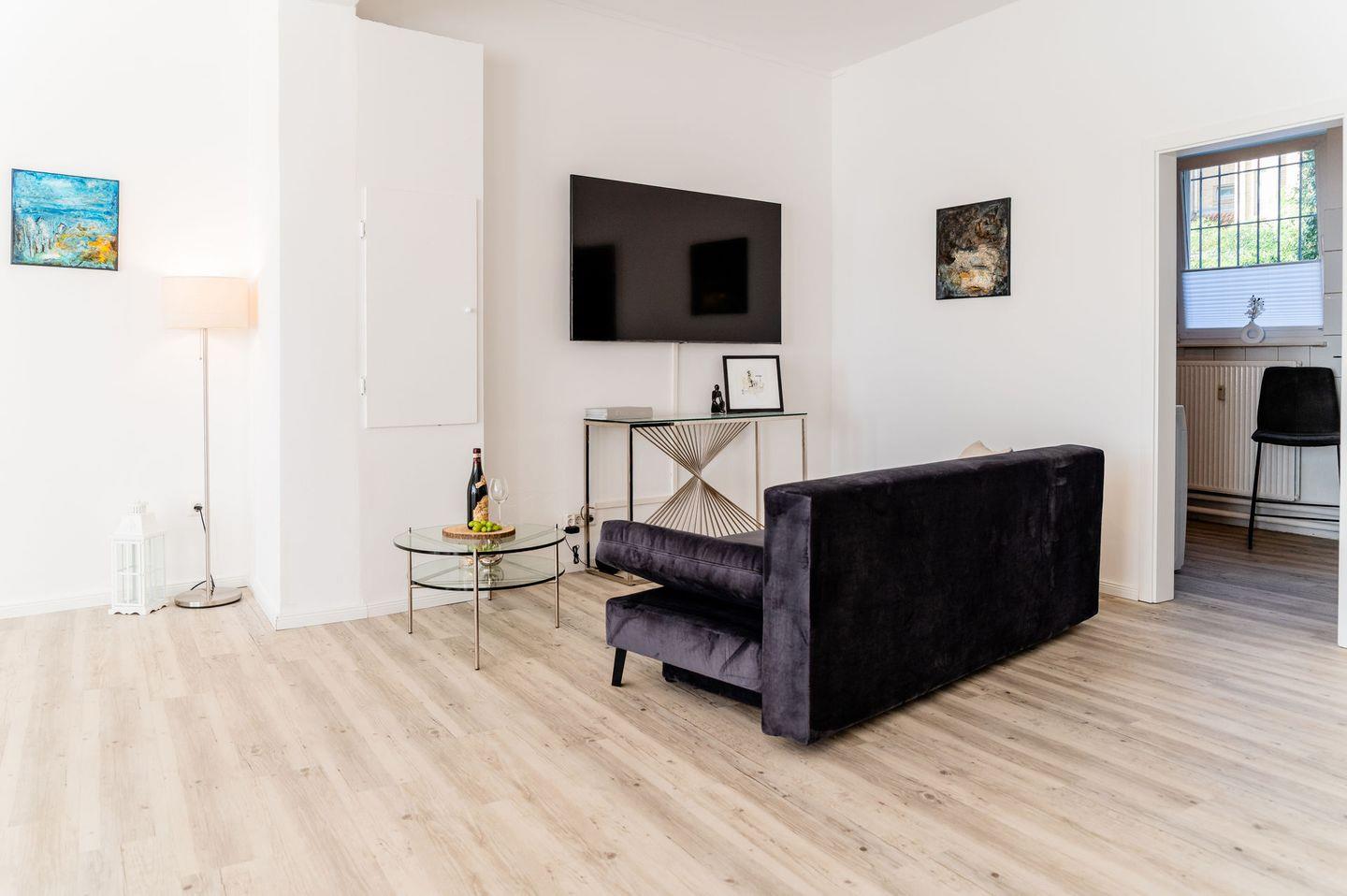Die Wohnung ist stilvoll eingerichtet und verfügt über ein helles Wohnzimmer mit einem bequemen Sofa, einem Fernseher und einem Essbereich. Die offene Küche ist modern ausgestattet und bietet alles, was Sie für die Zubereitung Ihrer Mahlzeiten benötigen, einschließlich Herd, Kühlschrank, Mikrowelle und Geschirr.