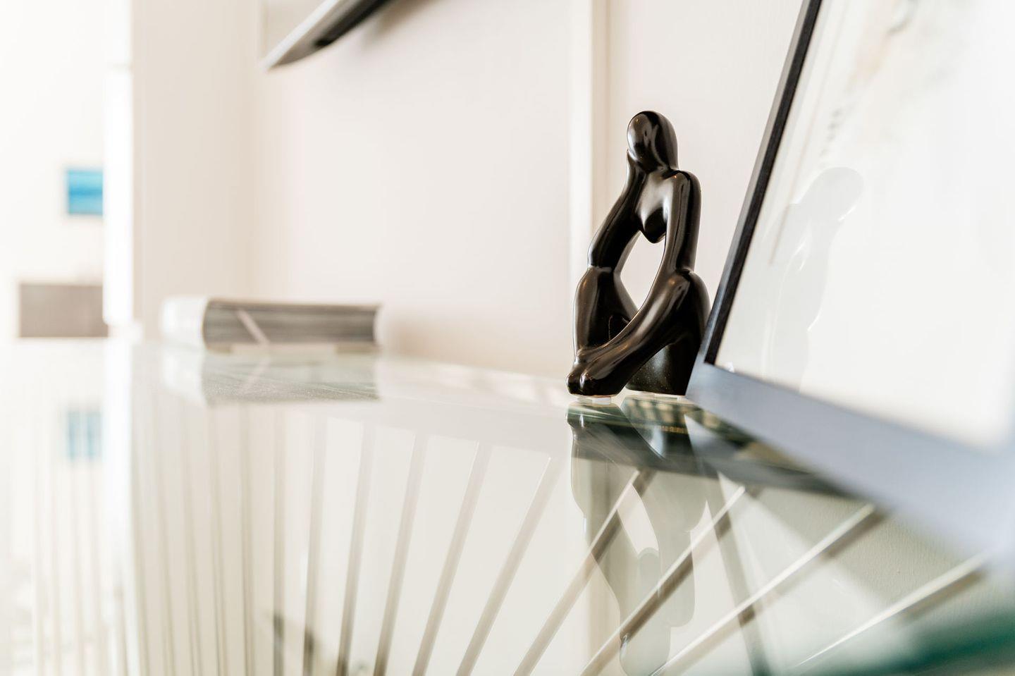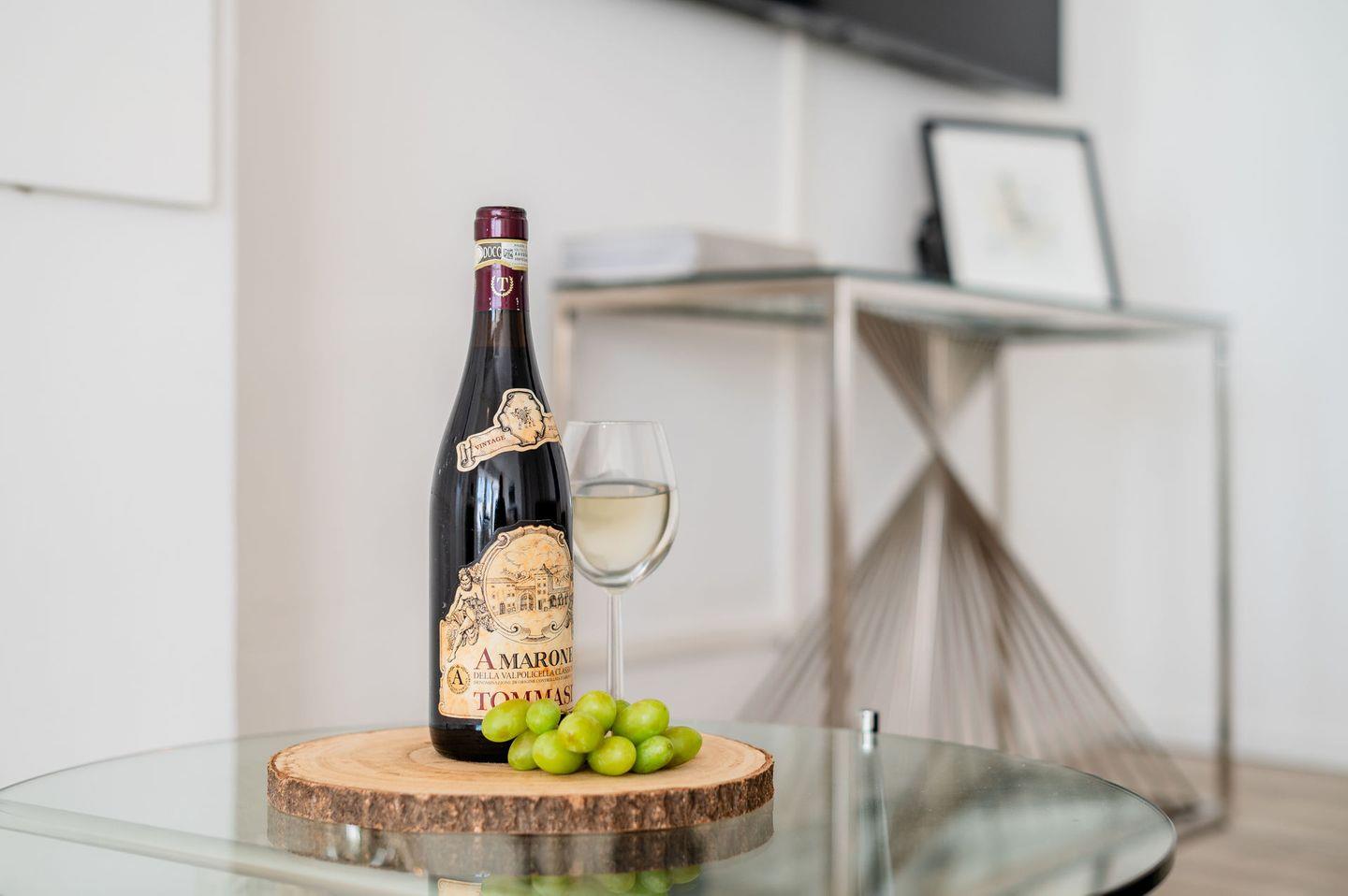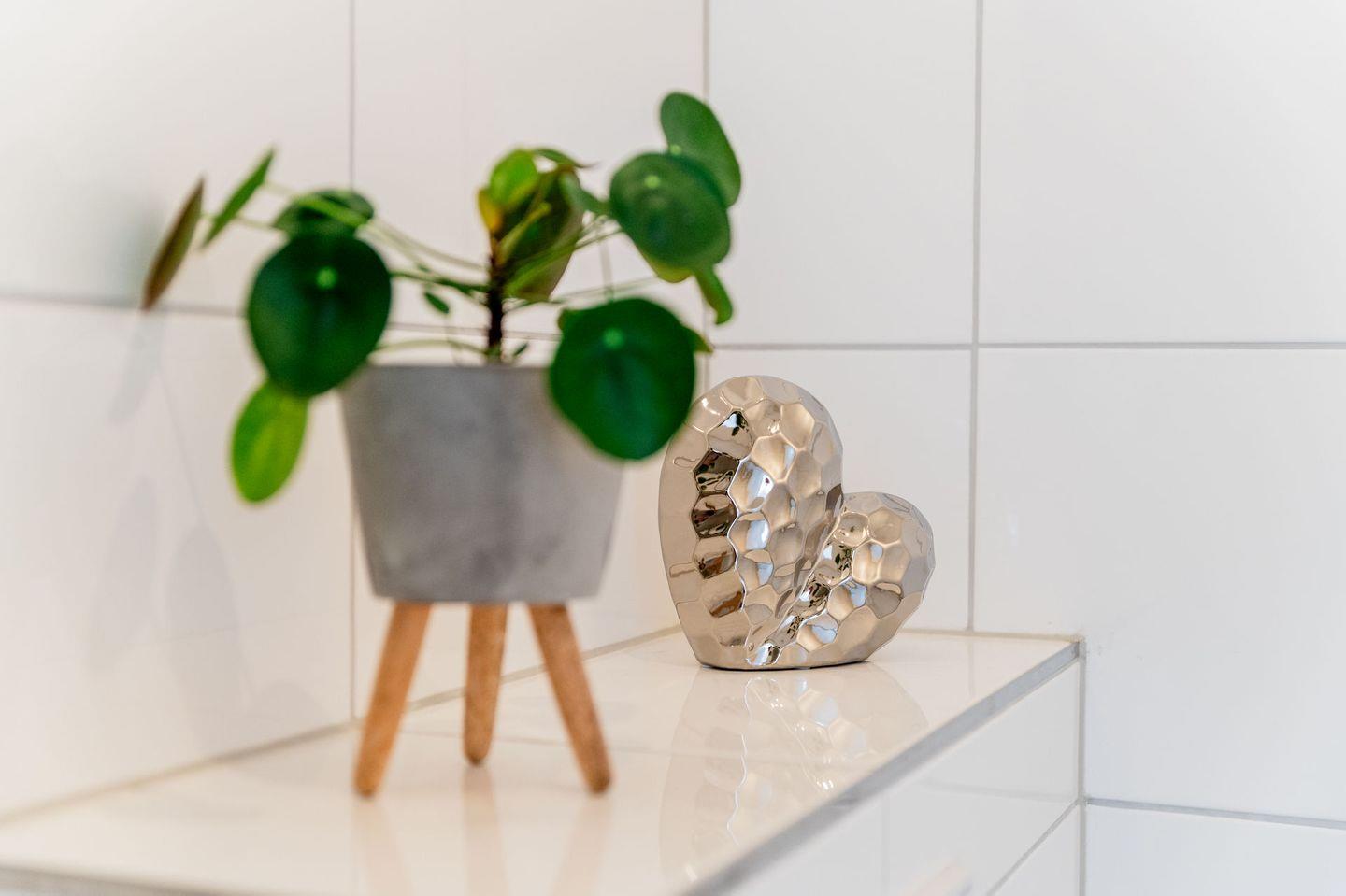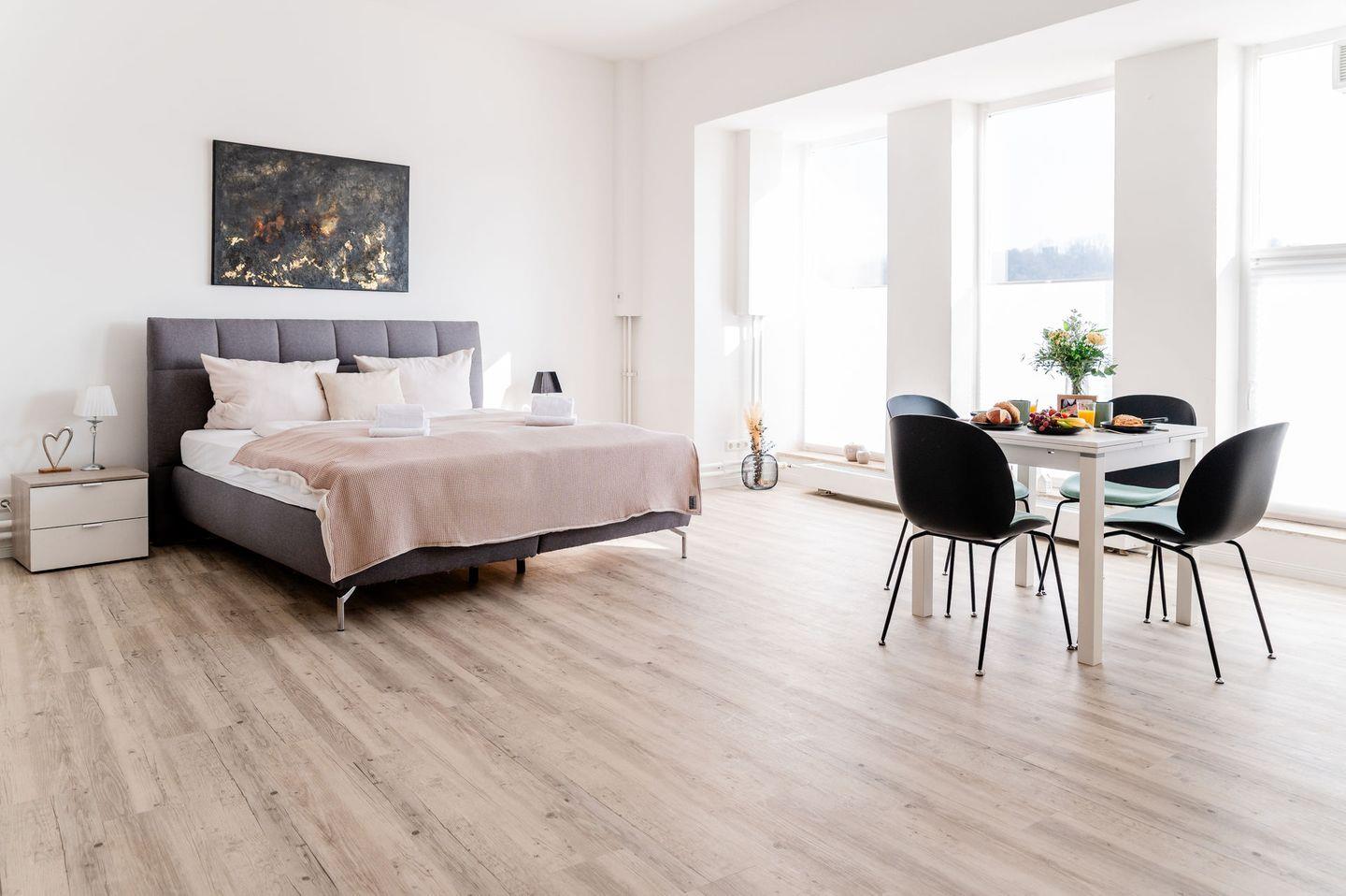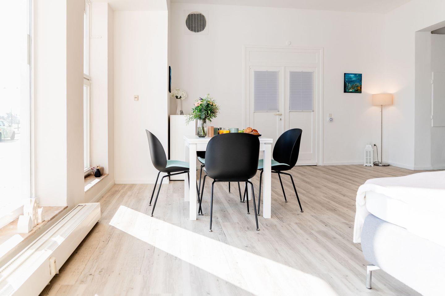 Die Wohnung ist stilvoll eingerichtet und verfügt über ein helles Wohnzimmer mit einem bequemen Sofa, einem Fernseher und einem Essbereich. Die offene Küche ist modern ausgestattet und bietet alles, was Sie für die Zubereitung Ihrer Mahlzeiten benötigen, einschließlich Herd, Kühlschrank, Mikrowelle und Geschirr.