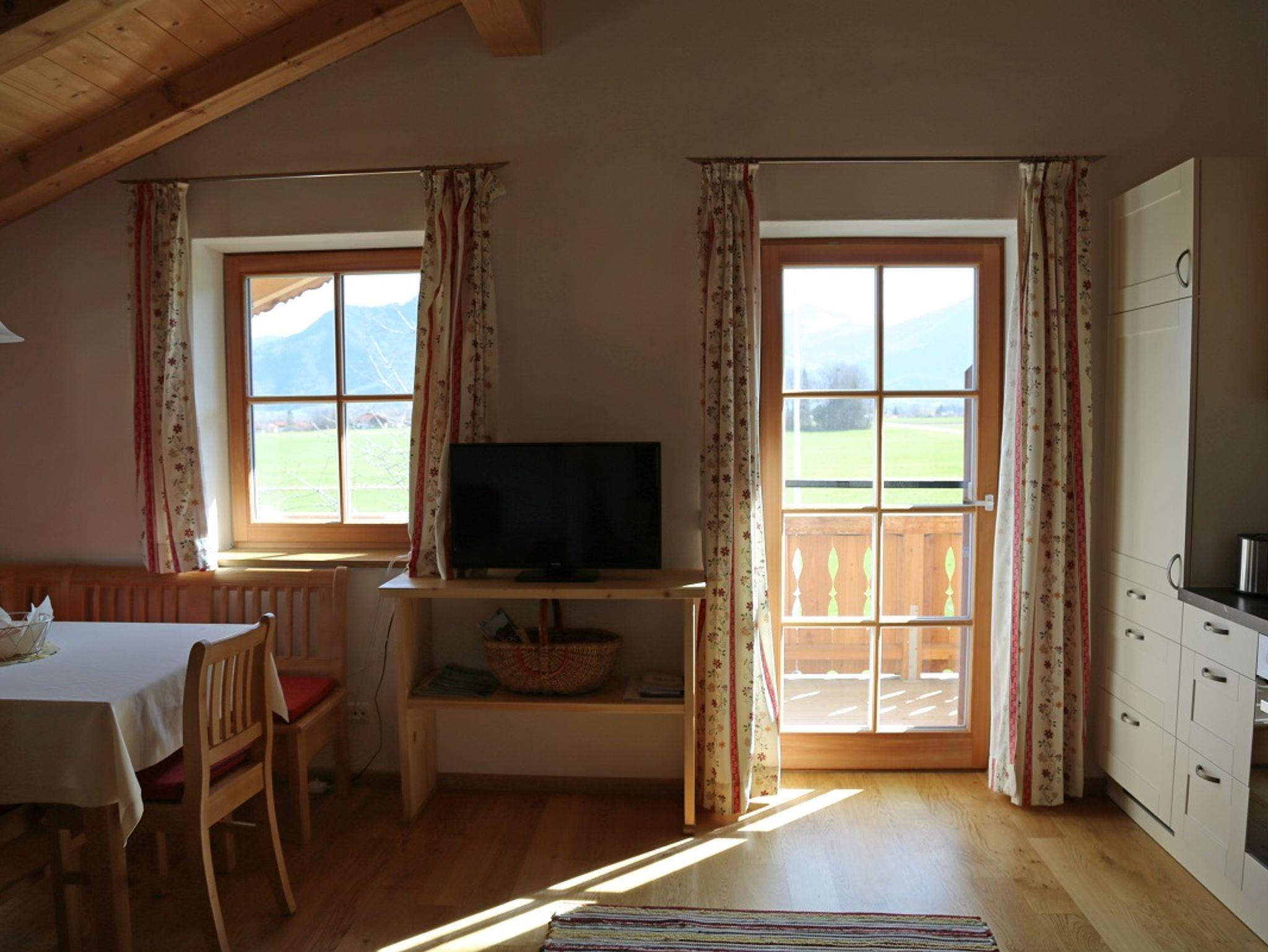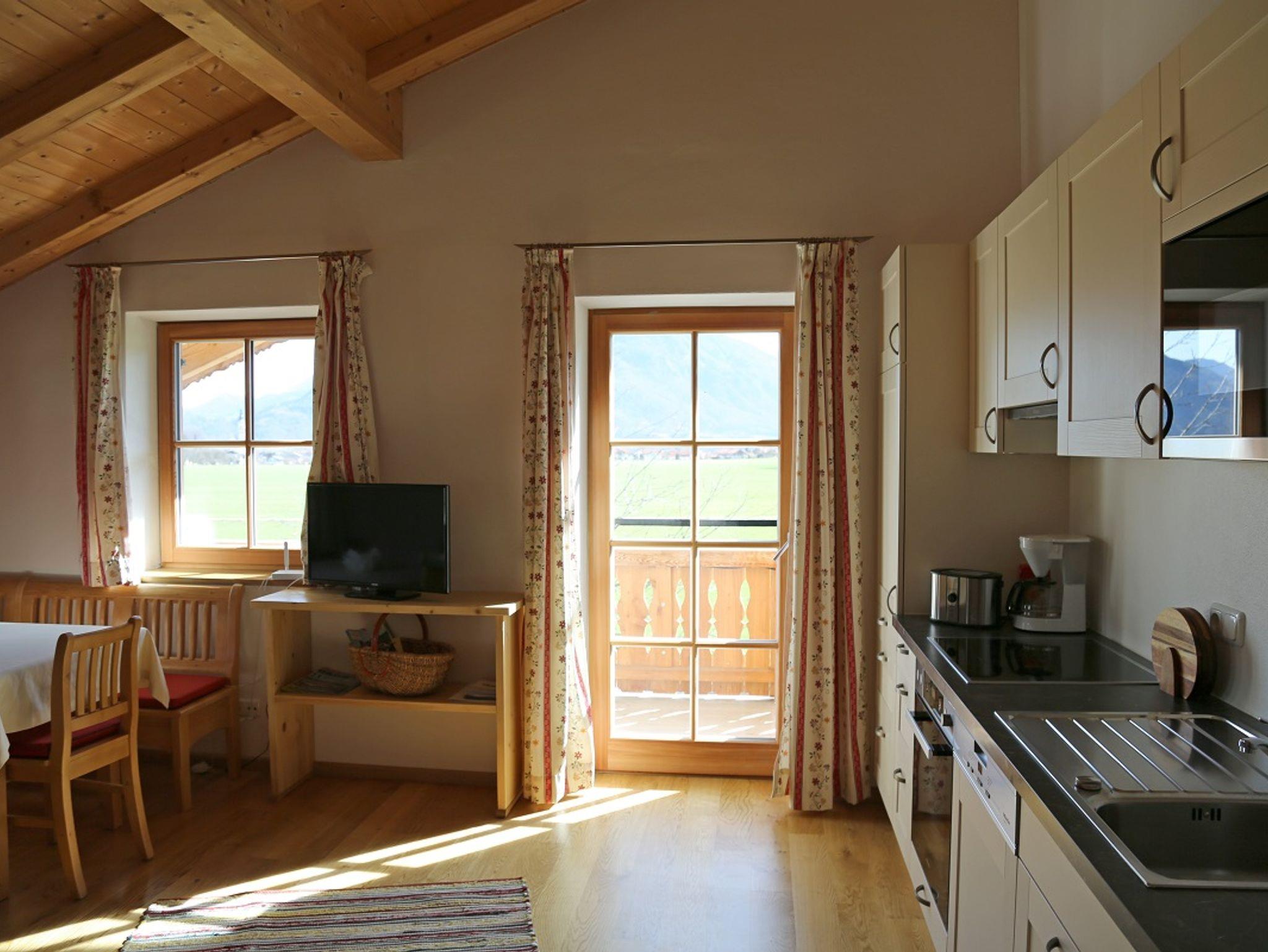 Die 2018 errichtete Ferienwohnung im Landhausstil befindet im 2. Stock unseres Bauernhofes, jedoch mit eigenem Eingang. Die Räume sind großzügig und hell, besonders der sichtbare Dachstuhl und der Parkettboden in der Wohnküche und in den 2 Schlafzimmern verleihen der Wohnung viel Gemütlichkeit. Die sehr gut ausgestattete Wohnküche ist mit einer Kaffeemaschine, Wasserkocher, 4 Ceranplatten, Backofen, Microwelle, reichlich Geschirr, Spülmaschine, Stabmixer, Eierkocher, Toaster und Kühlschrank mit Tiefkühlfach bestückt. Außerdem steht Ihnen ein TV, WLAN, Badezimmer mit DU/WC, Fön, Handtücher und Bettwäsche zur Verfügung. Der Balkon mit Balkonmöbel hat eine Ostausrichtung. - wenn 2 Personen beide Schlafzimmer benützen berechnen wir 10,00 € Zuschlag.