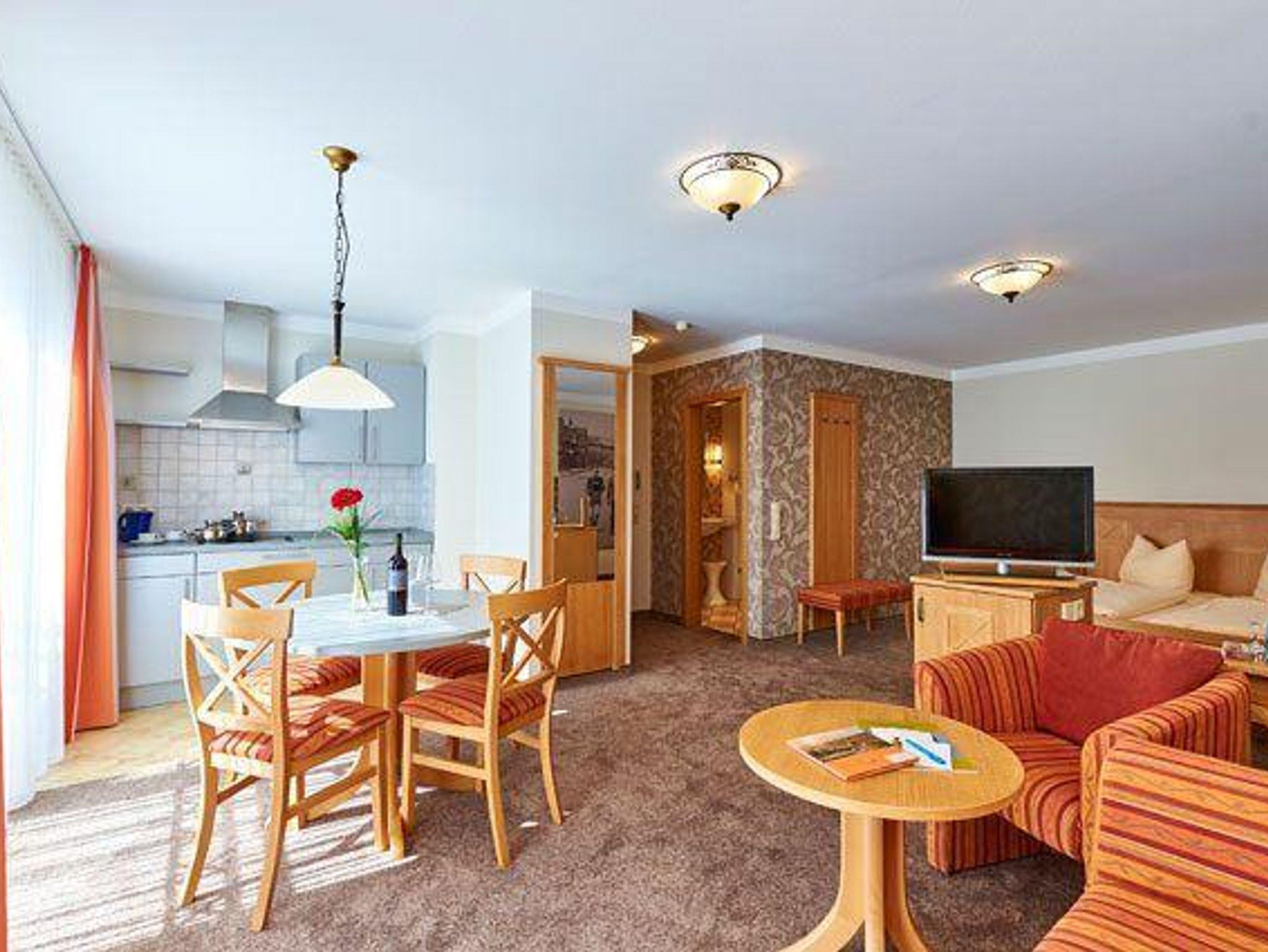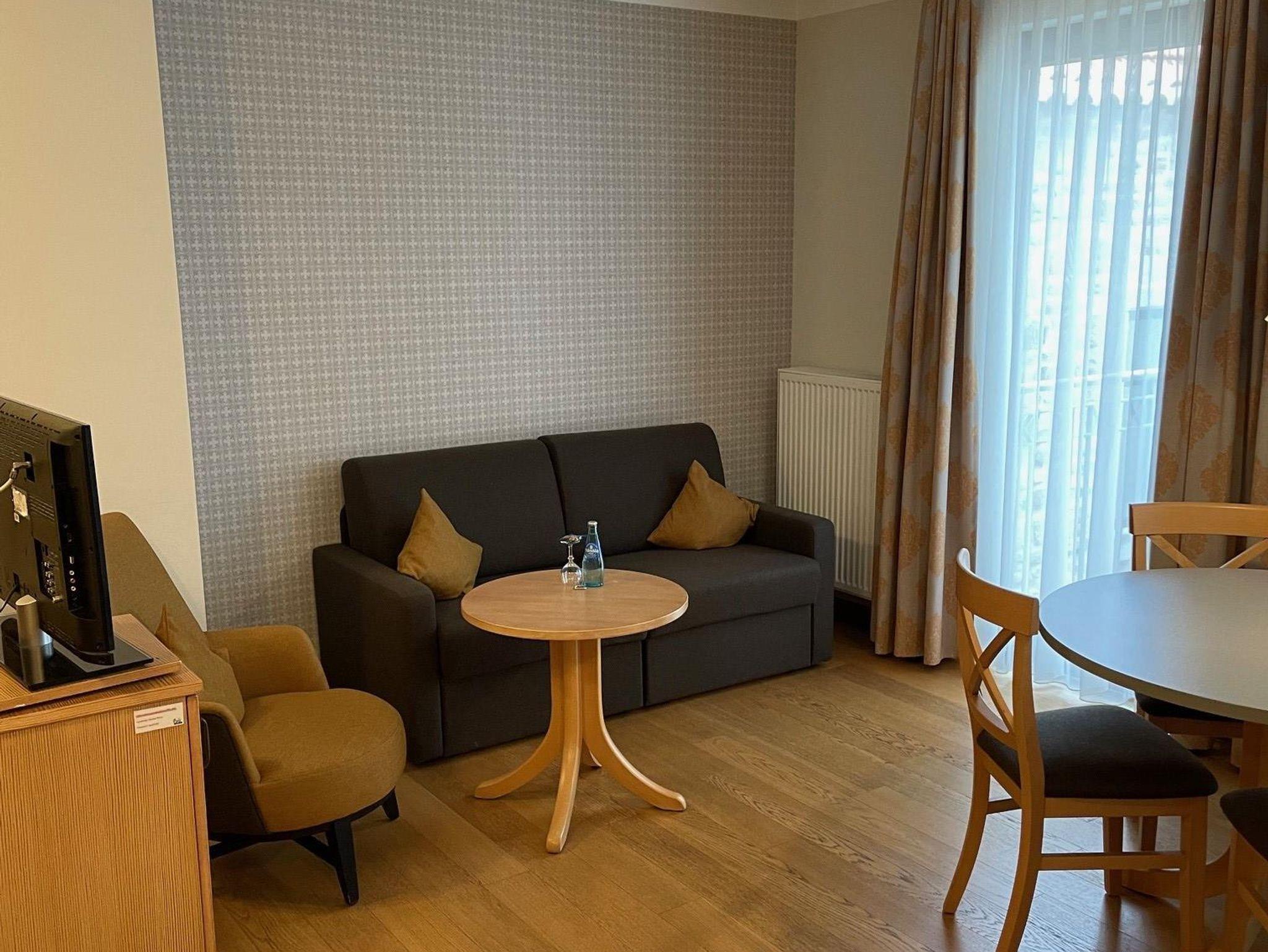 Das Hotel verfügt über zwei geräumige Appartements. Das eine Appartement liegt im ersten Stock am Ende des Flurs und das Andere befindet sich im zweiten Stock am Ende des Flures. Sie zeigen zum kleinen Innenhof, sind sehr ruhig gelegen und durch die großen Fenster schön hell. Es ist ein kleiner Balkon angeschlossen. In dem offenen Wohn-/Schlafzimmer befinden sich neben dem Ehebett eine Schlafcouch für ein bis zwei Personen, ein Esstisch für 4 Personen sowie eine kleine Küchenzeile mit Spülbecken, Herd und Wasserkocher. Der Kleiderschrank im Eingangsbereich hat einen eingebauten Safe und das innenliegende Bad im Landhausstil ist mit einer Badewanne ausgestattet.