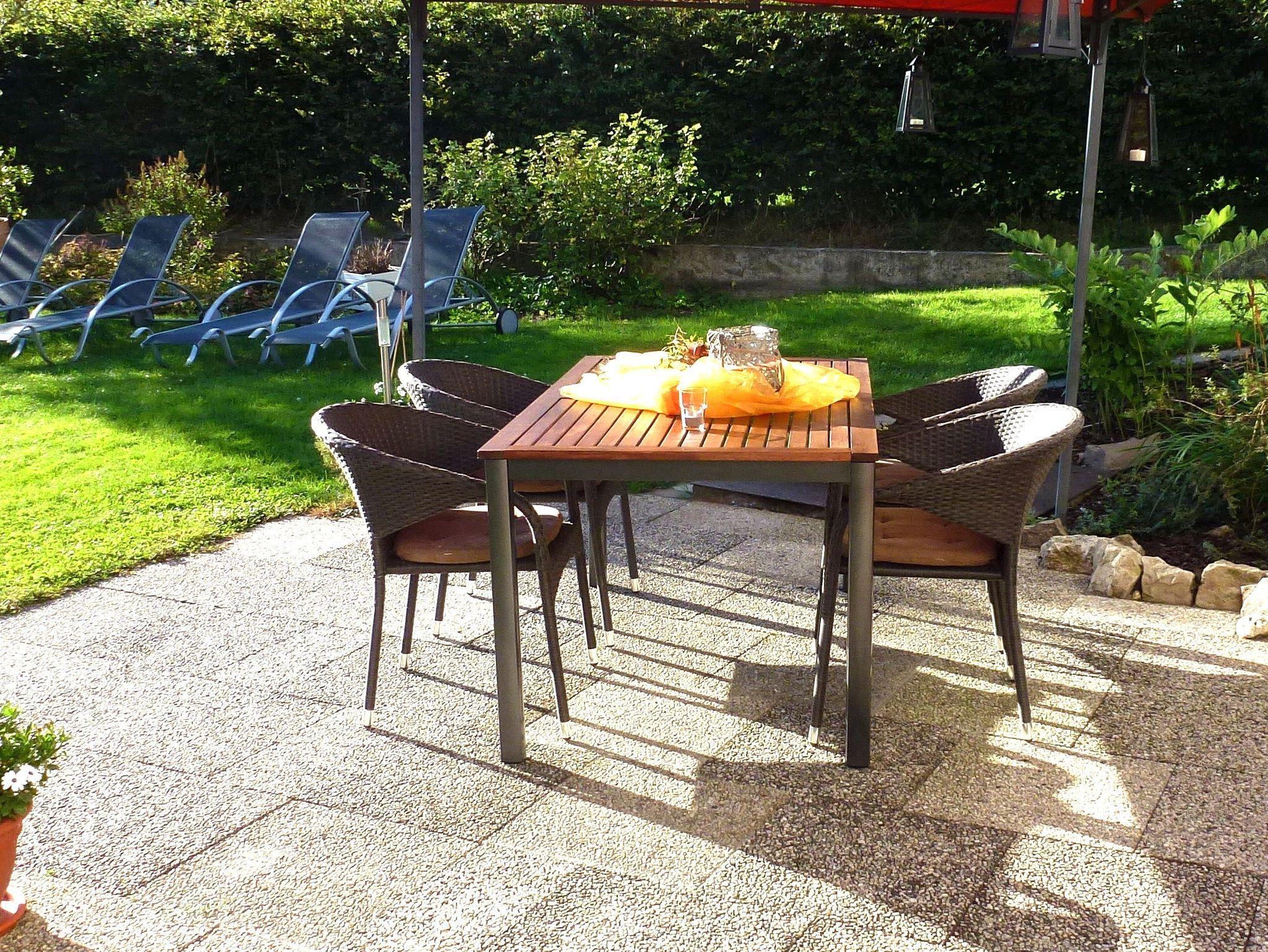 Auf dem teilweise überdachten und windgeschützten Balkon oder auf der Terrasse oder Liegewiese im Garten können