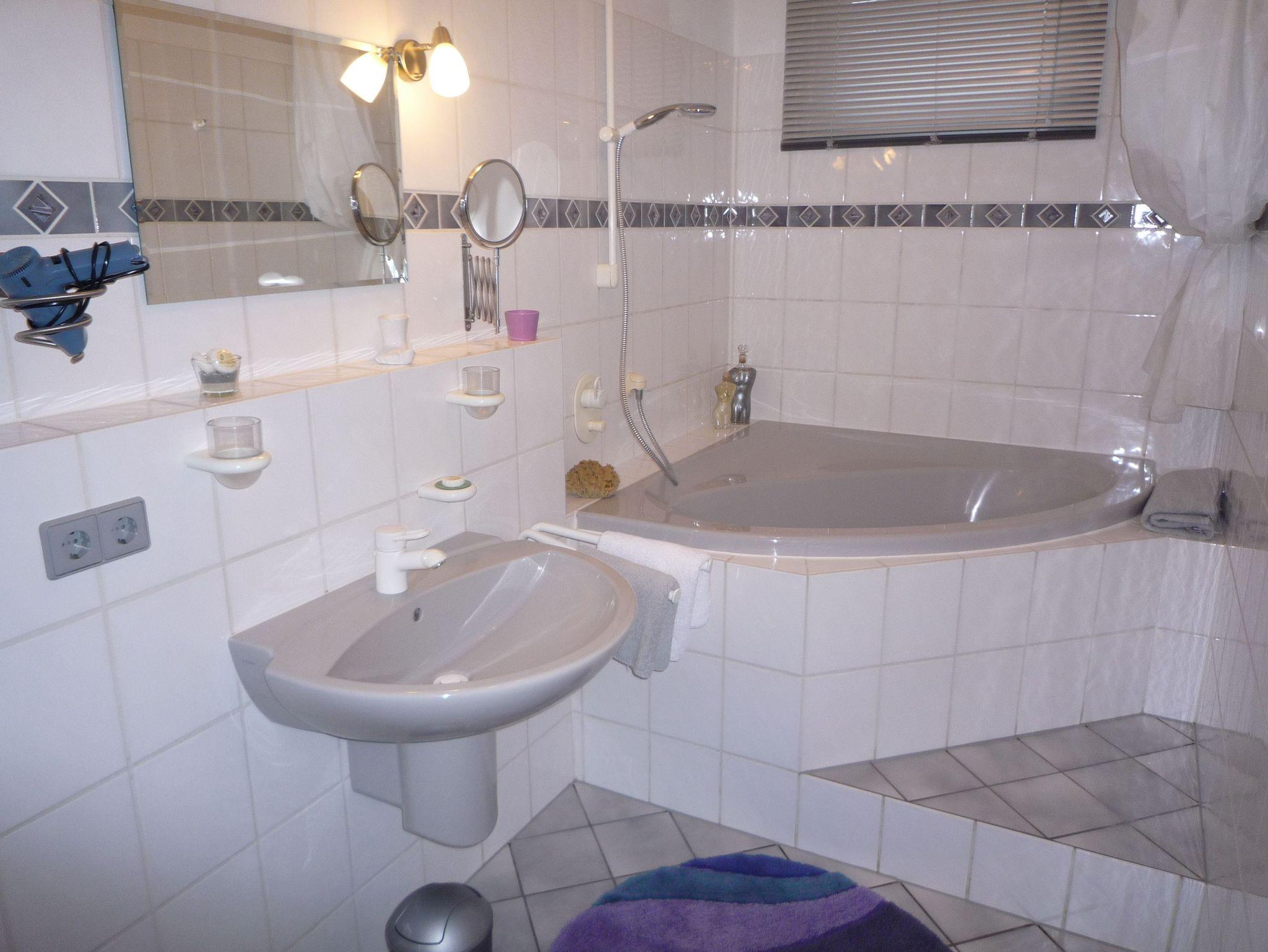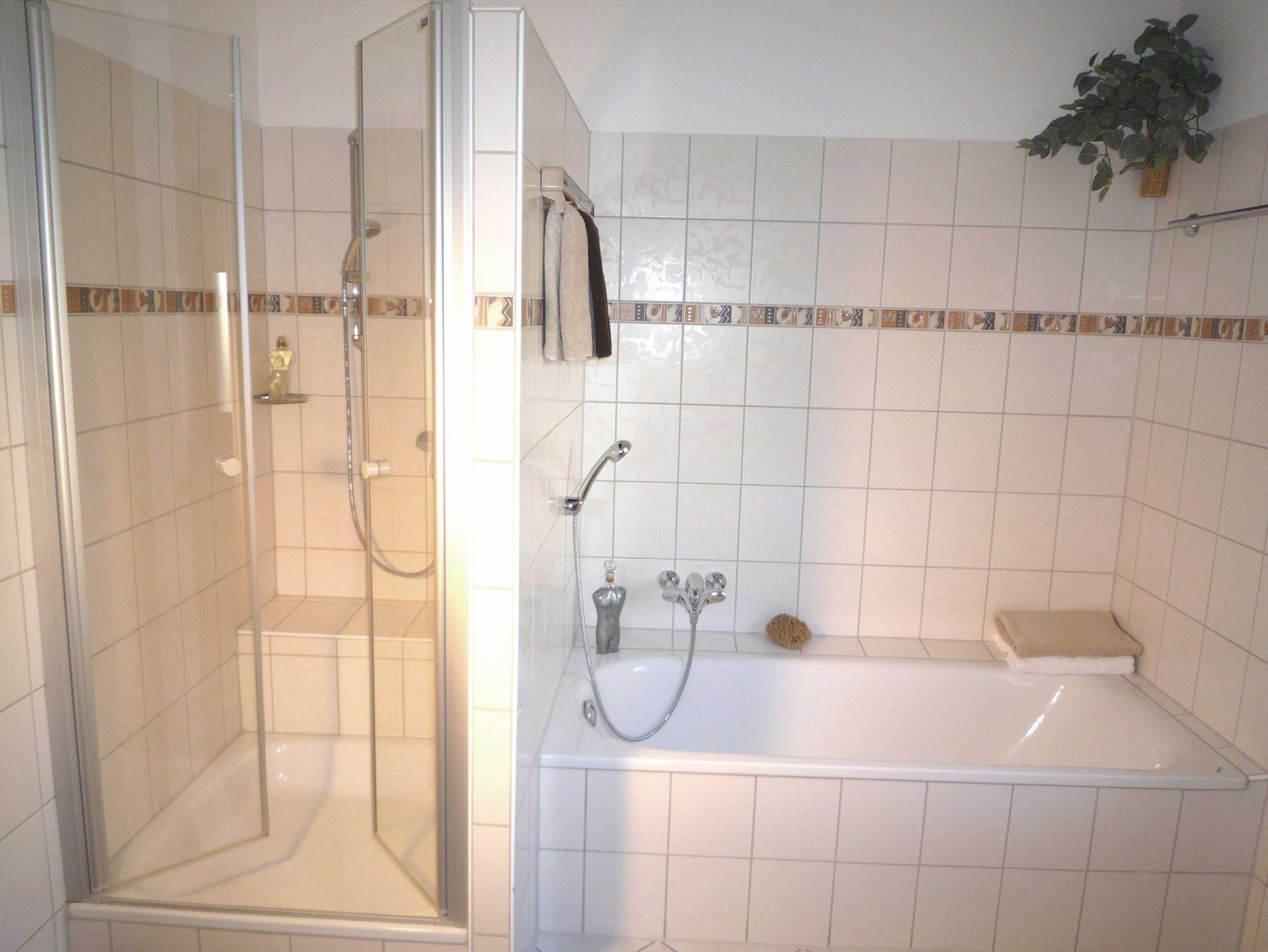 Das geräumige Badezimmer mit Dusche und Badewanne ist eine wahre Wohlfühloase.