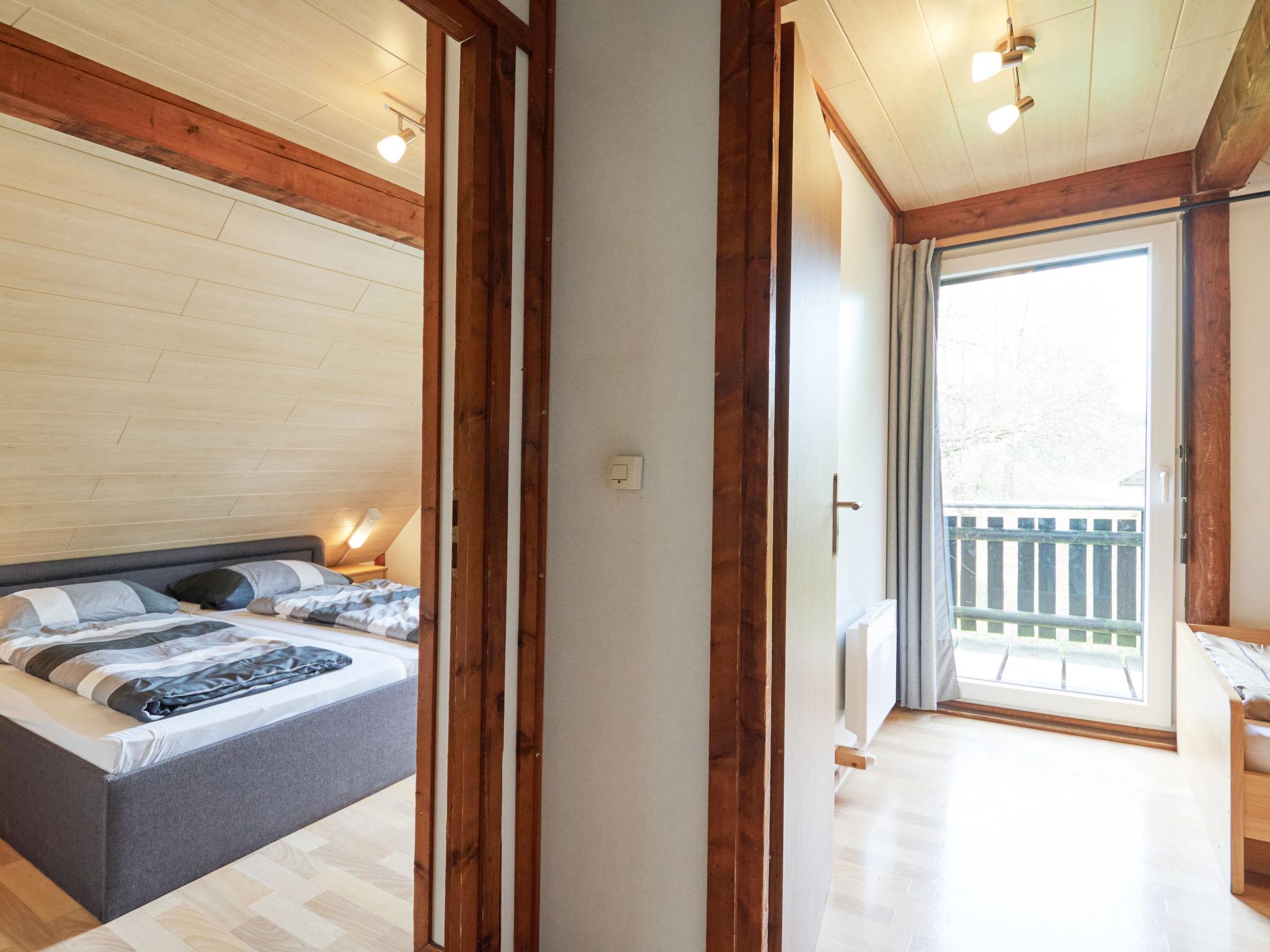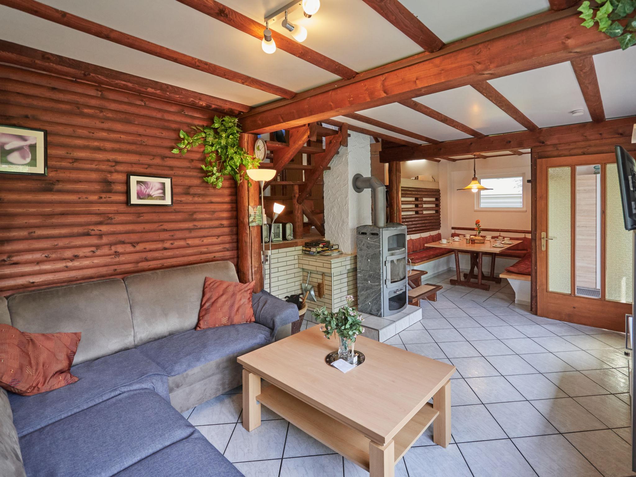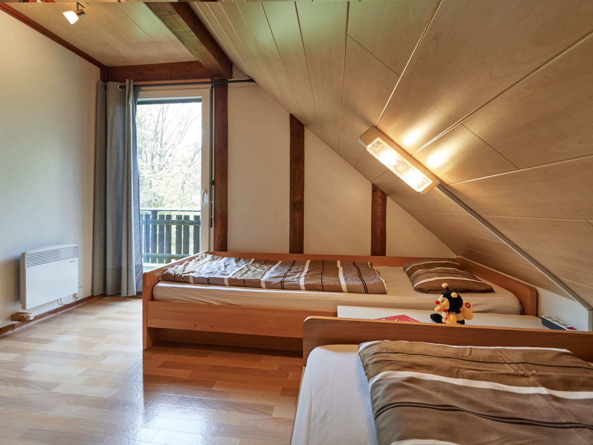 "Sigi", 4-room house 75 m2 on 2 levels, on the ground floor. Modern and wooden furniture furnishings: living/dining room 25 m2 with cable TV (flat screen), hi-fi system, wood-burning stove and air conditioning. Exit to the terrace, to the patio. 1 room 12 m2 with 1 double bed (180 cm, length 200 cm), hand-basin and separate WC. Open kitchen 8 m2 (oven, dishwasher, 4 ceramic glass hob hotplates, kettle, microwave, electric coffee machine). Shower, sep. WC. Upper floor: (spiral staircase), 1 room 12 m2, with sloping ceilings with 1 double bed (180 cm, length 200 cm), hand-basin. Exit to the balcony. 1 room 11 m2, with sloping ceilings with 2 beds (90 cm, length 200 cm). Exit to the balcony. Electric heating. Small balcony 5 m2, south facing position, large terrace 20 m2 partly roofed, patio, lawn 100 m2. Terrace furniture, balcony furniture. View of the forest. Facilities: logs (extra). Internet (WiFi, free). Please note: non-smoking house. Smoke alarm, fire extinguisher. On the ground floor, the rooms are connected by stairs (mezzanine). Bookings accepted for holiday purposes only.