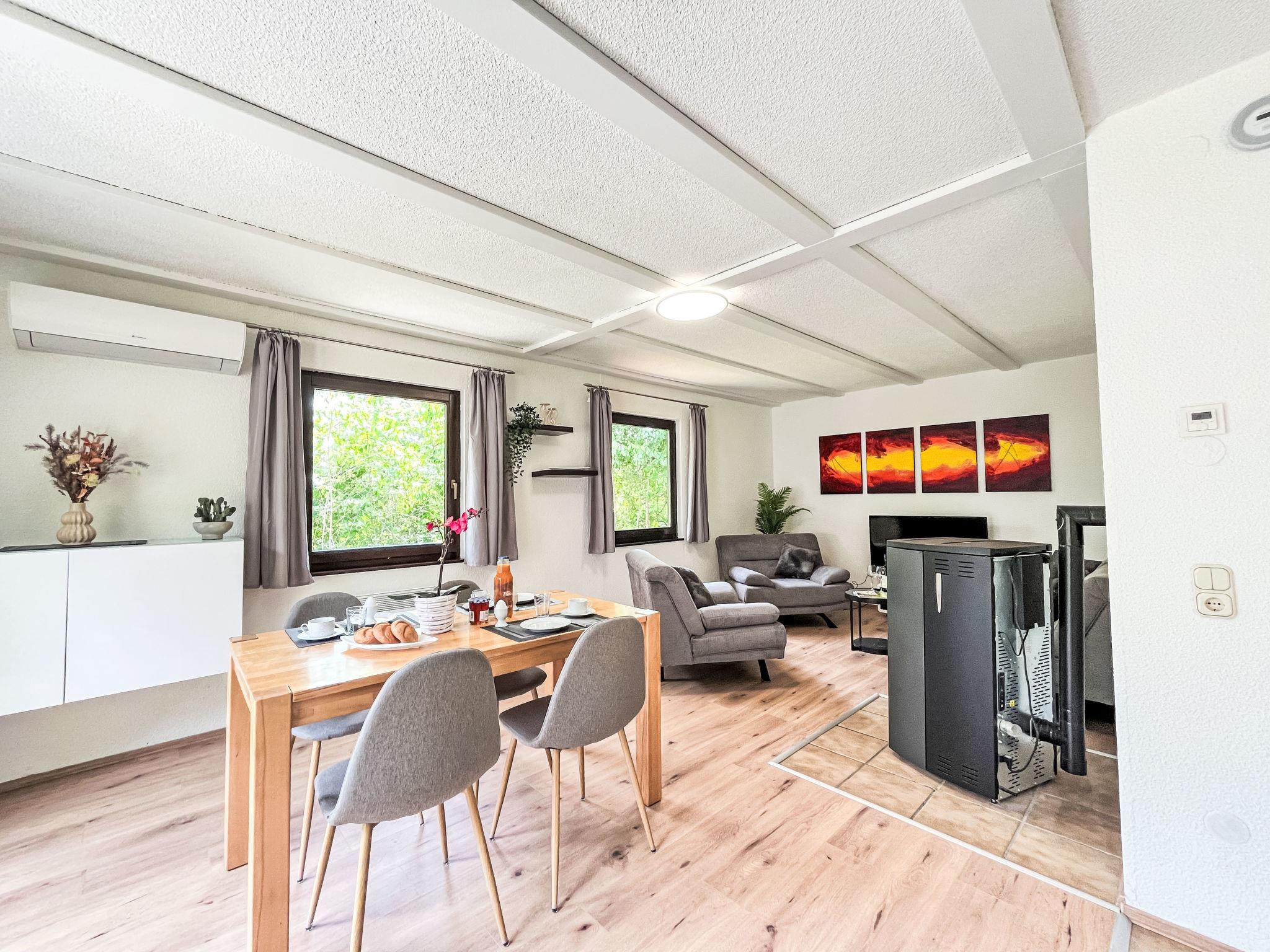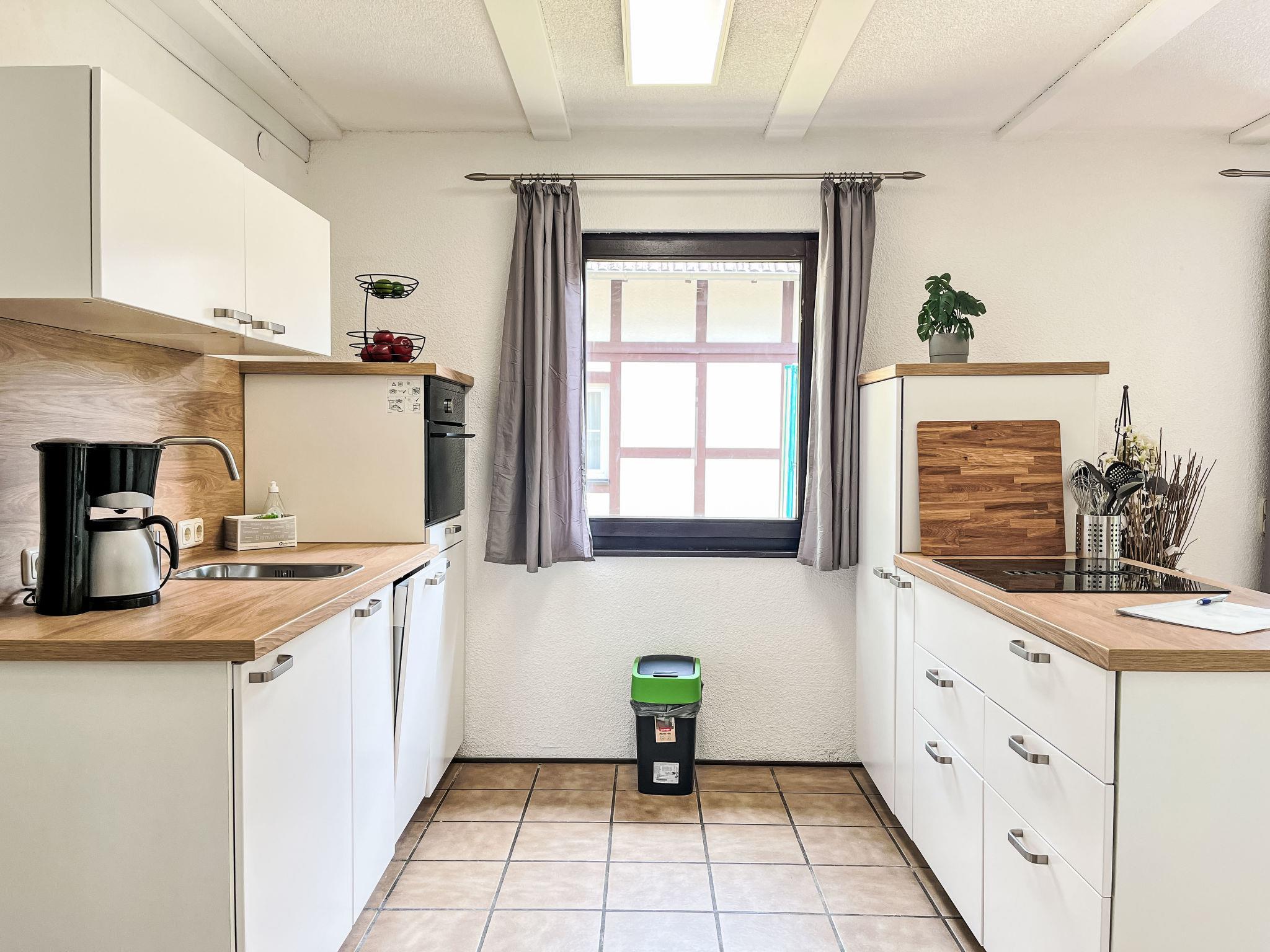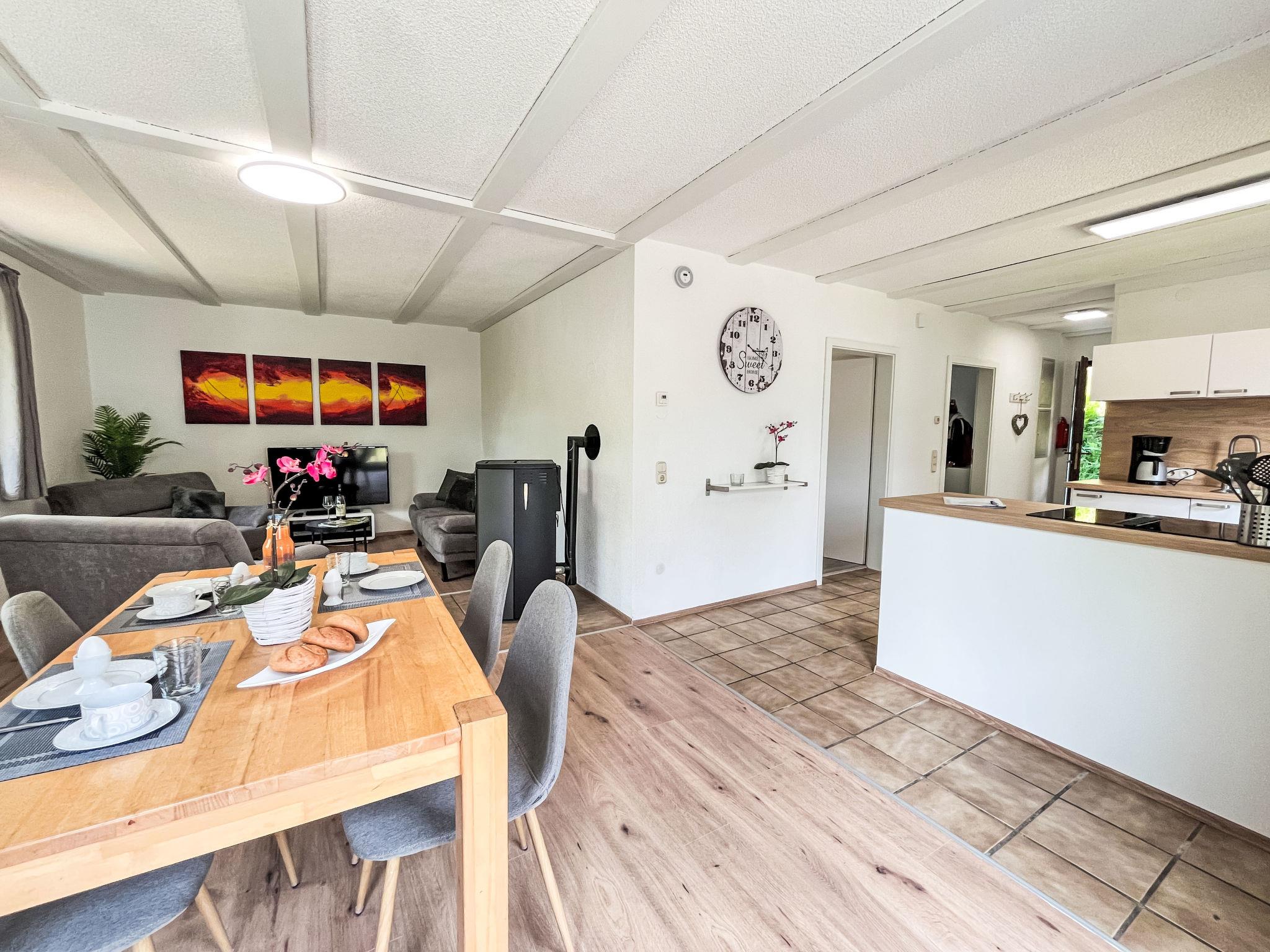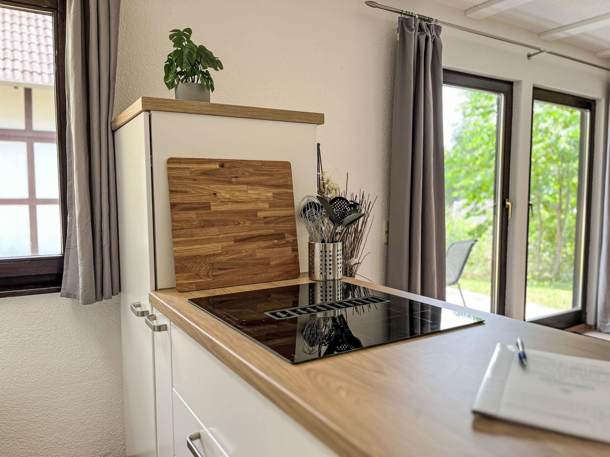 "Dornröschen", 3-room apartment 65 m2, lower ground floor. Fully renovated in 2025, beautiful and cosy furnishings: living/dining room 40 m2 with dining nook and satellite TV (flat screen), wood-burning stove. Exit to the garden, to the terrace. 1 room 10 m2 with 1 double bed (180 cm, length 190 cm). 1 room 10 m2 with 1 bed (90 cm, length 200 cm). Open kitchen (oven, 4 induction hot plates, toaster, kettle, electric coffee machine, combination microwave). Shower/WC. Electric heating. Terrace 30 m2. Terrace furniture. Facilities: washing machine, iron, children's high chair, logs (extra). Internet (WiFi, free). Parking at the house. Please note: non-smokers only. Smoke alarm, fire extinguisher. Netflix (free). Access to the apartment via 20 steps. Apartment will be renovated by April, pictures only example. Bookings accepted for holiday purposes only.