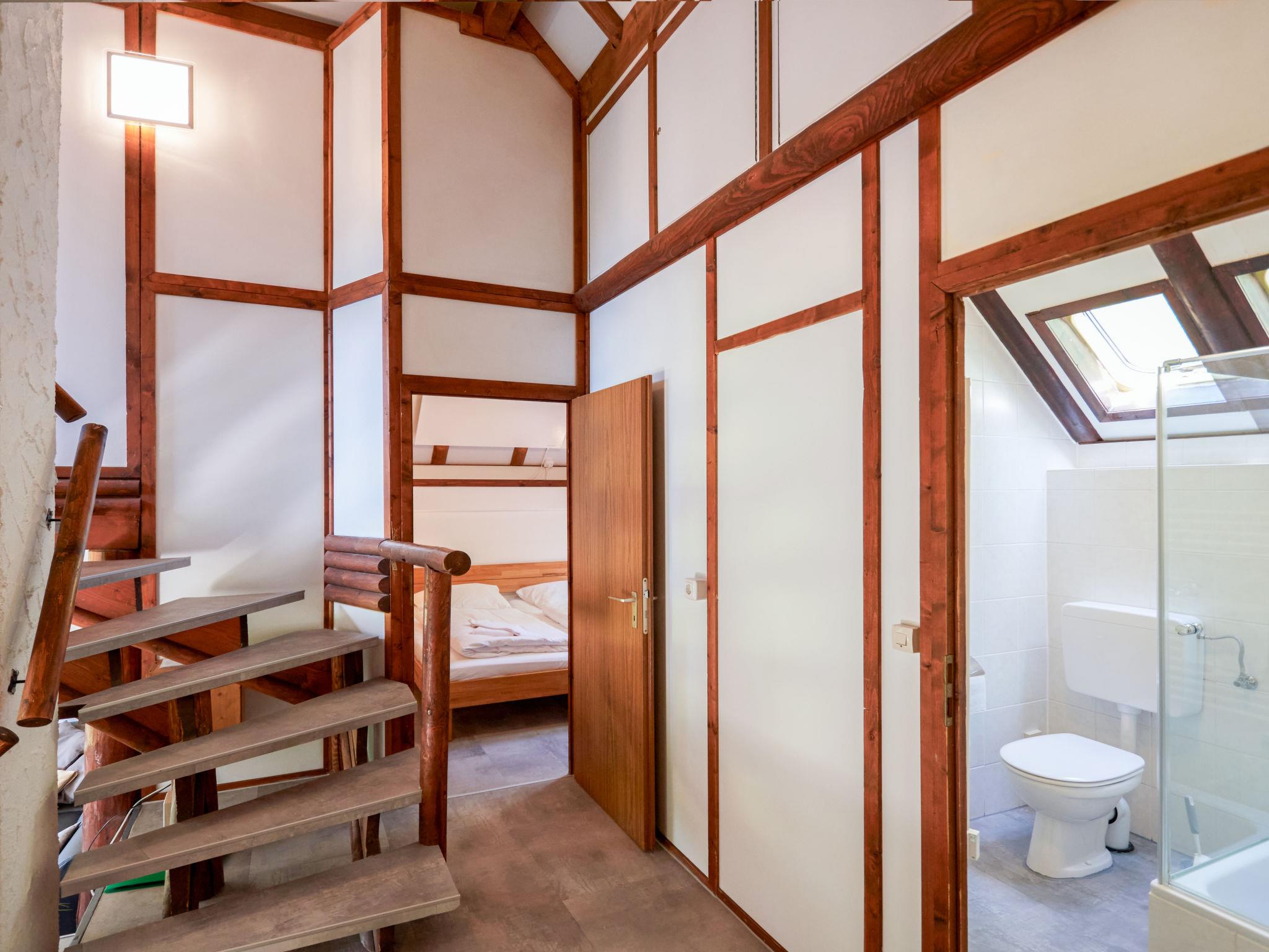 "Mary", 4-room house 75 m2 on 2 levels, on the ground floor. Partly renovated in 2022, cosy and wooden furniture furnishings: living/dining room 25 m2 with Scandinavian wood stove, dining nook and cable TV (flat screen), hi-fi system. Exit to the terrace, to the patio. 1 room 12 m2 with 1 double bed (180 cm, length 200 cm), hand-basin and separate WC. Open kitchen (oven, dishwasher, 4 ceramic glass hob hotplates, toaster, kettle, electric coffee machine). Shower/WC. Upper floor: (spiral staircase), 1 room 12 m2, with sloping ceilings with 1 double bed (180 cm, length 200 cm), hand-basin. Exit to the balcony. 1 room 11 m2, with sloping ceilings with 2 beds (90 cm, length 200 cm), hand-basin. Exit to the balcony. Electric heating. Small balcony 5 m2, south facing position, large terrace 20 m2 partly roofed, patio, lawn 100 m2. Terrace furniture, balcony furniture, barbecue (portable). Facilities: children's high chair, logs (extra). Internet (WiFi, free). Please note: non-smoking house. Maximum 2 pets/ dogs allowed. Smoke alarm, fire extinguisher. On the ground floor, the rooms are connected by stairs (mezzanine). Bookings accepted for holiday purposes only. 02622620084