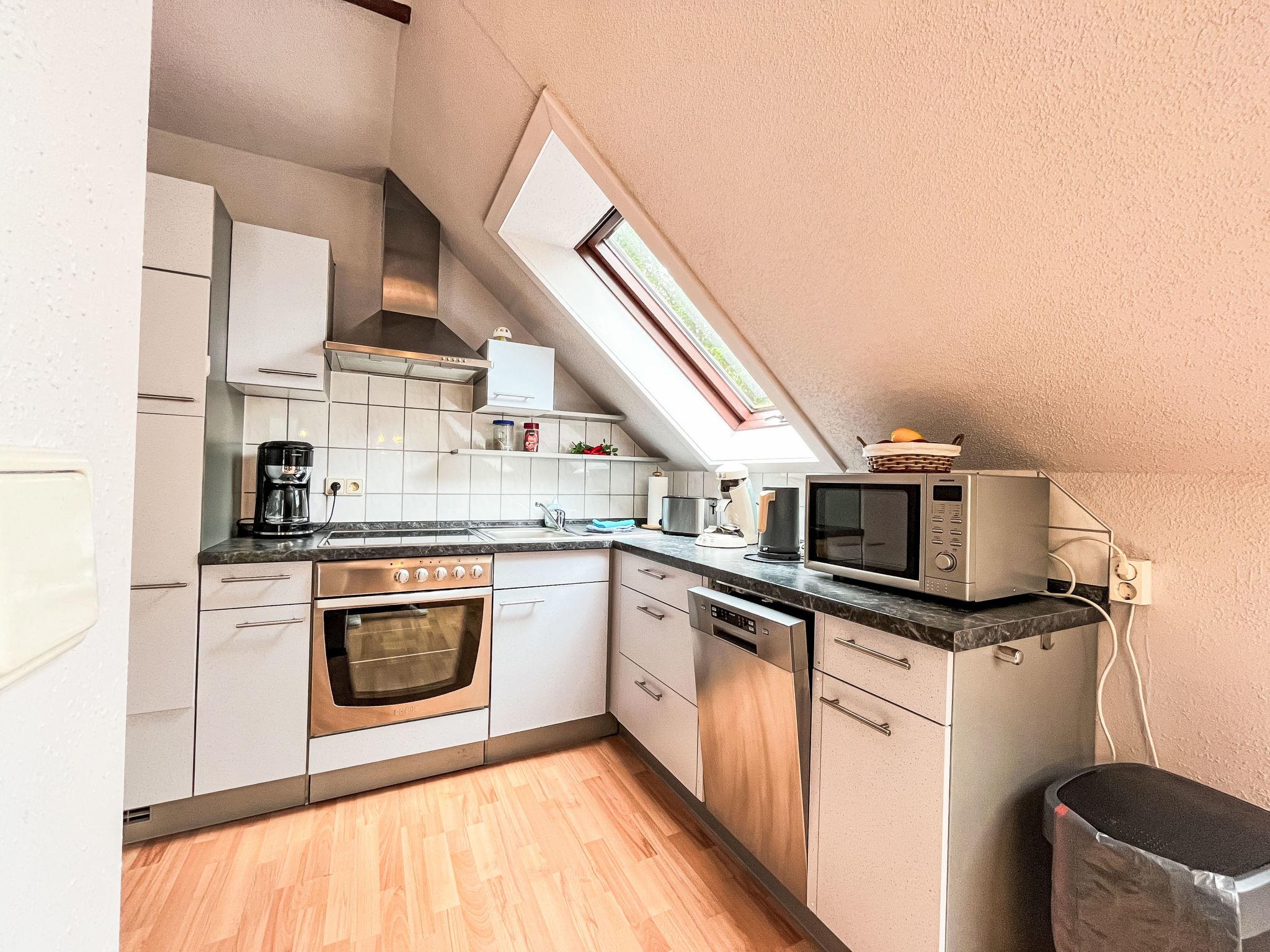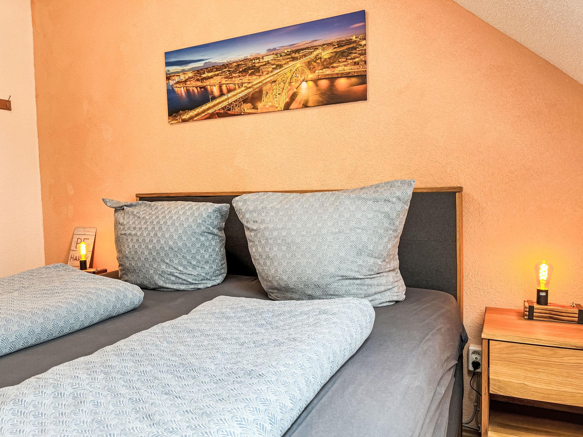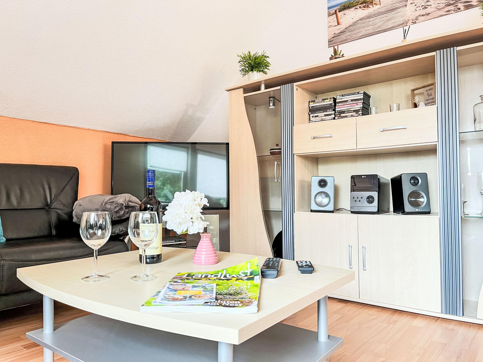 "Sternberg 225", 3-room apartment 75 m2 on 1st floor. Modern and cosy furnishings: living/dining room with Scandinavian wood stove, satellite TV and radio. Exit to the balcony. 1 room with 1 double bed. 1 room with 2 beds. Open kitchen (oven, dishwasher, 4 ceramic glass hob hotplates, toaster, kettle, microwave, freezer, electric coffee machine, Capsules for coffee machine (Senseo)). Shower/WC. Electric heating. Large balcony. Balcony furniture. Facilities: washing machine, children's high chair, baby cot, hair dryer. Internet (WiFi, free). Please note: non-smokers only. Maximum 2 pets/ dogs allowed. Smoke alarm, fire extinguisher.