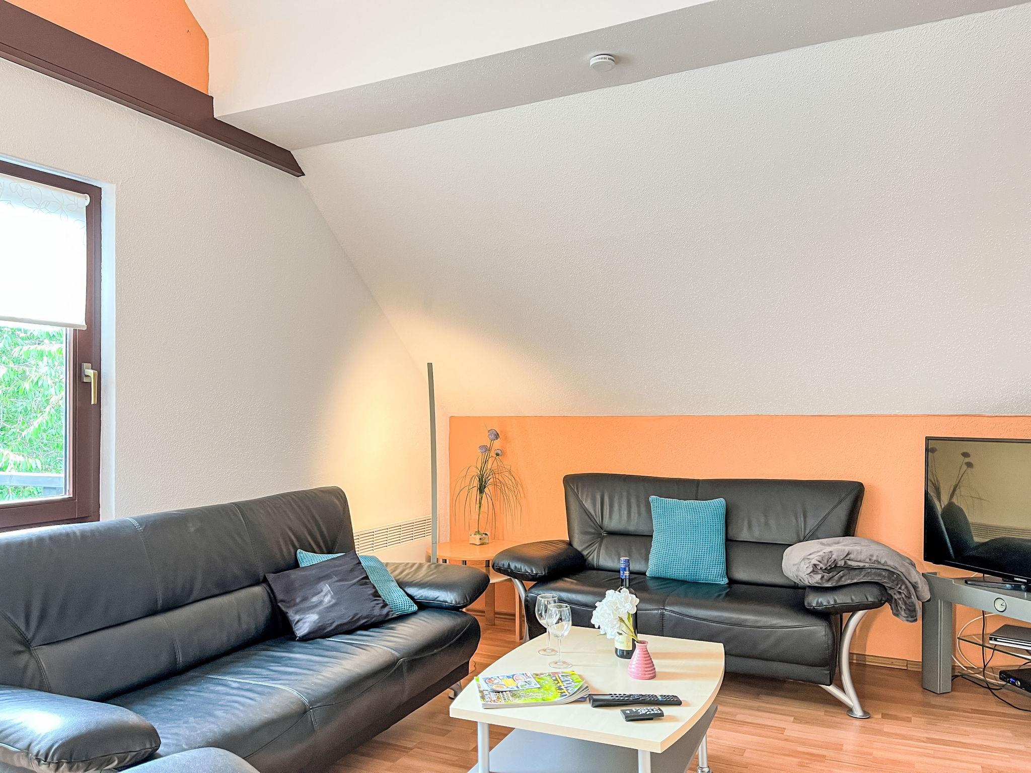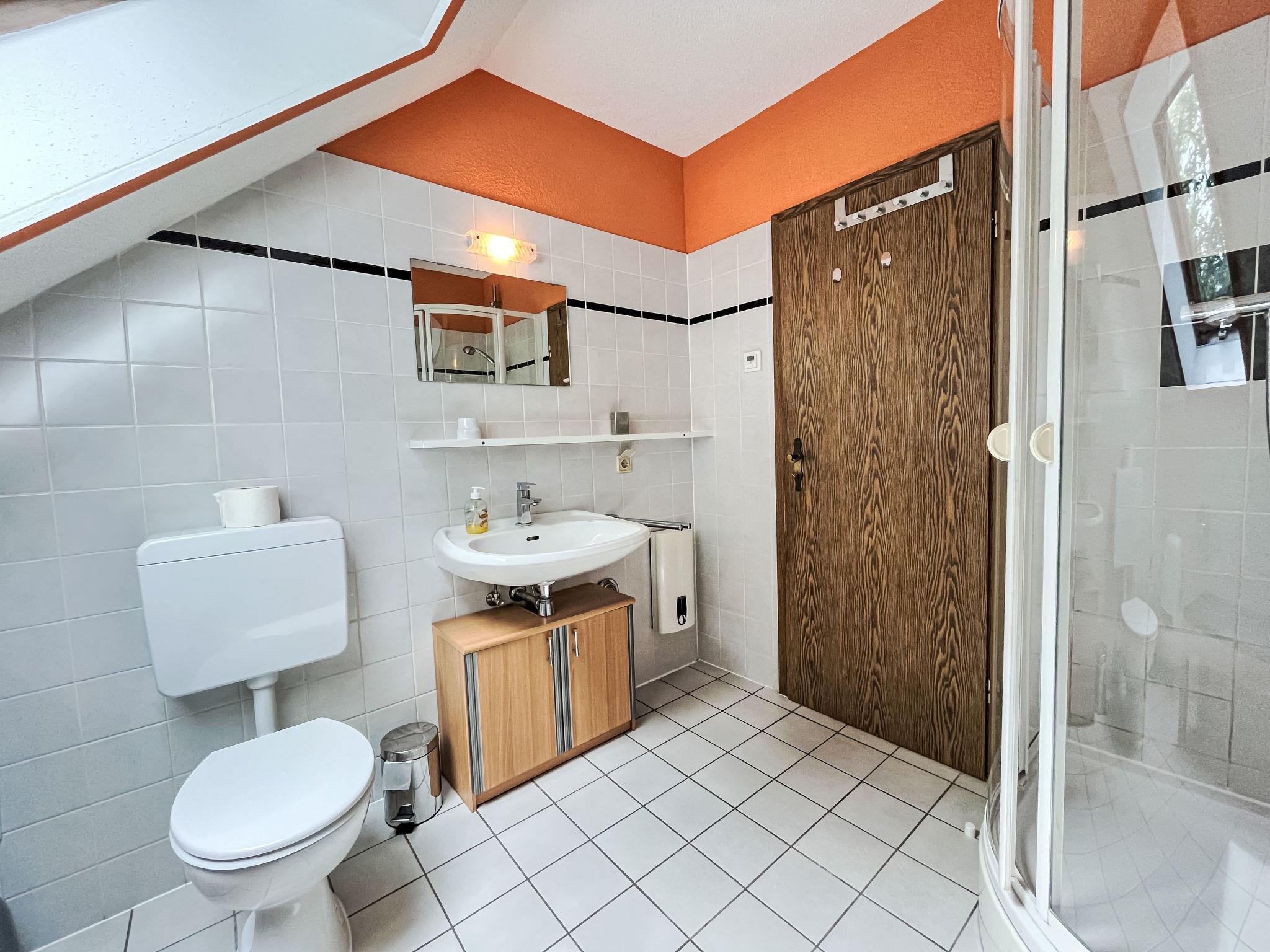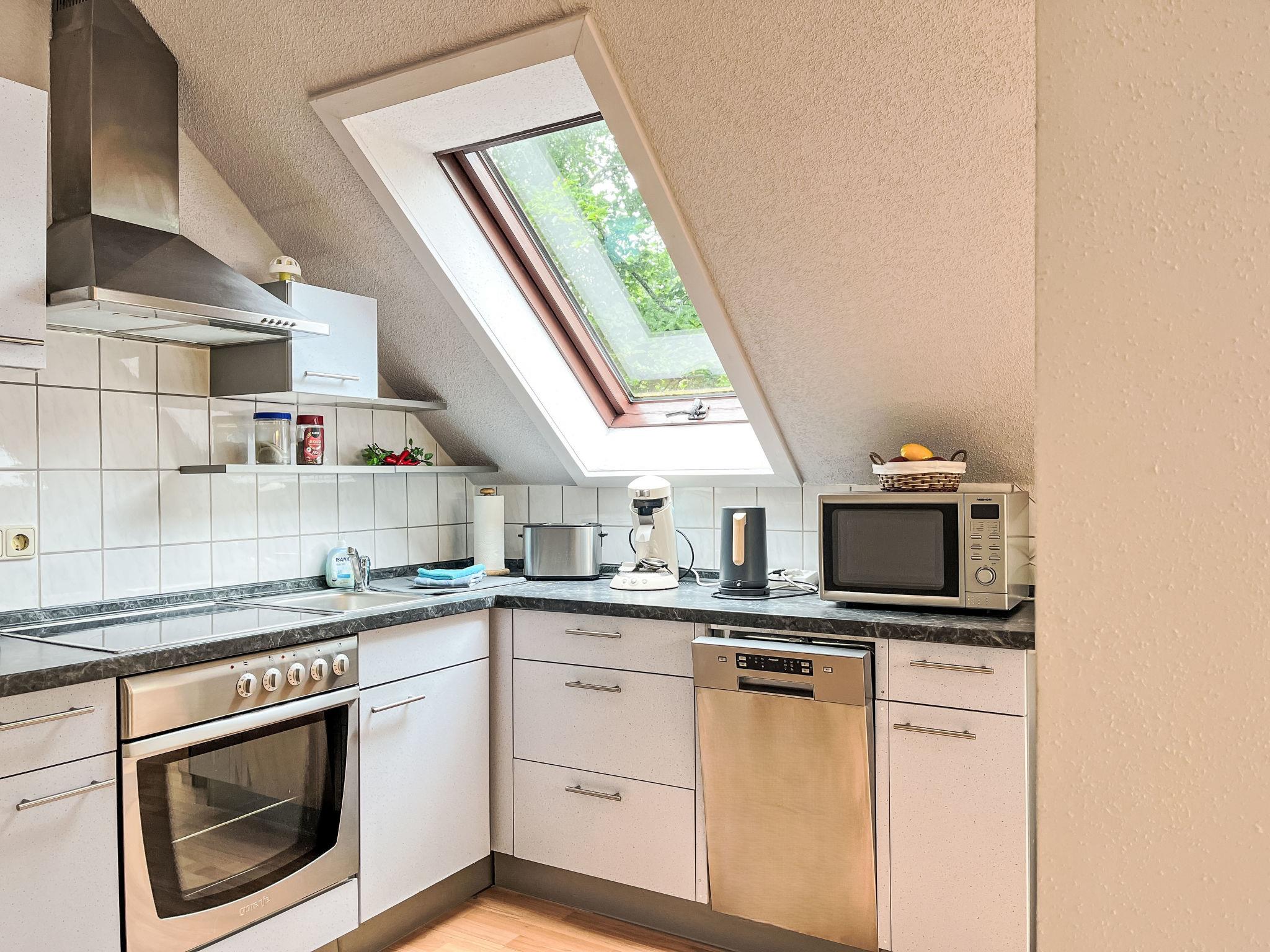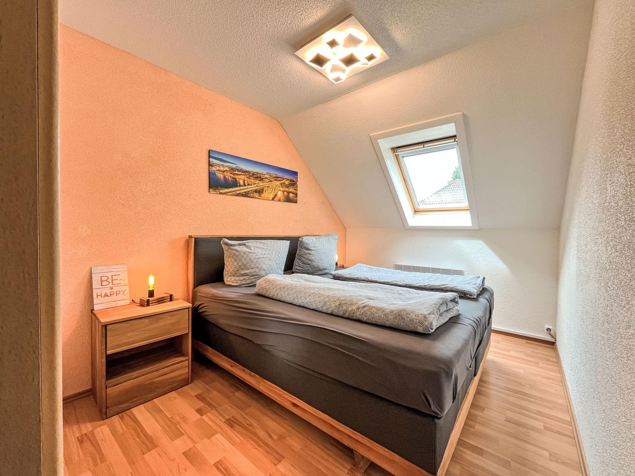 "Sternberg 225", 3-room apartment 75 m2 on 1st floor. Modern and cosy furnishings: living/dining room with Scandinavian wood stove, satellite TV and radio. Exit to the balcony. 1 room with 1 double bed. 1 room with 2 beds. Open kitchen (oven, dishwasher, 4 ceramic glass hob hotplates, toaster, kettle, microwave, freezer, electric coffee machine, Capsules for coffee machine (Senseo)). Shower/WC. Electric heating. Large balcony. Balcony furniture. Facilities: washing machine, children's high chair, baby cot, hair dryer. Internet (WiFi, free). Please note: non-smokers only. Maximum 2 pets/ dogs allowed. Smoke alarm, fire extinguisher.