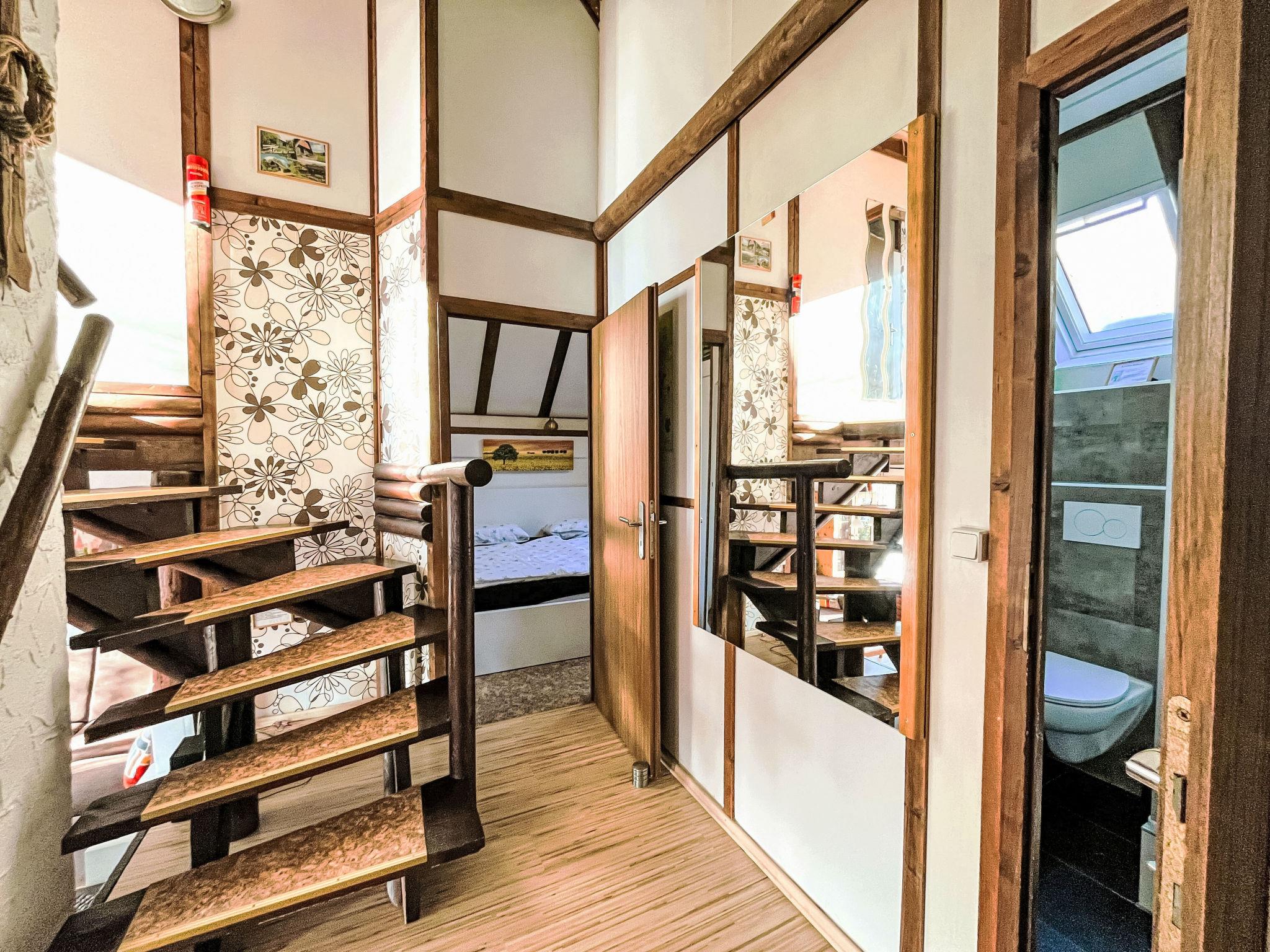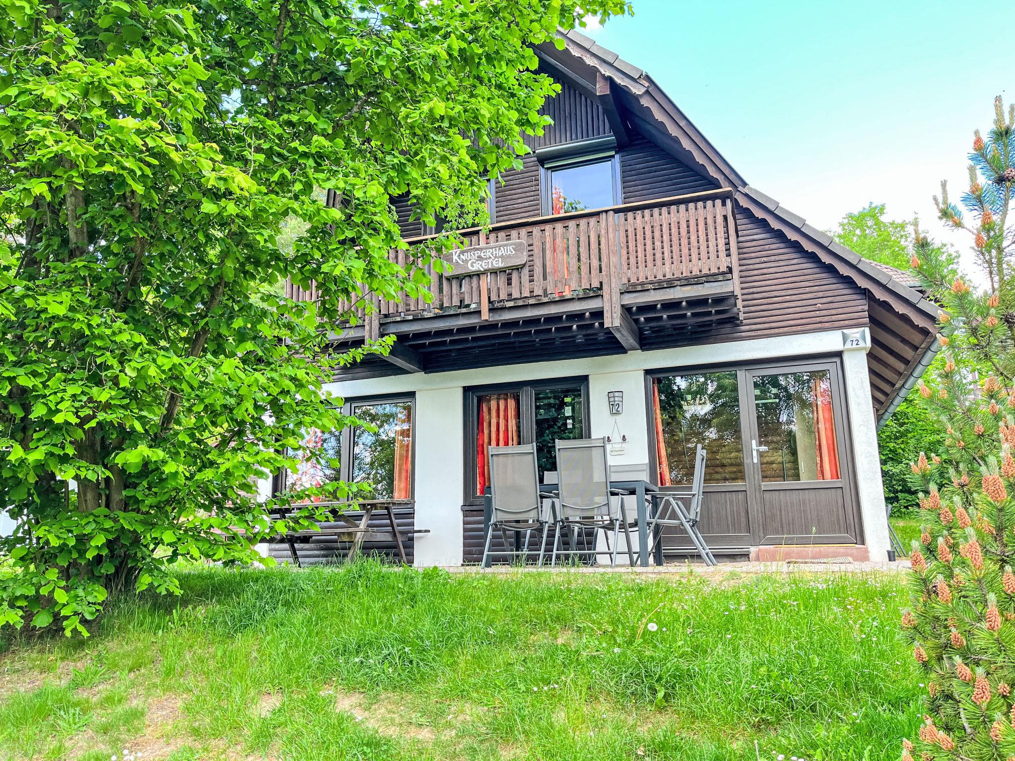 "Knusperhaus Gretel", 4-room house 75 m2 on 2 levels. Object suitable for 6 adults. Partly with sloping ceilings, cosy and wooden furniture furnishings: living/dining room with Scandinavian wood stove, dining nook and cable TV (flat screen), hi-fi system. Exit to the terrace, to the patio. 1 room 12 m2 with 1 double bed (180 cm, length 200 cm). Open kitchen 8 m2 (oven, dishwasher, 4 ceramic glass hob hotplates, toaster, kettle, microwave, electric coffee machine). Sep. WC. Upper floor: (spiral staircase), 1 room 12 m2, with sloping ceilings with 1 double bed (200 cm, length 200 cm), electric shutters. Exit to the balcony. 1 room 11 m2, with sloping ceilings with 2 beds (100 cm, length 200 cm), electric shutters. Shower/WC. Electric heating. Small balcony 5 m2, south facing position, large terrace 30 m2 partly roofed, lawn 100 m2. Terrace furniture, balcony furniture. Facilities: children's high chair, baby cot for up to 2 year olds. Internet (WiFi). Parking. Please note: suitable for families. Non-smoking house. Maximum 2 pets/ dogs allowed. Smoke alarm, fire extinguisher. CO² alarm available. Pellet stove: 1x pellets (15kg) is available free of charge from 1st November to 1st March. 1 free roll per person for the first breakfast of the holiday, 1 bag of gummy bears and 1 bottle of sparkling wine as a welcome.
