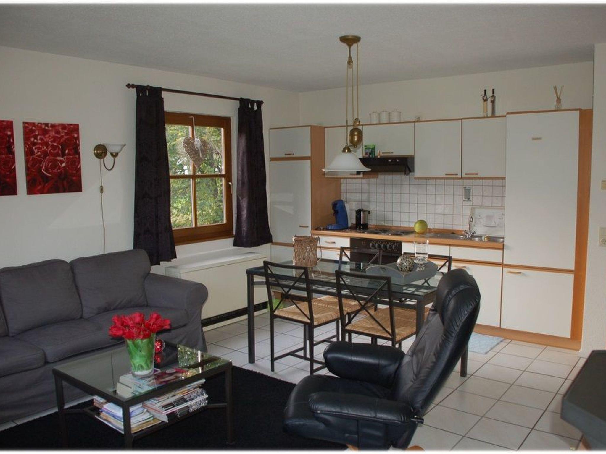 Inside the ground-floor holiday home, a family-friendly atmosphere awaits you on a living space of approx. 70 m². The fully heated accommodation includes a spacious living and dining area with a fully equipped fitted kitchen, pellet stove and satellite TV for cosy evenings. Three bedrooms, each with two single beds, ensure a comfortable night's sleep. Further facilities include a shower room, a guest toilet and an inviting hallway area. For the youngest guests, a high chair and a travel cot can be added on request for a small fee.