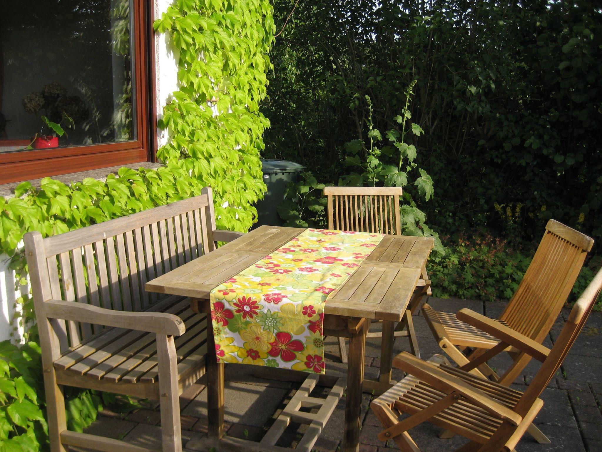 Die Ferienwohnung befindet sich im Erdgeschoss eines Einfamilienhauses und hat direkten Zugang zu Terrasse und Garten. Auf der Terrasse sind Gartenmöbel und eine Markise vorhanden. Ein Parkplatz und ein Fahrradunterstand stehen für unsere Gäste bereit.