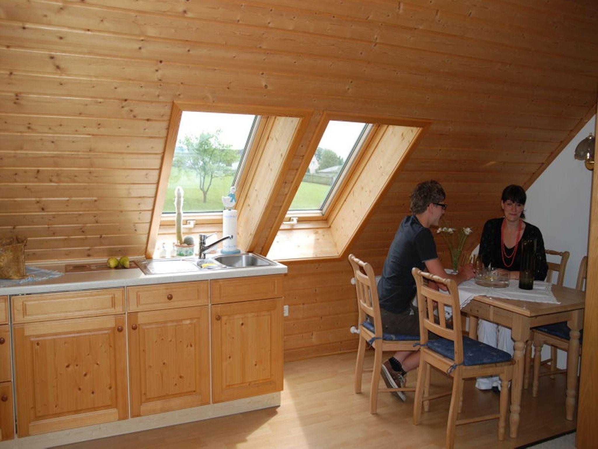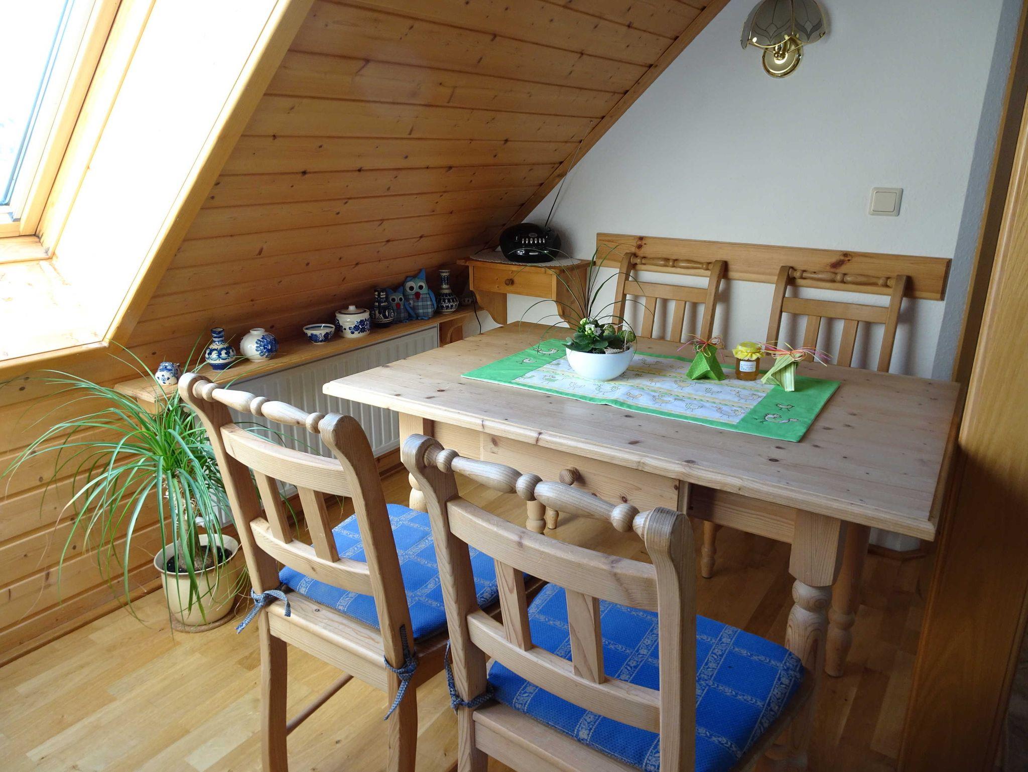 Die Ferienwohnung ist ca. 75 qm groß, befindet sich im Dachgeschoss des Hauses, ist gemütlich und modern mit vielen liebevollen Details eingerichtet. Sie hat einen großen Wohn- und Aufenthaltsraum mit einer modernen Küchenzeile, ein Schlafzimmer für 2 Personen und ein 2. kleines Schlafzimmer, ebenfalls für 2 Personen. Das neu installierte Bad ist mit Wanne, Dusche und WC ausgestattet.