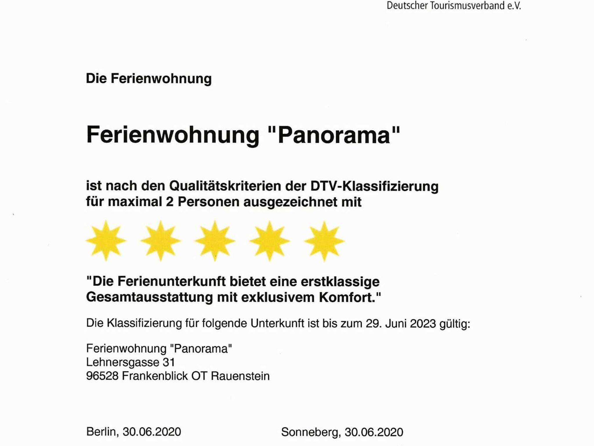 Unsere Ferienwohnung Panorama ***** bietet Ihnen einen herrlichen Ausblick weit in die Landschaft und auf den Ort Rauenstein. Die 75 qm große Wohnung ist komfortabel eingerichtet. Sie hat einen großen Wohnraum mit integrierter Küchenzeile, ein Schlafzimmer mit Doppelbett und ein kleines Zimmer mit 2 Einzelbetten, das auch als Lese- oder Ruhereum genutzt werden kann. Das Bad ist seit April 2017 neu installiert, hat eine Badewanne mit Dusche, Toilette und neue Badmöbel. Handtücher und Bettwäsche werden vom Haus gestellt. Der im Erdgeschoß befindliche Wintergarten steht für unsere Gäste zur freien Nutzung zur Verfügung. Eine großzügige Liegewiese, mehrere Sitzgruppen sowie Grillplatz, Tischtennis usw. laden zur Erholung und Entspannung ein.