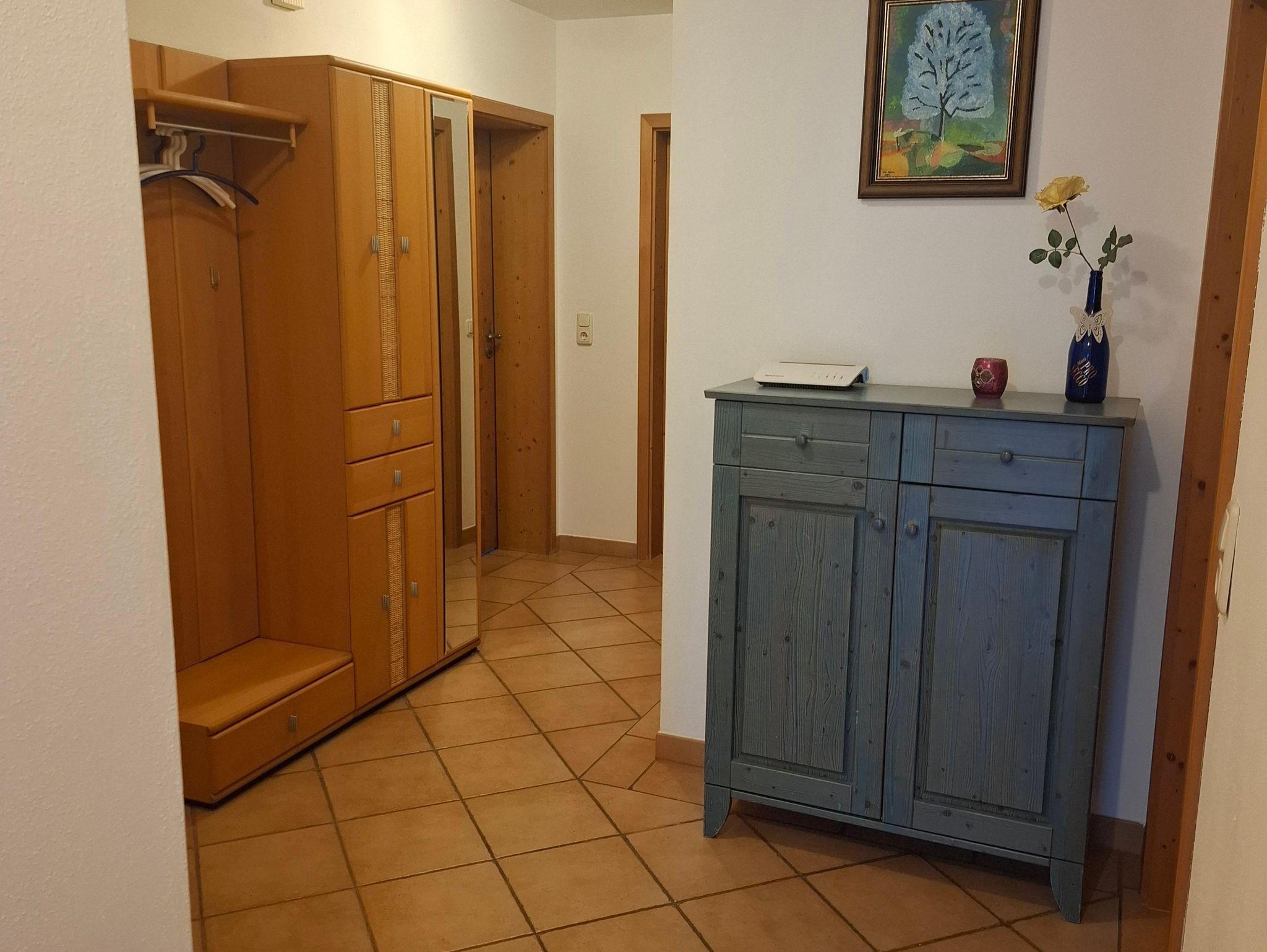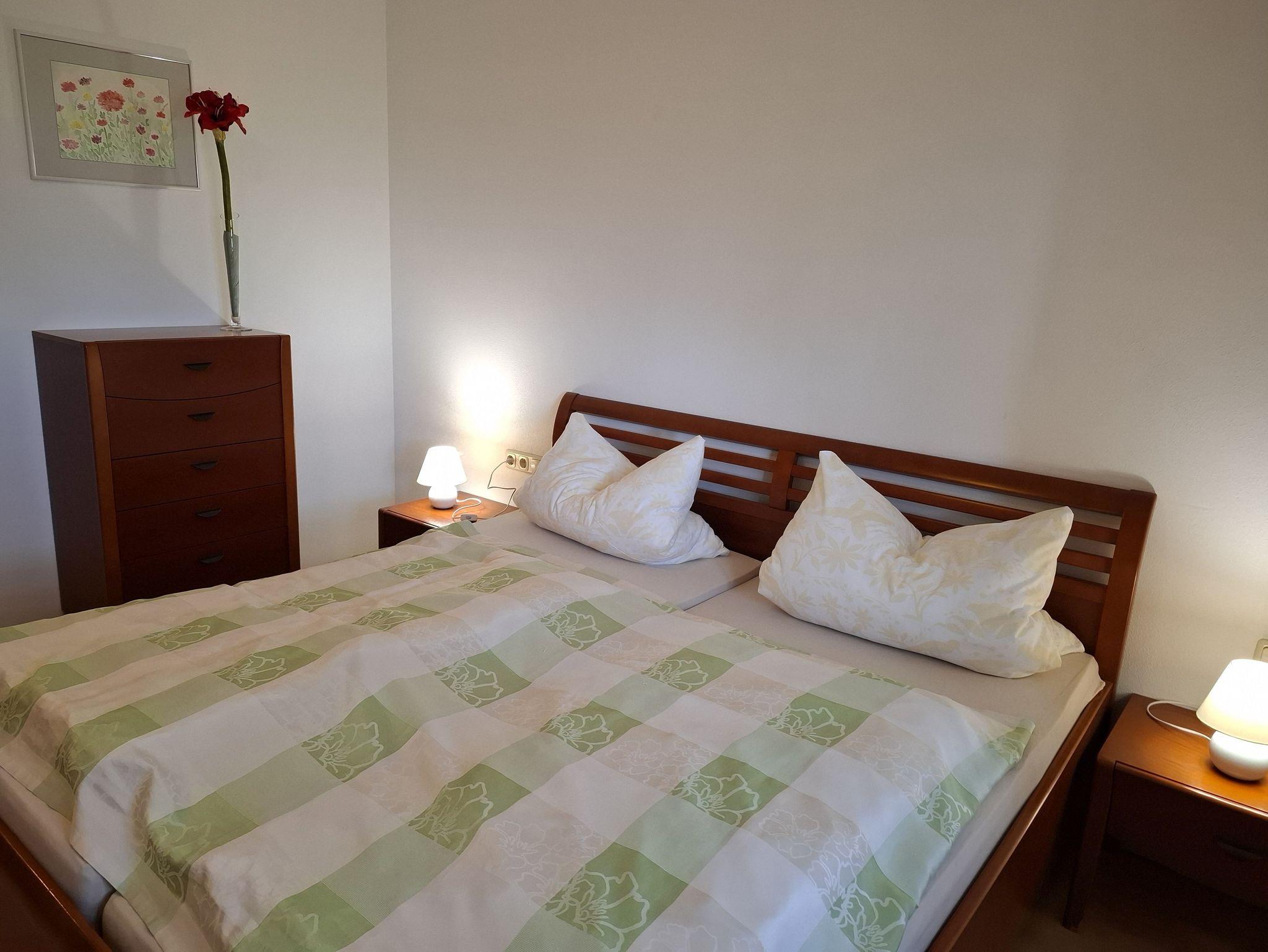 Voll ausgestattete Ferienwohnung im Erdgeschoß, 2 separate Schlafzimmer, Wohnküche, Geschirrspüler, kleines Büro, Süd- und Ostterrasse, Badezimmer mit Dusche und Badewanne, separates WC, TV und W-Lan.