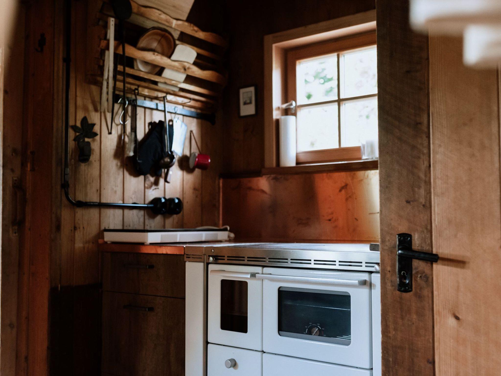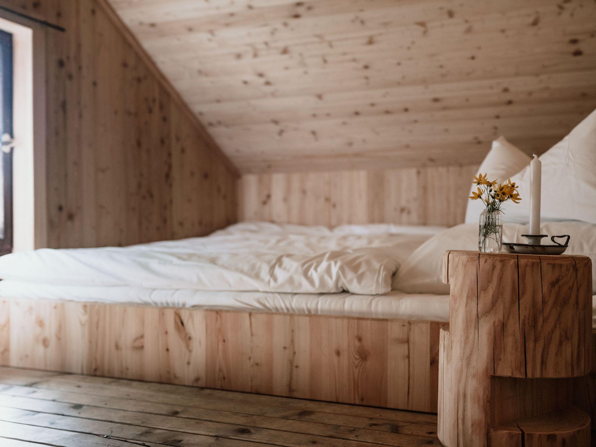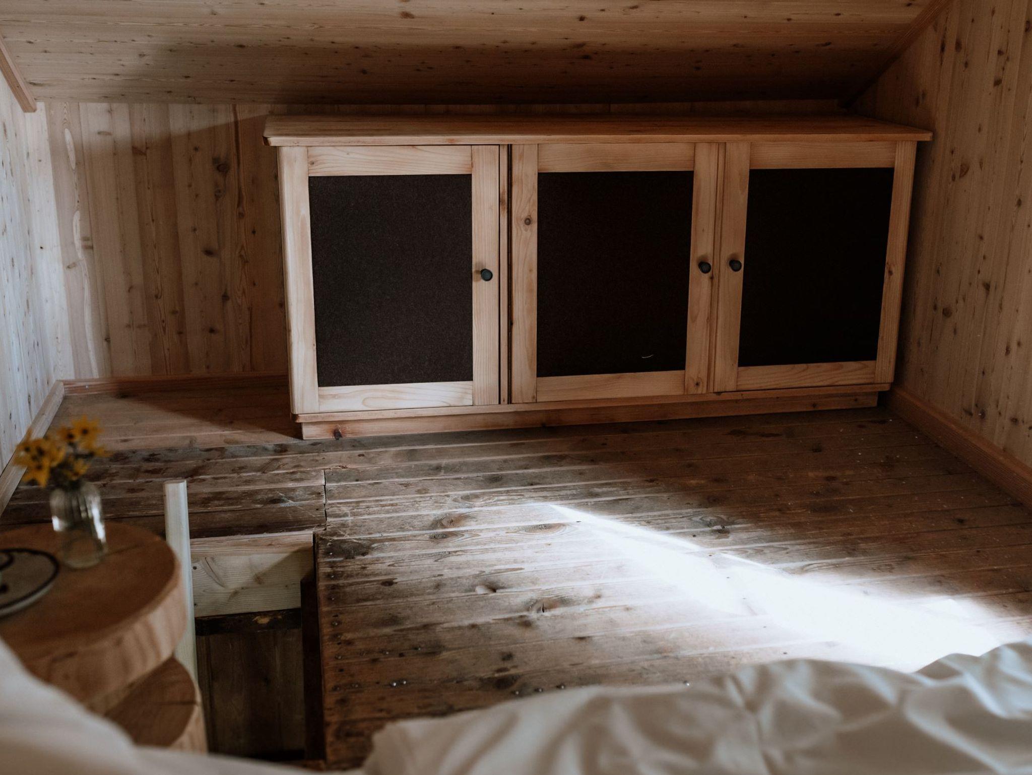 2022 renovierte Hütte, gut ausgestattete Wohnküche, Induktionskochfeld, Kühlschrank, Bad mit Dusche und Föhn, Büro mit W-LAN, 2 Schlafzimmer mit Doppelbett über Leiter zugänglich, Garten, Sonnenterrasse, Sonnenliegen, Sonnenschirm und Grill. Die Hütte wird nur mit dem Holzofen beheizt.