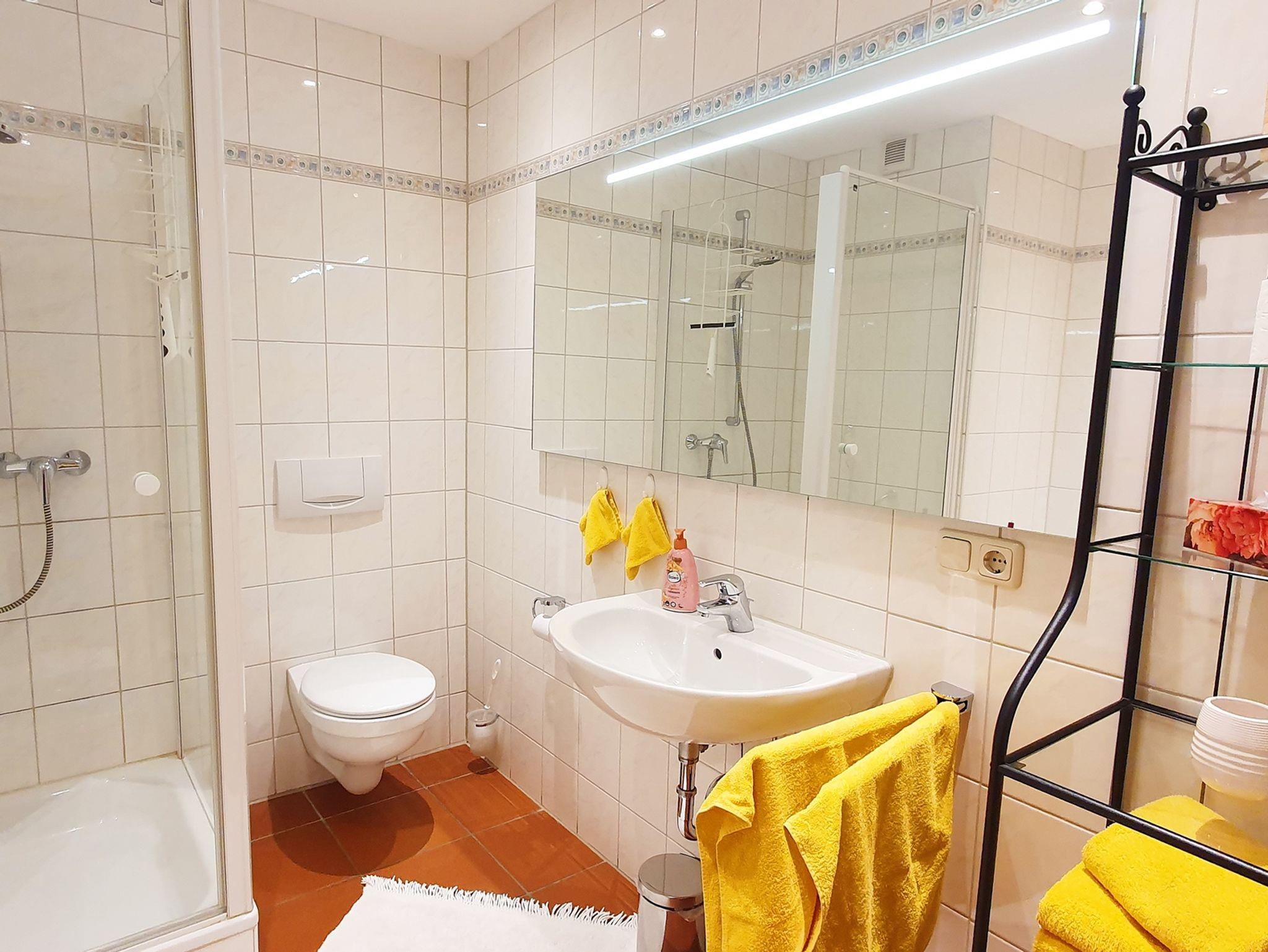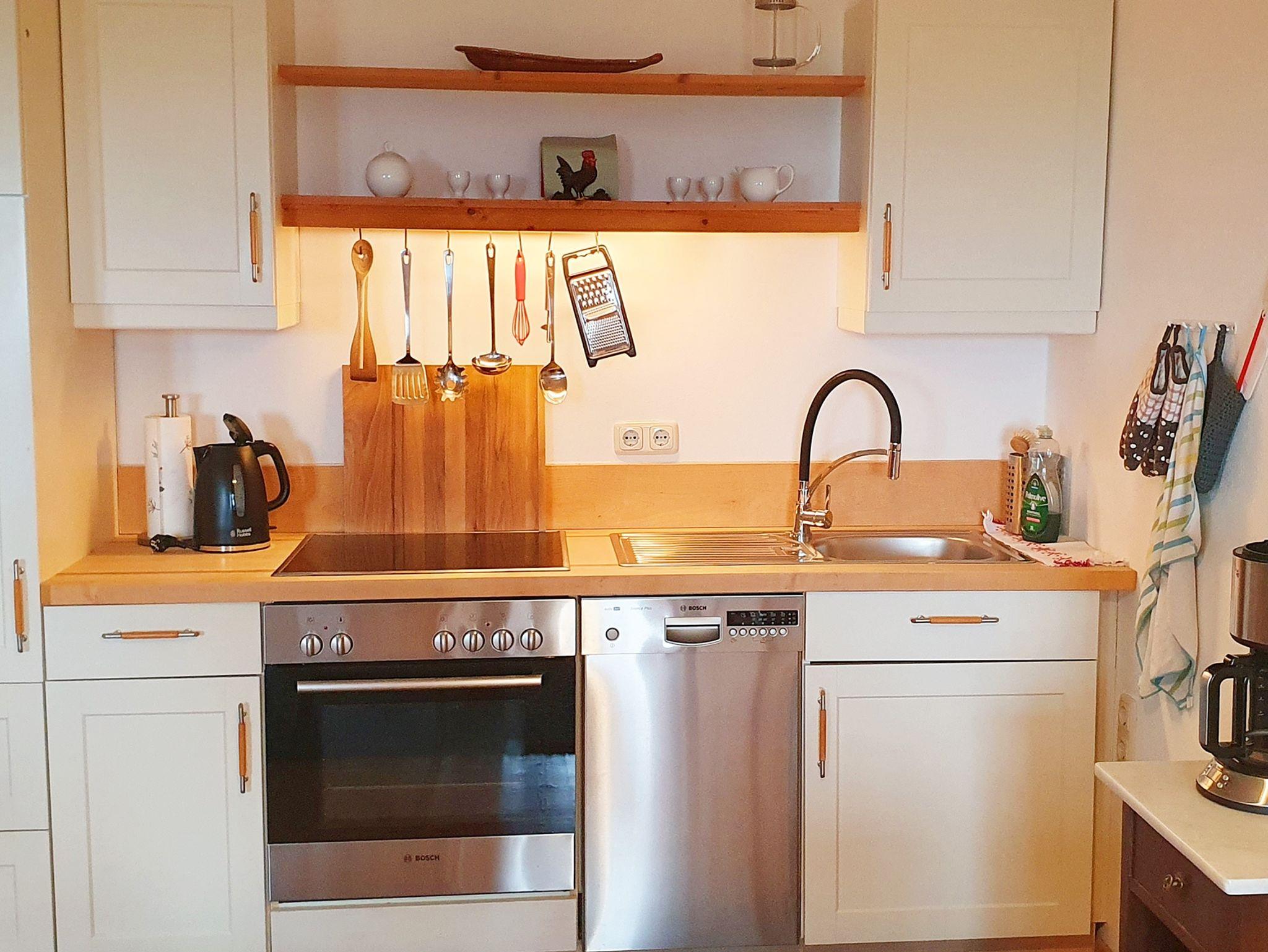Ferienwohnung im 1. Obergeschoß mit großem komfortablem Wohn/Schlafraum, Küchenzeile mit Spülmaschine, 1 großes Schlafzimmer mit Doppel- und Einzelbett, zusätzliches Kinderbett möglich, Bad mit Wanne DU/WC und Fußbodenheizung, Sat-TV, seperater Eingang, Balkon mit Balkonmöbel, Nichtraucher. W-LAN