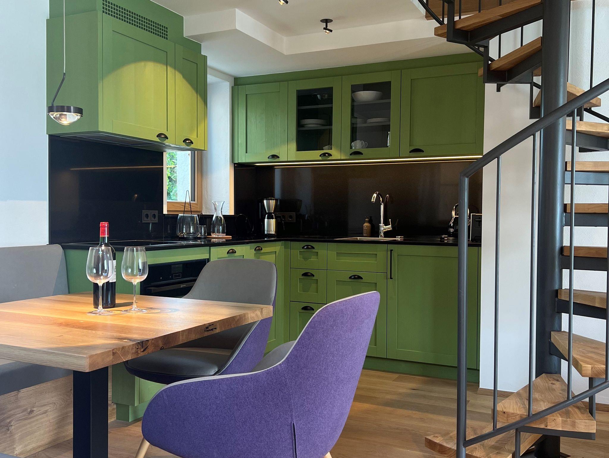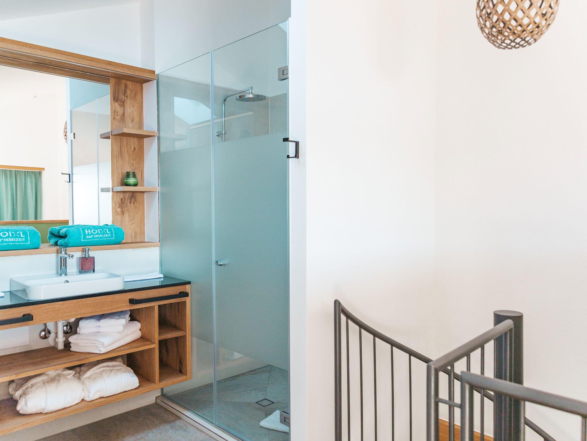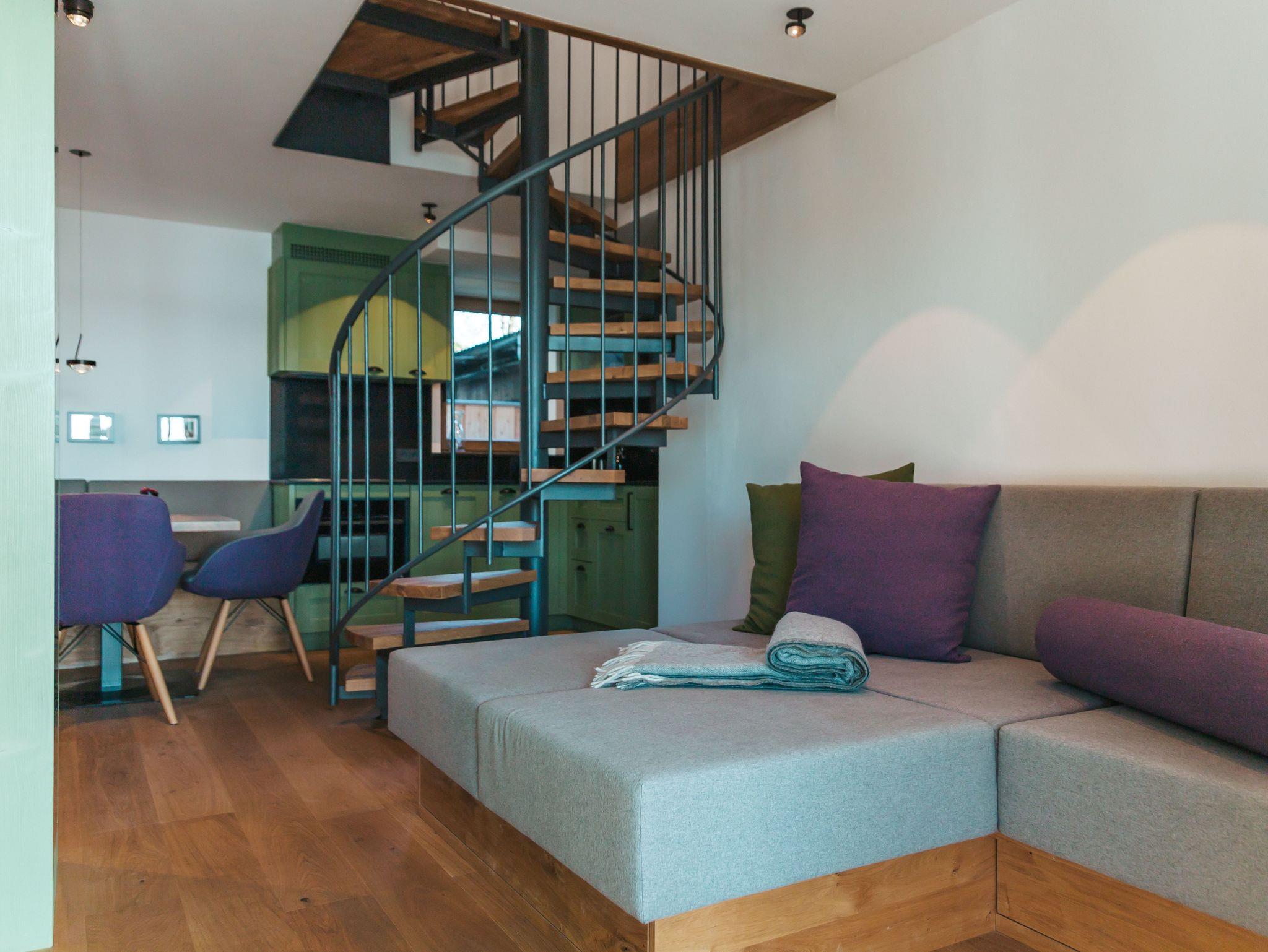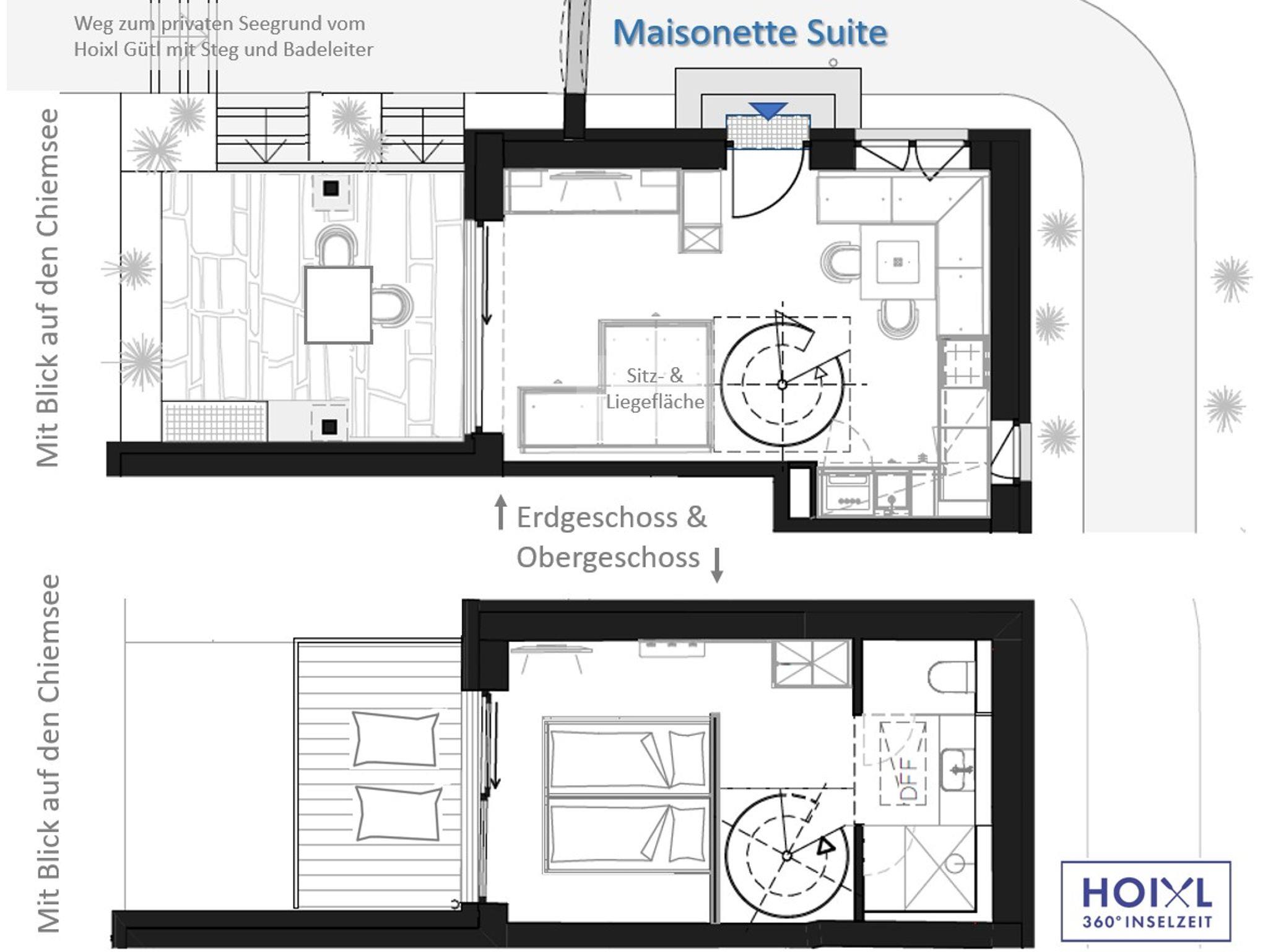 Die Maisonette Suite hat einen separaten Hauseingang und befindet sich auf 2 Etagen. Unten empfängt Sie eine großzügige Couch mit freiem Panormablick auf den See und privater Terrasse, von der Sie in wenigen Schritten ans Wasser gelangen. Oben erreichen Sie über die Wendeltreppe das auf den See ausgerichtete Doppelbett mit einem großzügigen Balkon davor, der über allem schwebt und auf dem zwei Lounge Sessel auf Sie warten.
