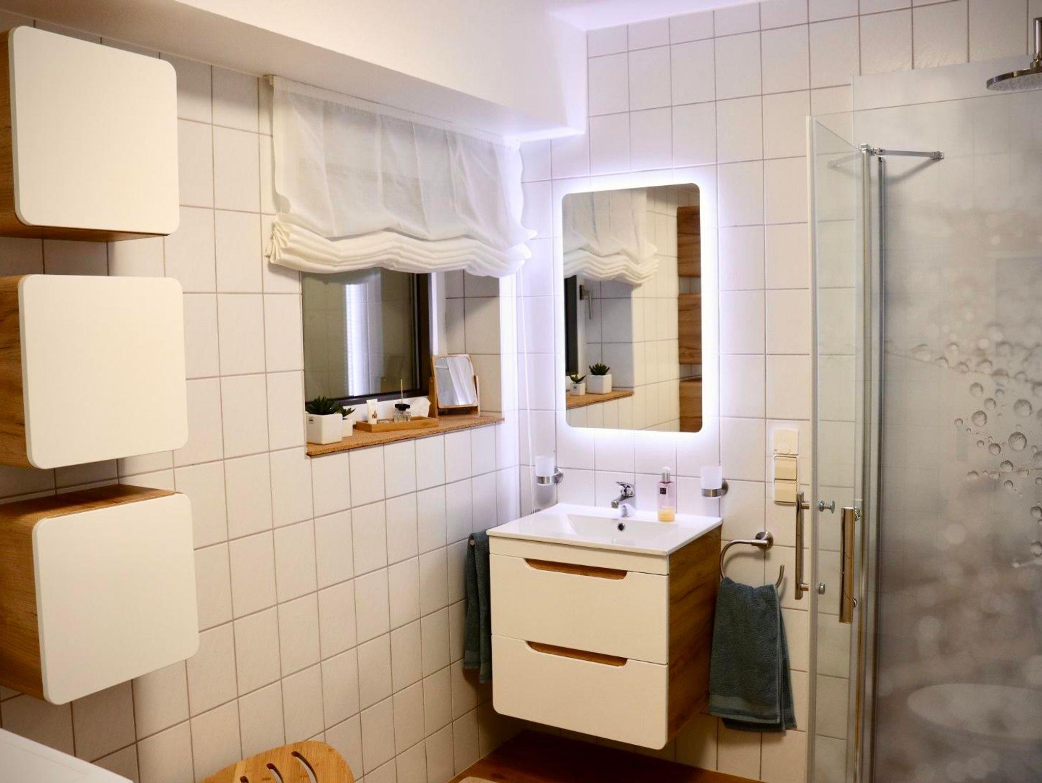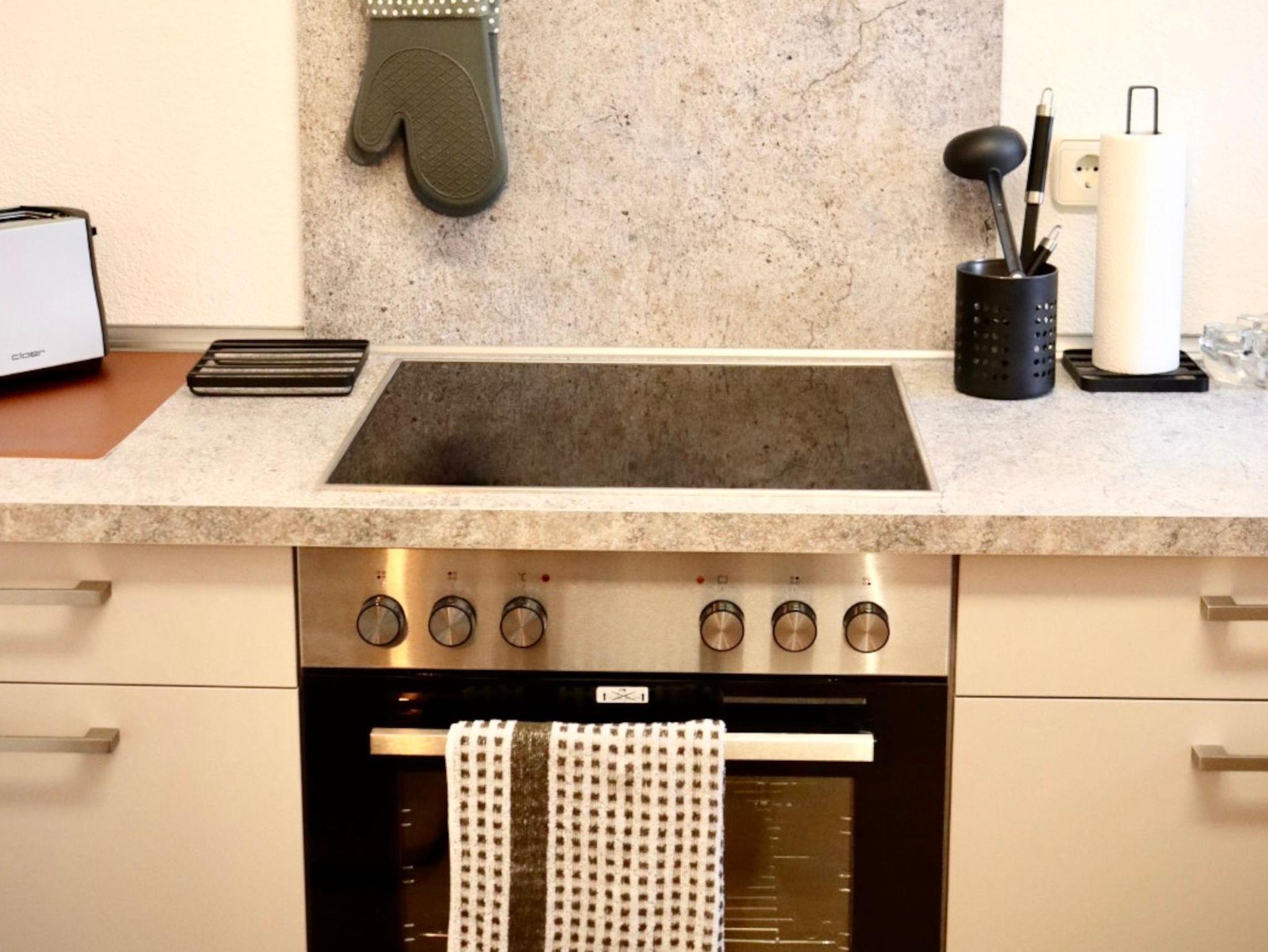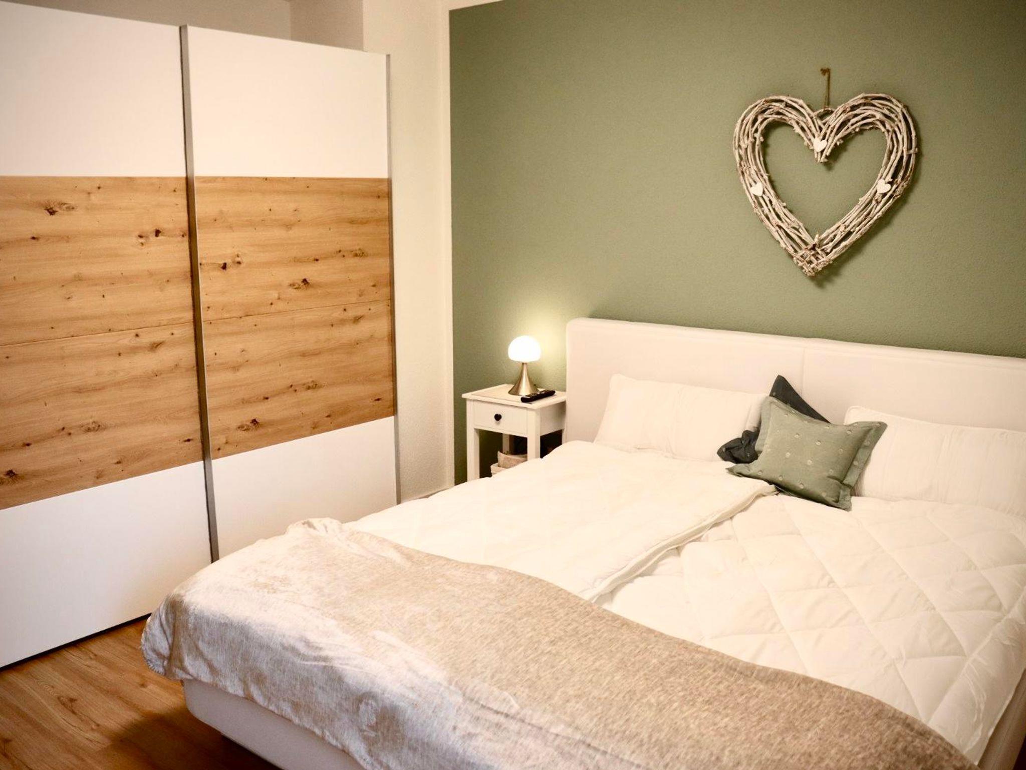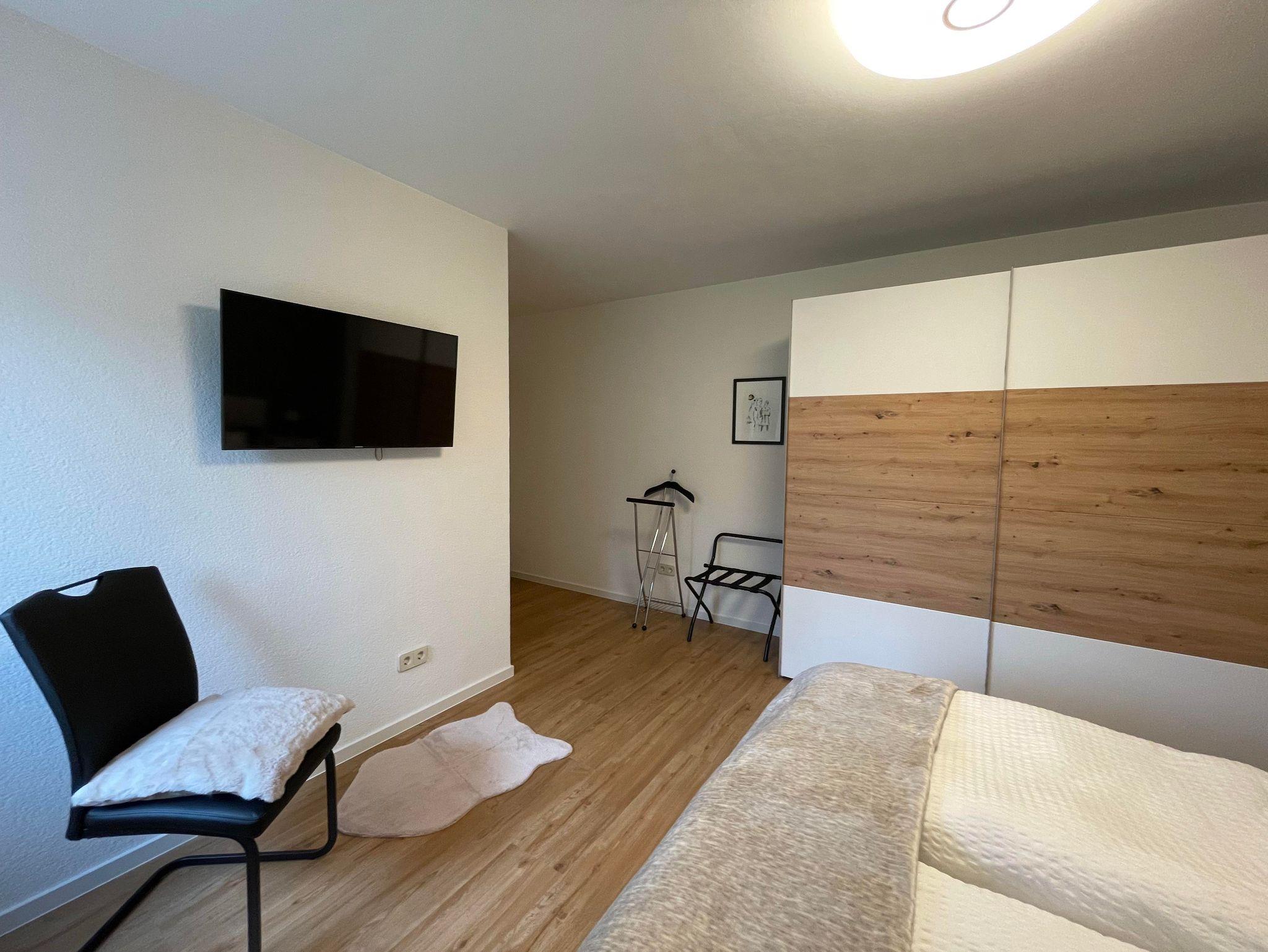 Die Nichtraucher Ferienwohnung bietet auf 68 Quadratmetern Platz für bis zu 2 Personen. Die helle und moderne Ferienwohnung besteht aus einem großen Wohnraum mit offener Küche und Essplatz. Der Wohnzimmerteil ist ausgestattet mit einer großen und gemütlichen Couch, die schnell zum Schlafpatz für eine weitere Person auszuziehen ist. Zusätzliche Decke, Kissen, Bezüge je nach Belegung vorhanden. Eine Schrankwand einhält neben einem Smart-TV eine umfangreiche Büchersammlung und Spiele. Der Essbereich ist mit einem ausziehbaren Tisch und entsprechender Anzahl von Stühlen ausgestattet. Ein Kinderhochstuhl ist zustellbar. In der L-förmigen Küchenzeile sind alle erforderlichen Elektrogeräte zum Kochen und Backen vorhanden: Cerankochfeld, Backofen, Dunstabzugshaube, Spülmaschine, Kühlschrank mit Gefrierfach. Kaffee kann mit einer Filter- oder Padmaschine bereitet werden. Wasserkocher, Toaster, Mikrowelle mit Grillfunktion vervollständigen die Ausstattung. Geschirr, Besteck, Gläser, Töpfe und sonstige Küchenutensilien sind in ausreichender Menge vorhanden. Basisgewürze, Essig, Öl. Ausziehbarer Mülleimer mit Mülltrennung, Spülmittel, Spülmaschinentabs, Spülbürste, Spüllappen, Geschirrtücher usw. sind ebenso wie Handfeger und kabelloser Staubsauger vorhanden. Für die Reinigung zwischendurch steht ein Wischmop-Set bereit. Im Schlafzimmer lädt ein gemütliches Doppelbett 1,80m mit durchgehender Matratze und Topper zum erholsamen Schlaf ein. Duo-Bettdecken, die sich der Jahreszeit anpassen lassen, je zwei Kopfkissen 80/80 bzw. 40/40cm. Betten sind bezogen, Wolldecken und waschbare Vorleger vorh. Beidseits des Bettes gibt es eine Ablage mit Leselampe. Der Schiebetüren-Schrank ist 1,80m breit und ist mit Kleider- und Hosenbügeln ebenso mit zwei Bademänteln bestückt. Ein Schranktresor ist zur Aufbewahrung von Wertgegenständen eingebaut. Kofferablage, Kleiderständer, Ganzkörperspiegel vervollständigen die Ausstattung. An der Wand gegenüber dem Bett ist ein weiteres Smart-TV angebracht. Im Flur befindet sich eine Garderobe mit Schuhabstellwanne, Schuhlöffel, Spiegel und Sitz-möglichkeit. Das Bad ist ausgestattet mit Toilette, flacher Dusche, die eine Glasabtrennung hat, ein Waschtisch mit Schubladen, beleuchteter Spiegel, kleine Wandschränke für Utensilien, Kosmetikeimer, Fön, Vergrößerungsspiegel. Hand- und Duschtücher liegen bereit. Für die Wäsche zwischendurch stehen Waschmaschine und Wäschetrockner zur Verfügung. Waschmittel, Flüssigseife, Toilettenpapier incl. Alle Räume haben neue Fenster mit Rollläden und sind mit einem pflegeleichten Holz-Designbelag auf Fußbodenheizung versehen. Die Wände sind verputzt und hell gestrichen. Gardinen und stimmungsvolle Beleuchtung sorgen für behagliches Ambiente. Die Terrasse ist ca. 12qm groß und ist mit Tisch und Gartenstühlen bestückt. In einer Box sind Textilauflagen untergebracht. Auf der Rasenfläche sind Liegestühle aufgestellt. Ein Edelstahlgrill und Buchenholz stehen für einen Grillabend bereit. Ein Carport neben dem Haus ist für die Nutzer der Ferienwohnung reserviert. Fahrräder können in einem von außen begehbaren Abstellraum sicher untergestellt werden. Der Zugang ist beleuchtet.