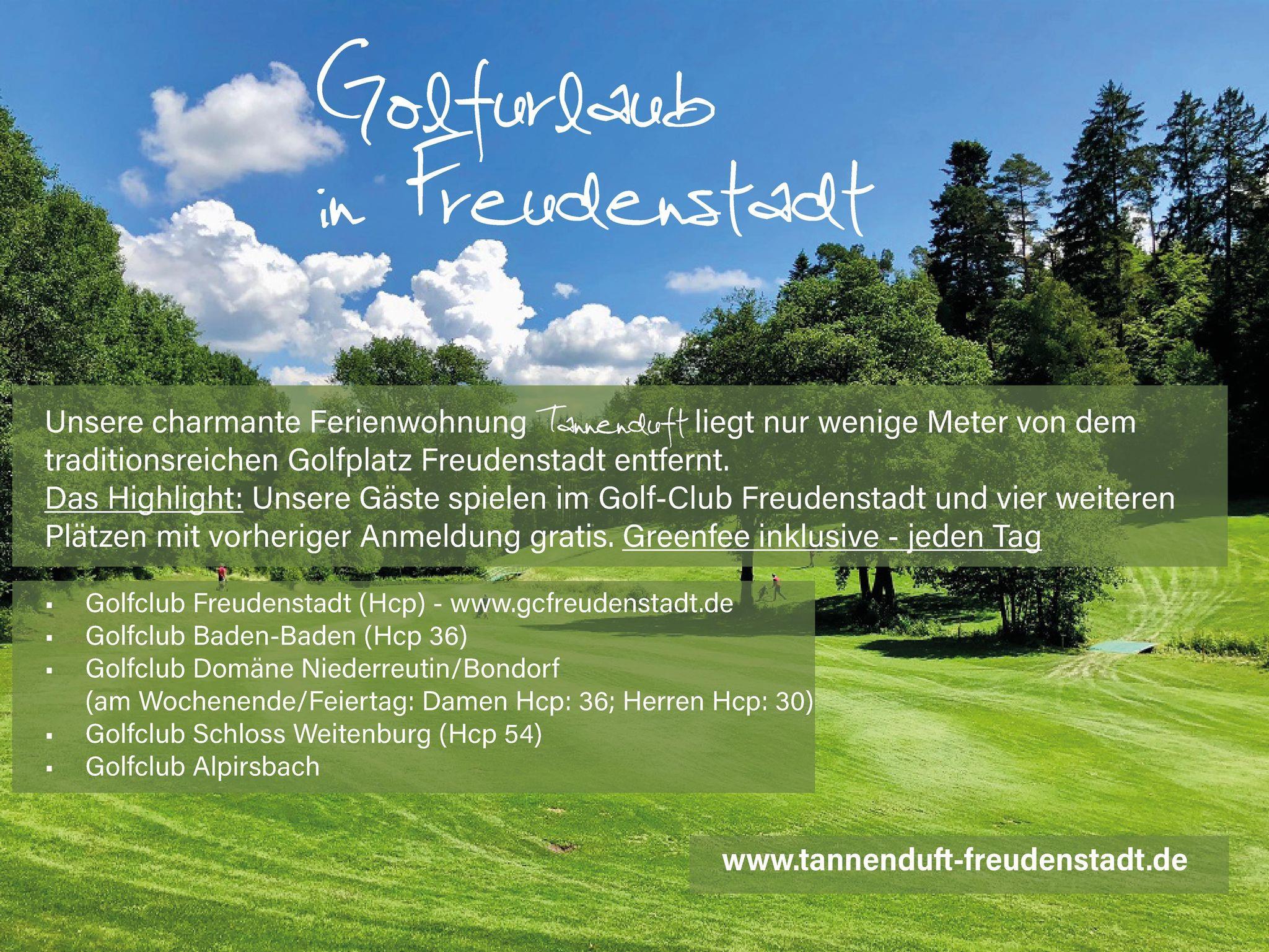 In direkter Nähe finden Sie den 18-Loch-Golfclub Freudenstadt (250 m), Tannenwälder zum Wandern oder Radfahren oder im Winter frisch gespurte Loipen und den Skilift Stokinger. Den größten Marktplatz Deutschlands erreichen Sie in wenigen Minuten Fußweg.
