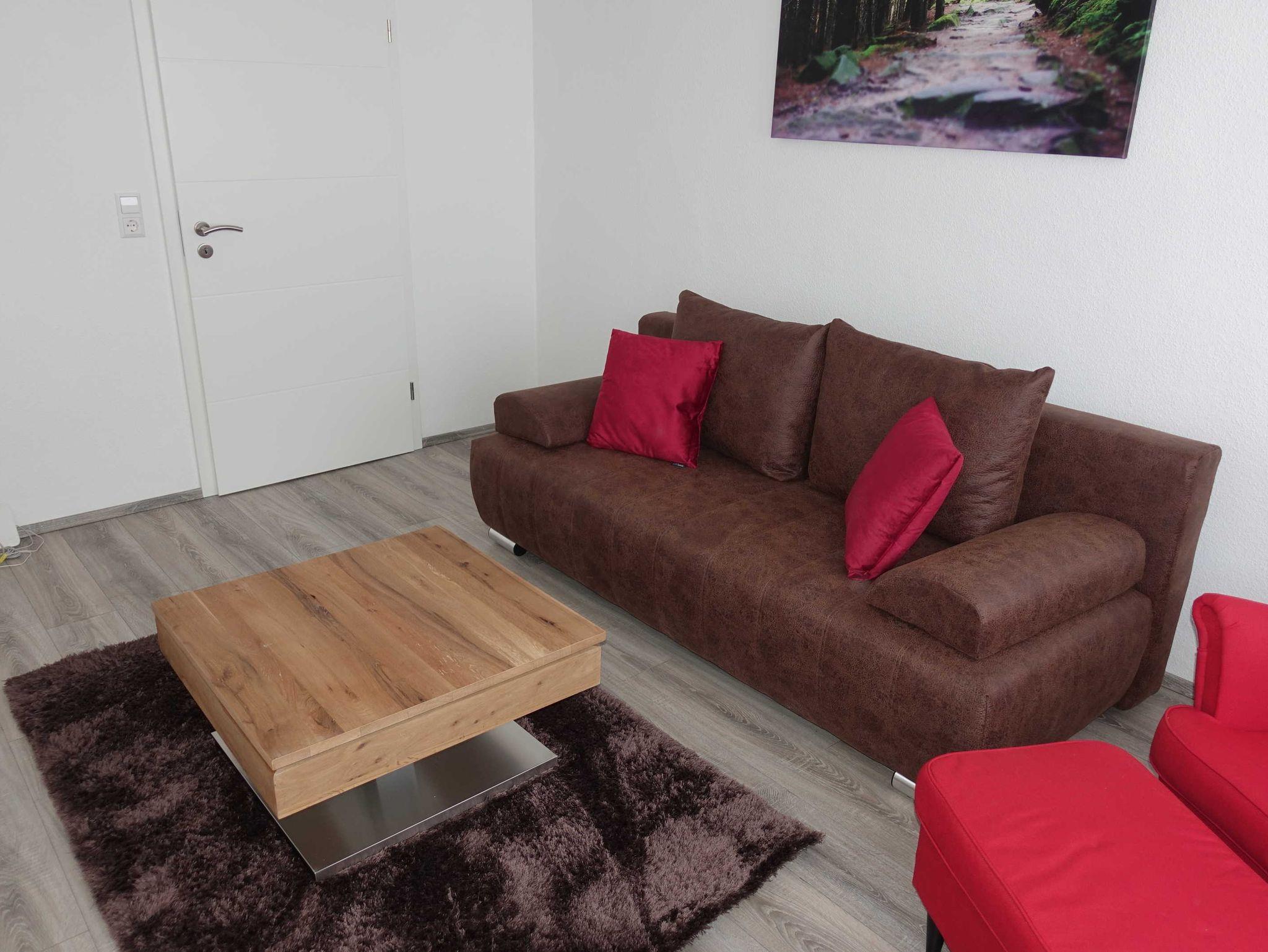 Der Wohnbereich verfügt über ein Sofa, einen Ohrensessel sowie einen Flachbildfernseher. Sie genießen die Programmvielfalt von MagentaTV der Deutschen Telekom.