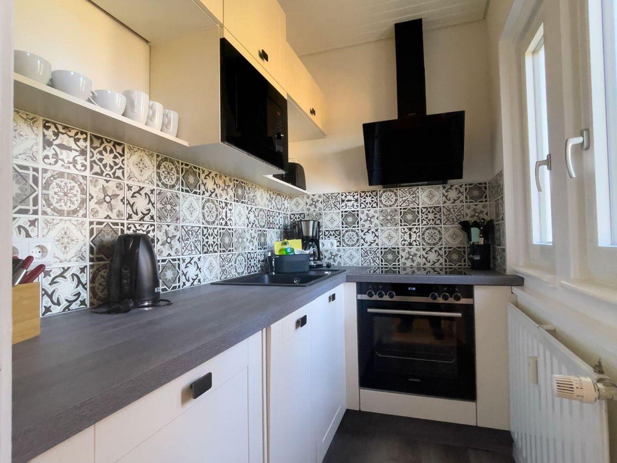 Haushalt : Geschirrspüler, E-Herd mit Cerankochfeld, Mikrowelle, Kühlschrank mit Gefrierfach, Wasserkocher, Toaster, Kaffeemaschine (Filter), Eierkocher, Rührgerät, Föhn, Kosmetikspiegel.